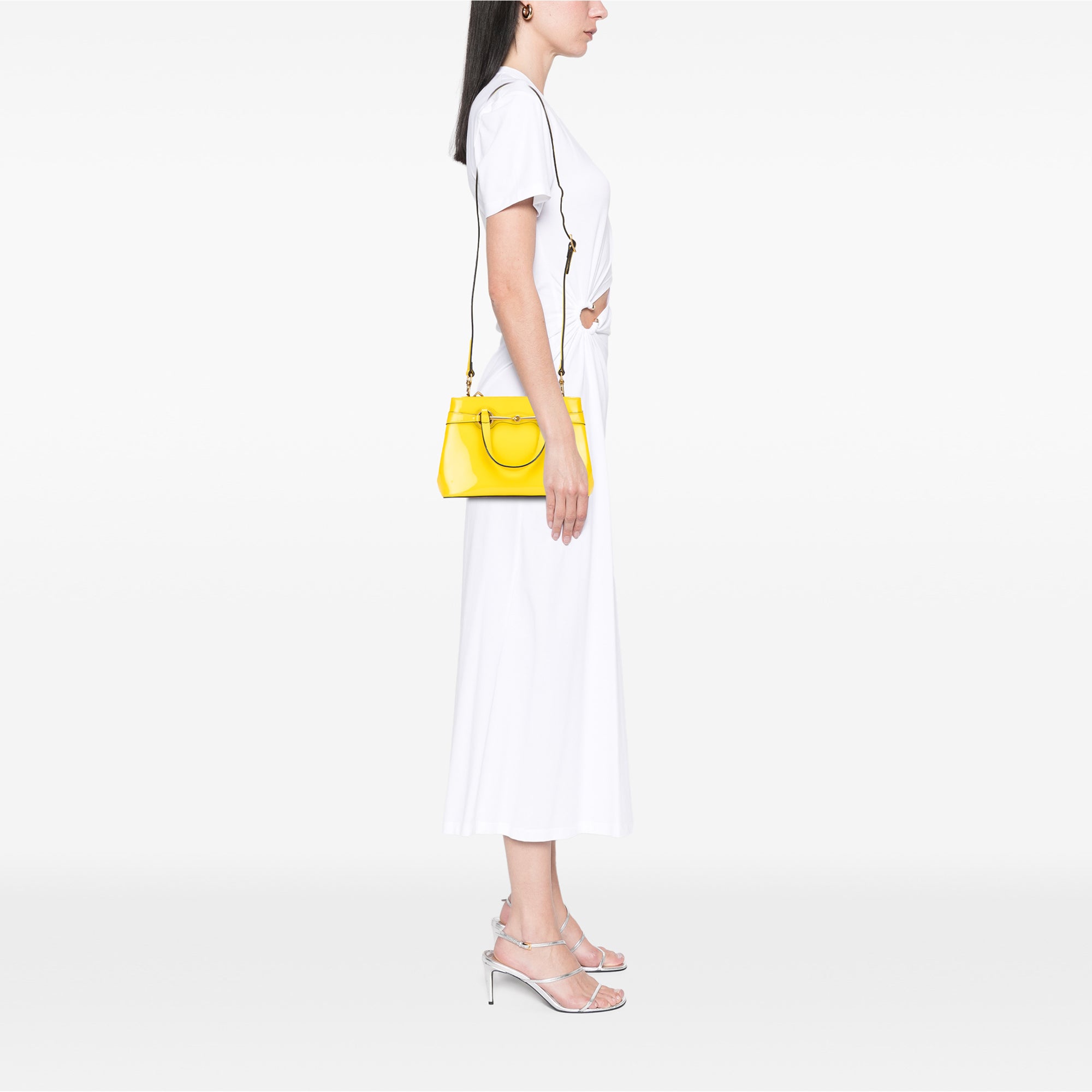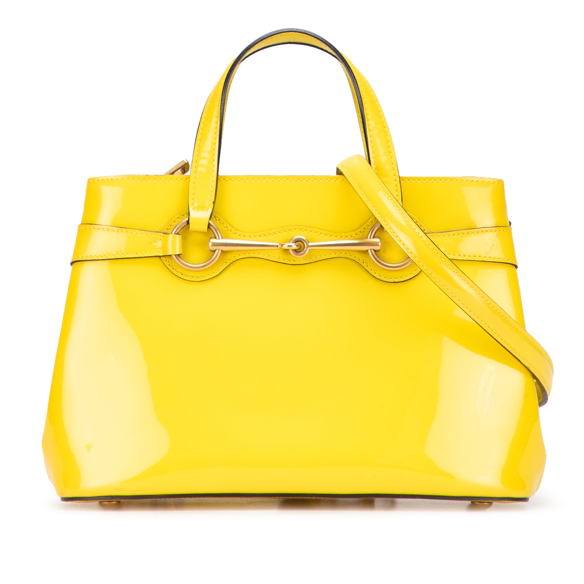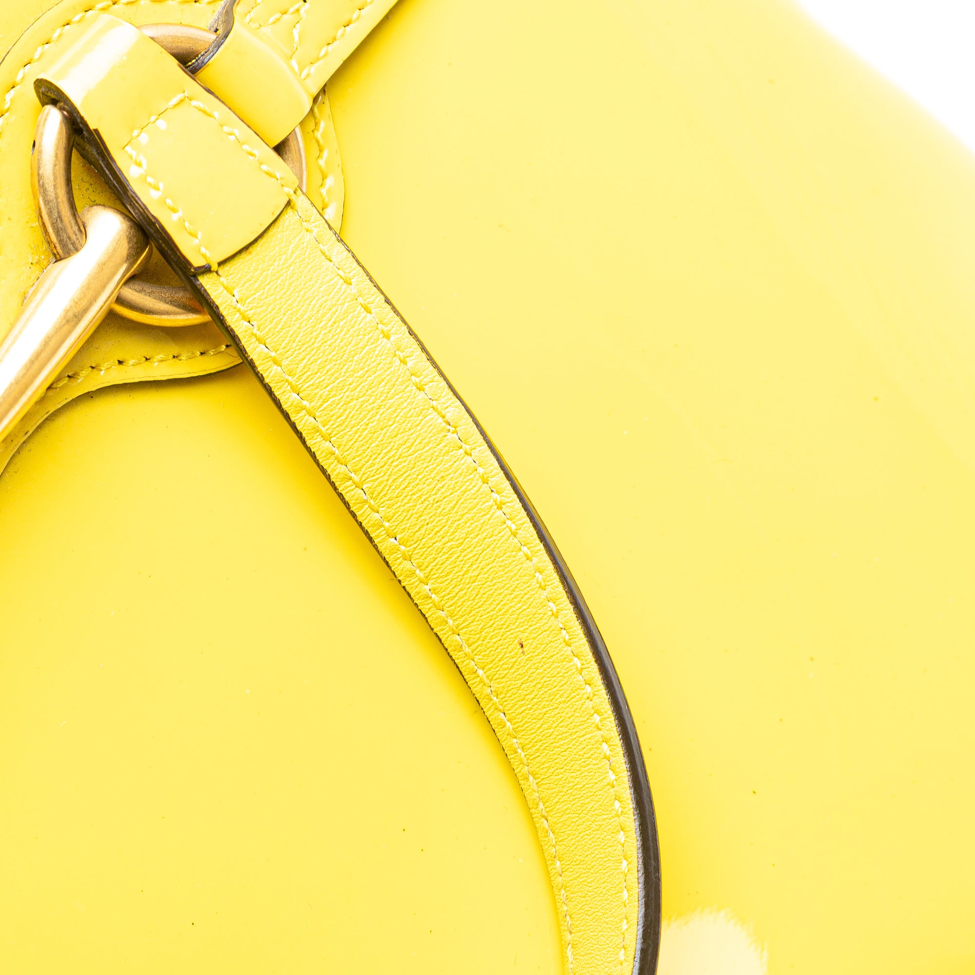 This satchel features a patent leather body, flat handles, a detachable flat leather strap, top zip closures, and interior slip pockets. Retail Price: 400.00