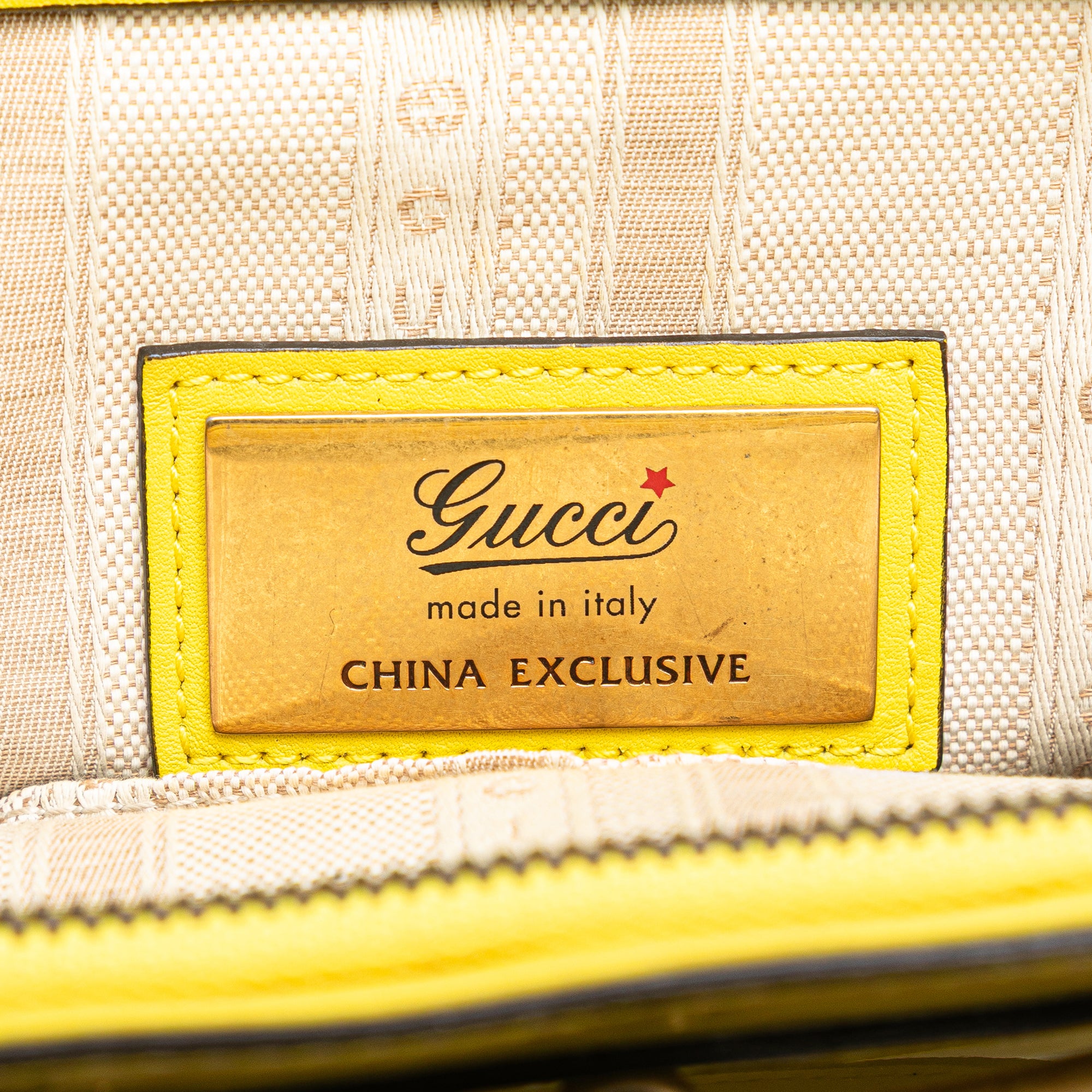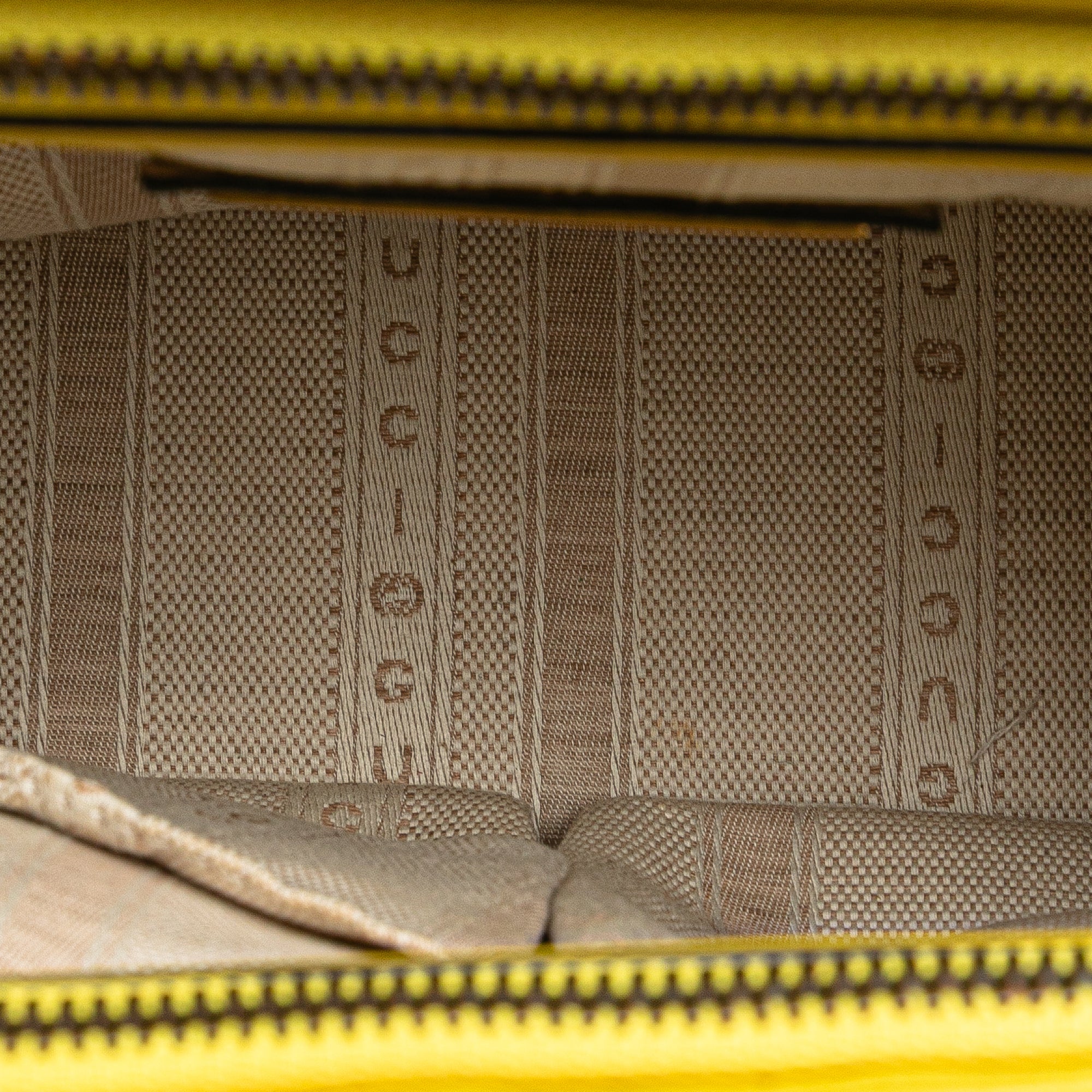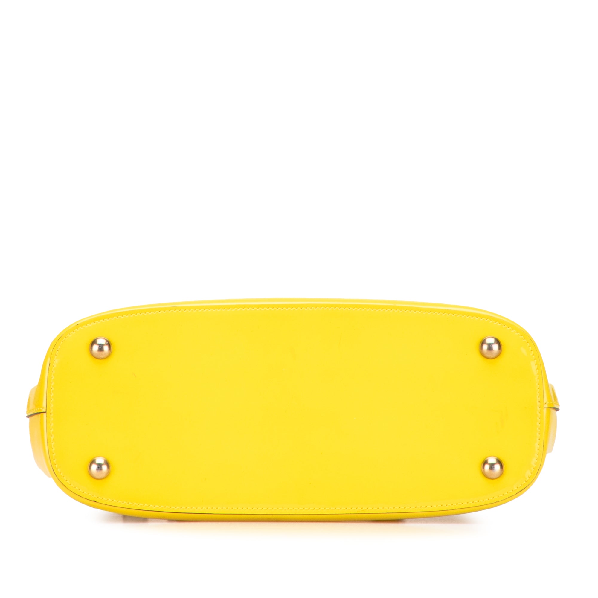 This satchel features a patent leather body, flat handles, a detachable flat leather strap, top zip closures, and interior slip pockets. Retail Price: 400.00