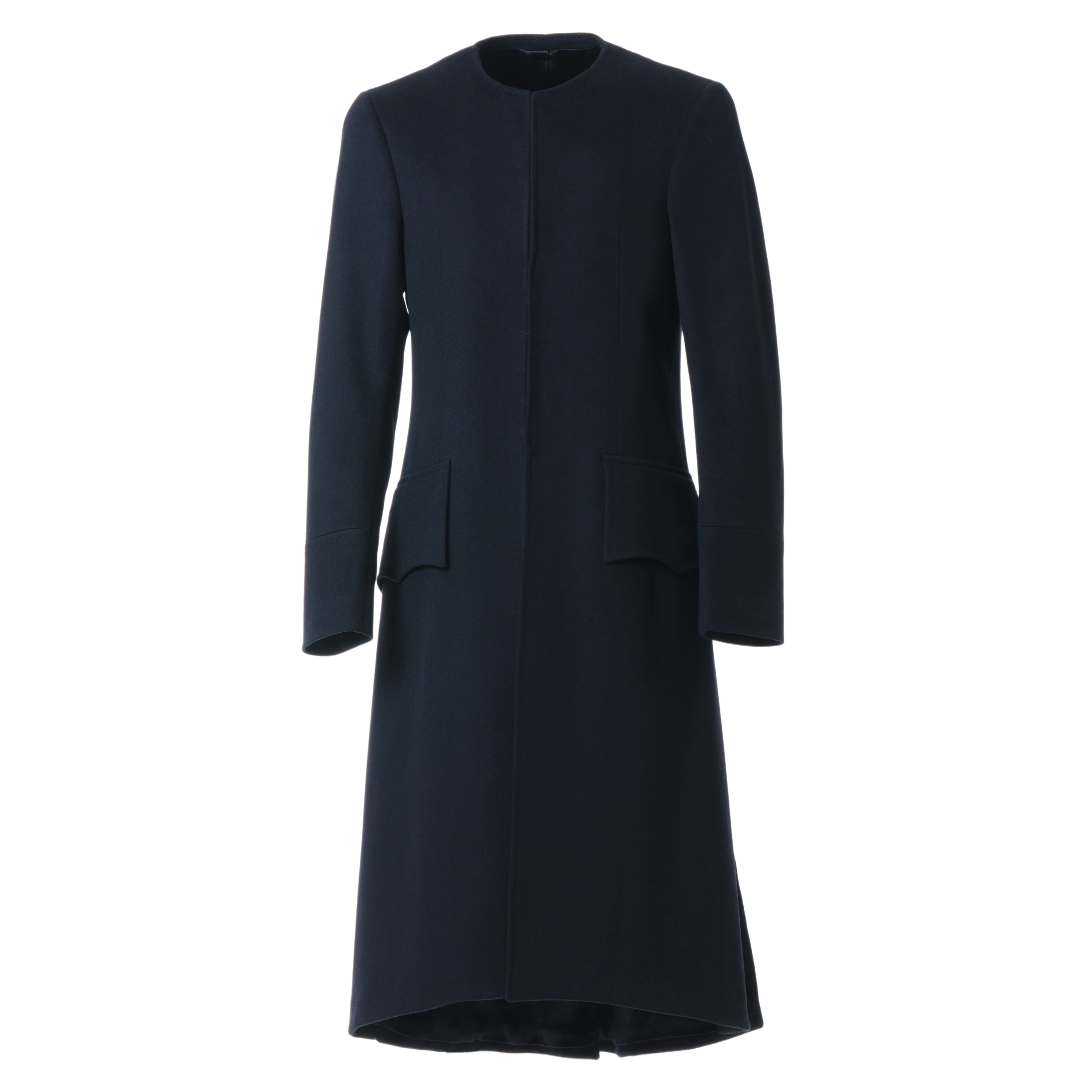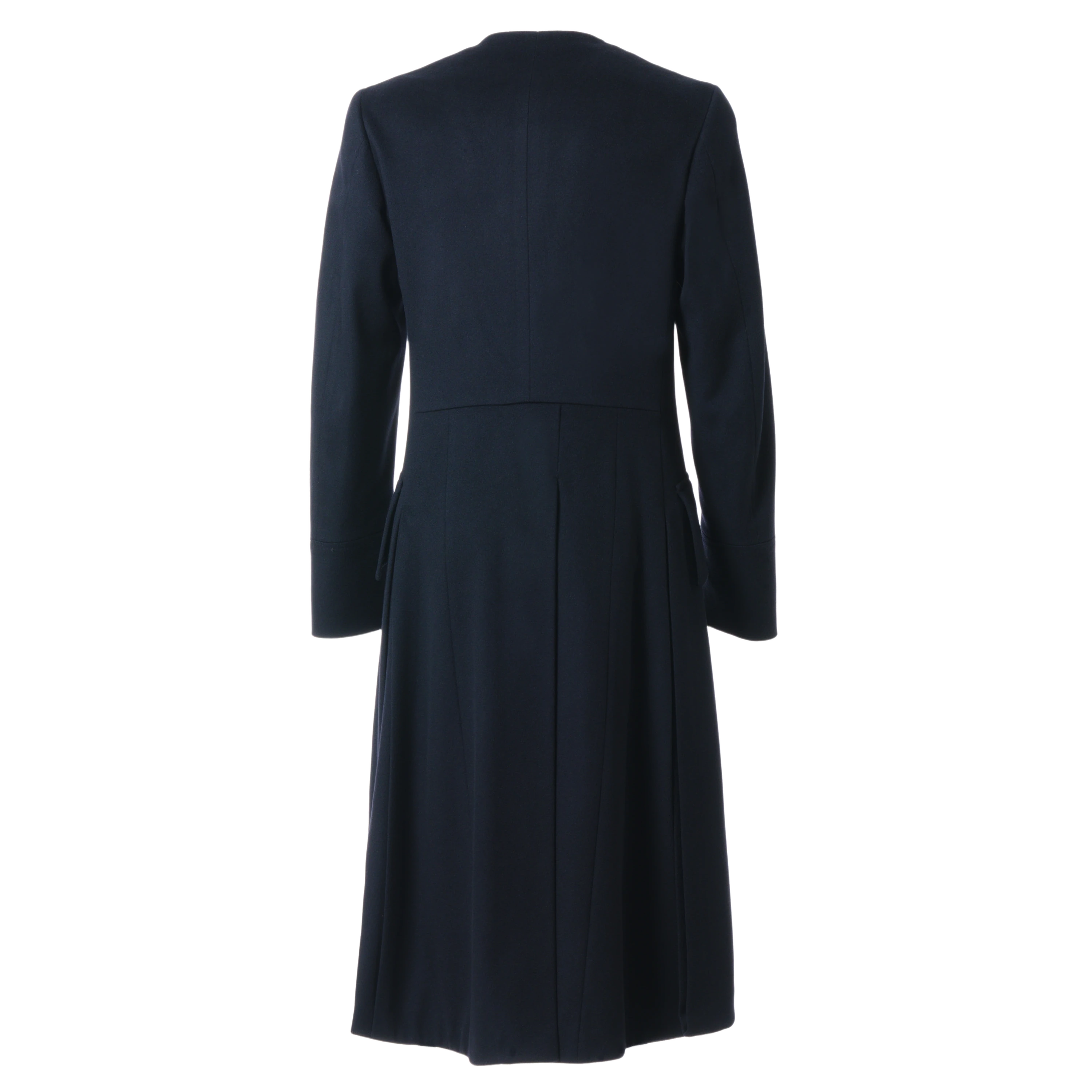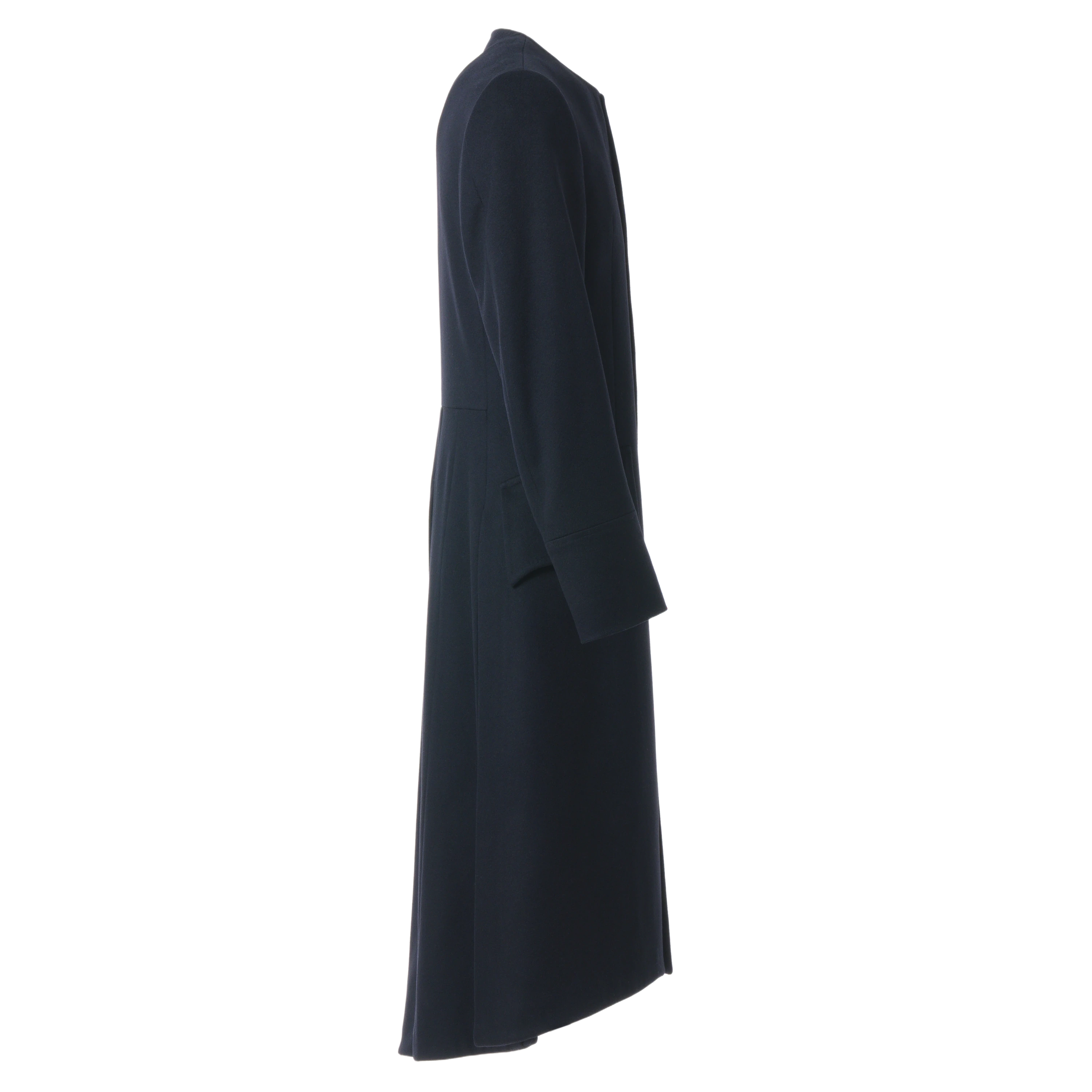 Gucci Autumn-Winter 2006 runway long coat in pure wool, crafted in deep midnight blue. The streamlined 46R silhouette drapes with refined structure, featuring clean lines, hidden fastening and sculpted flap pockets. Finished with a smooth satin lining, it’s a distinguished piece from the runway archives, perfect for an elevated, timeless wardrobe.