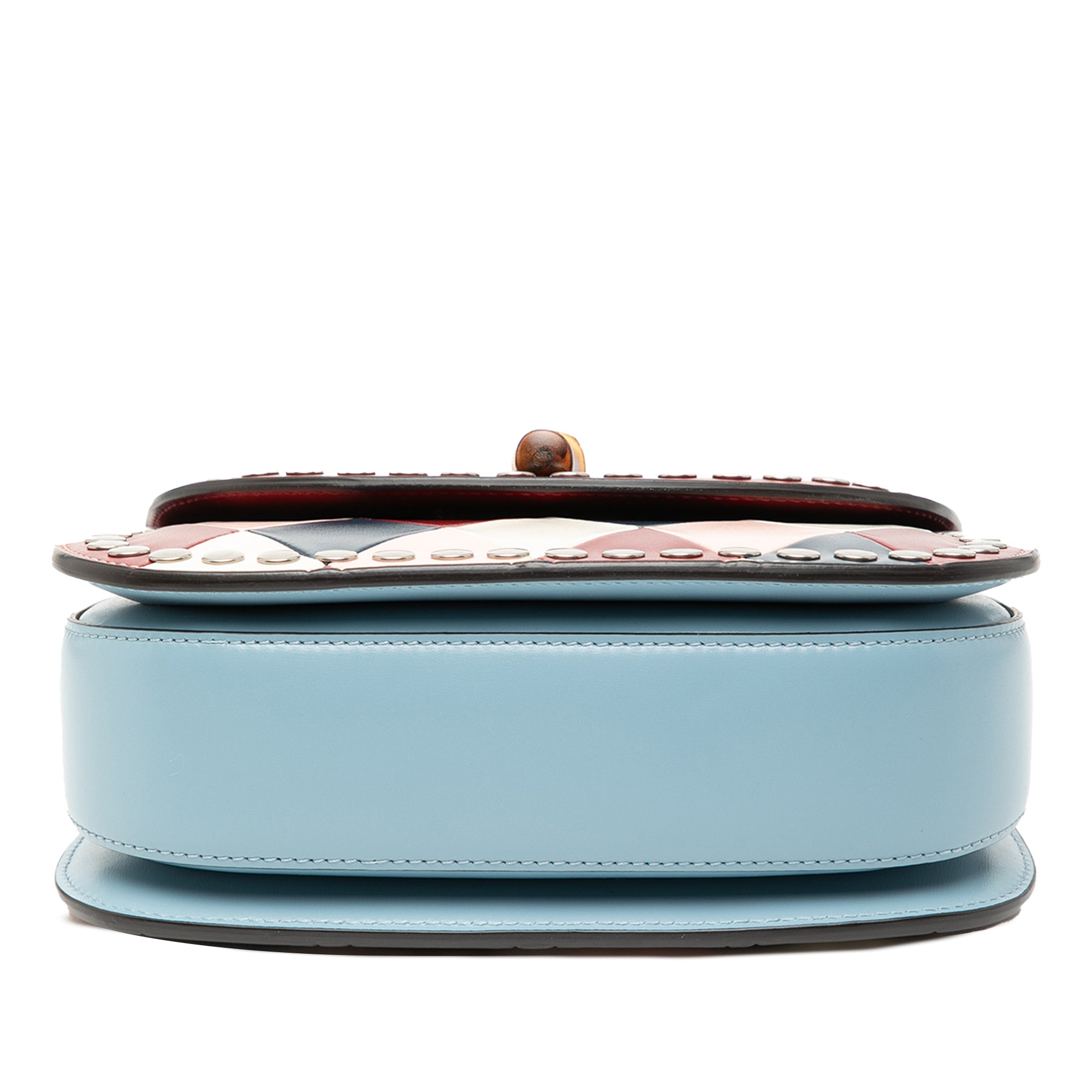 This satchel features a printed and studded leather body, a bamboo top handle, a detachable flat strap, a front flap with a bamboo twist lock closure, and interior zip and slip pockets. Inclusion: Dust bag. Retail Price: 4000.00