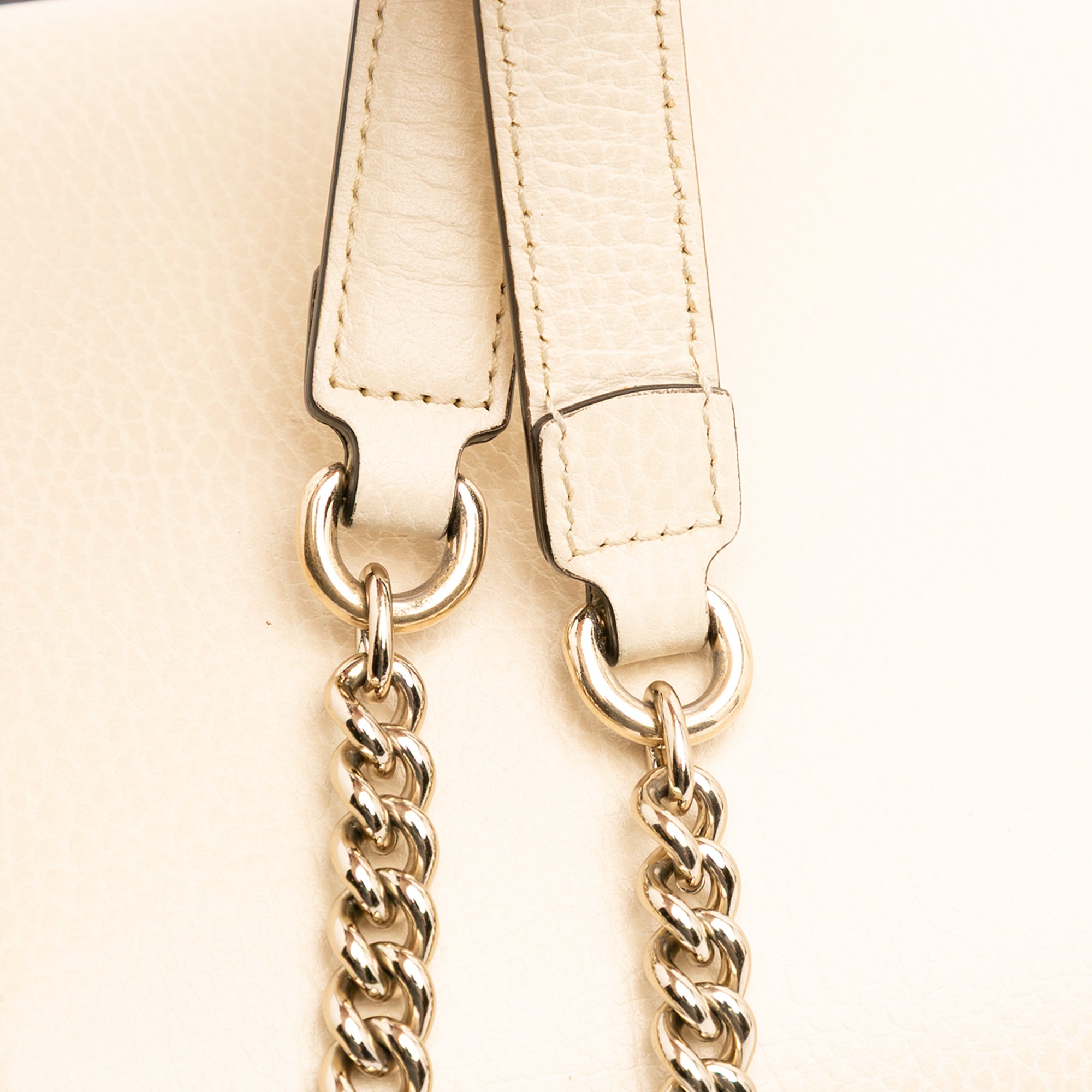 The Interlocking G crossbody bag features a leather body, a chain-link strap with a leather shoulder guard, a front flap with snap button closure, and interior zip and slip pockets. Retail Price: 1840.00