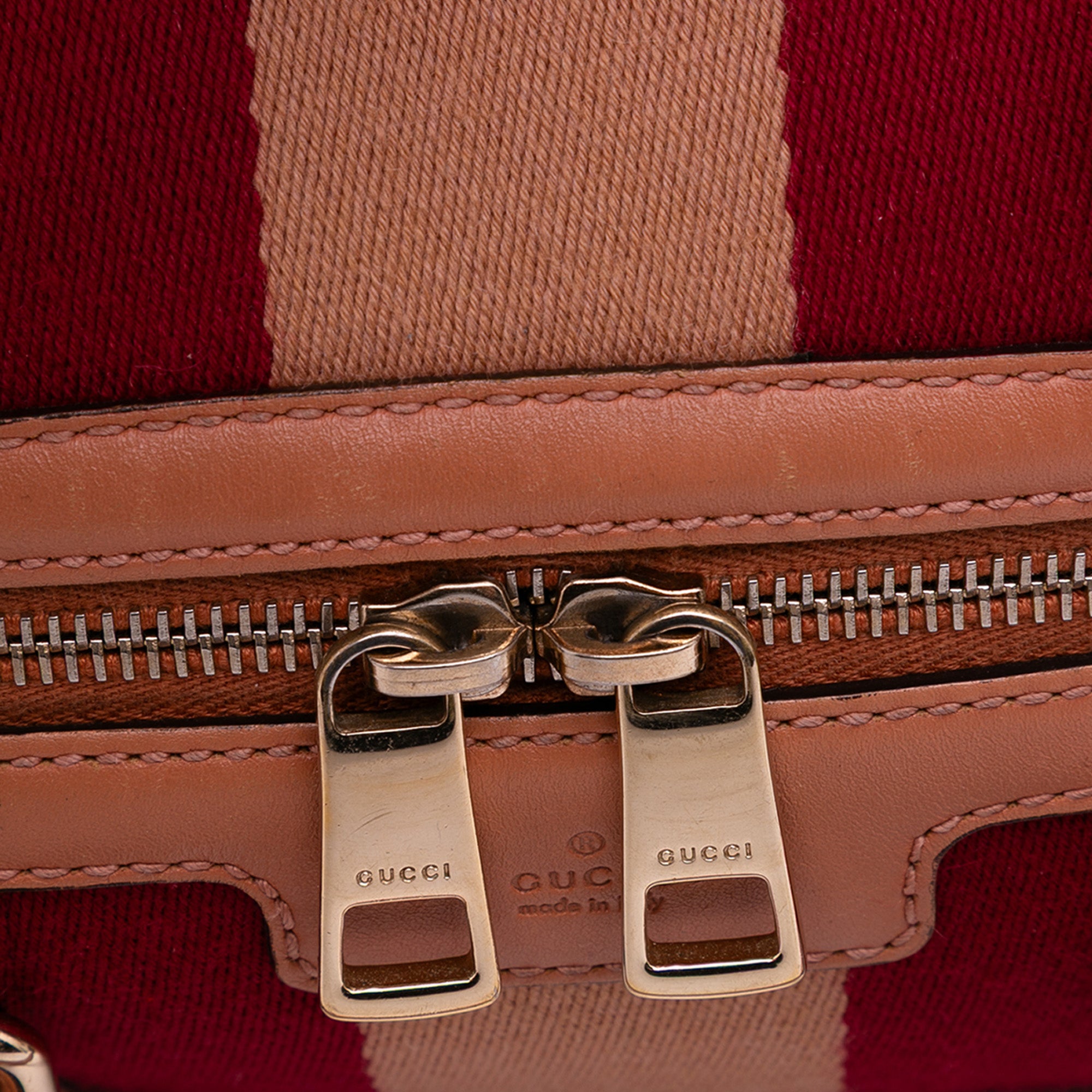 This satchel features a canvas body with leather trim and web detail, rolled leather handles, a detachable leather strap, a top zip closure, and interior zip and slip pockets. Retail Price: 1540.00