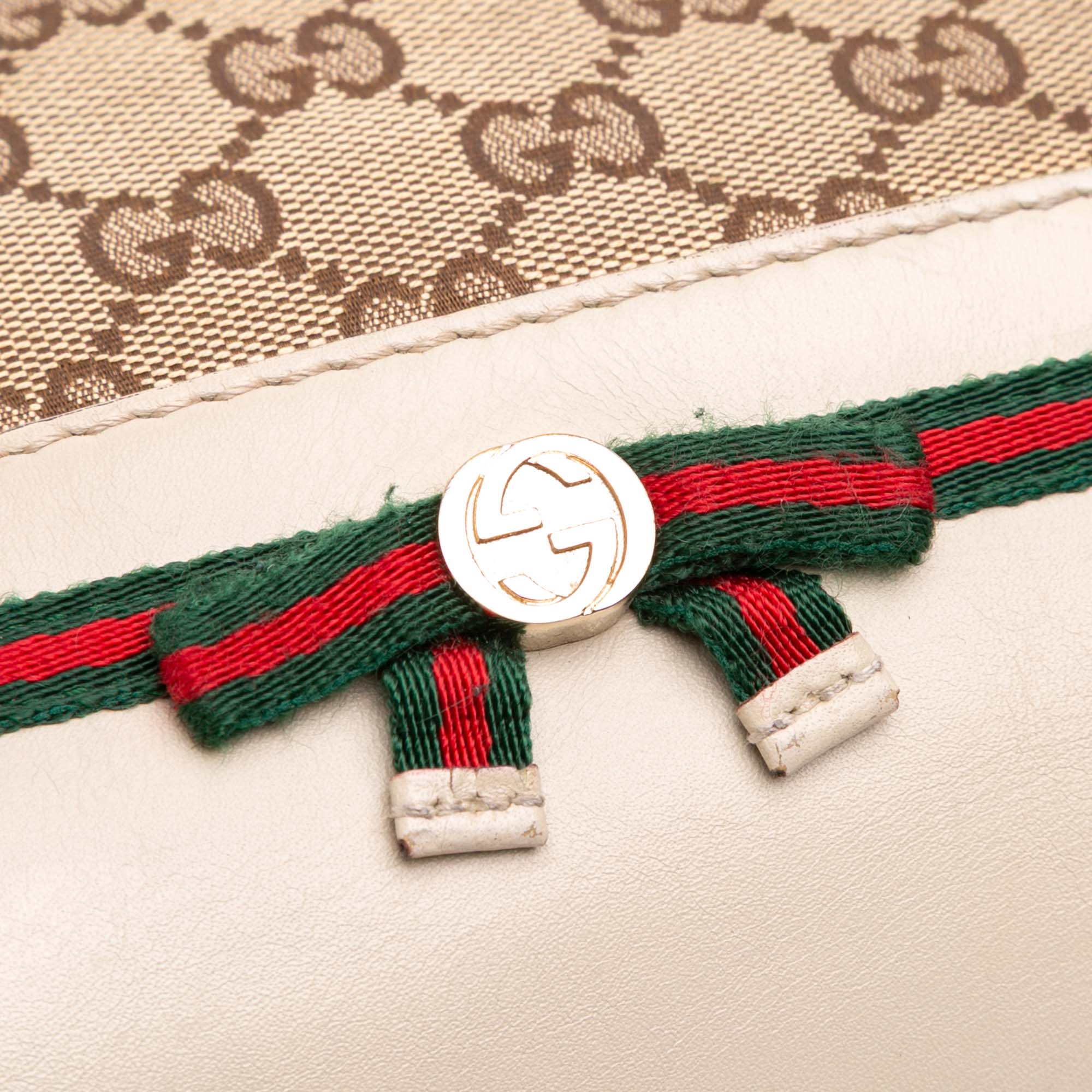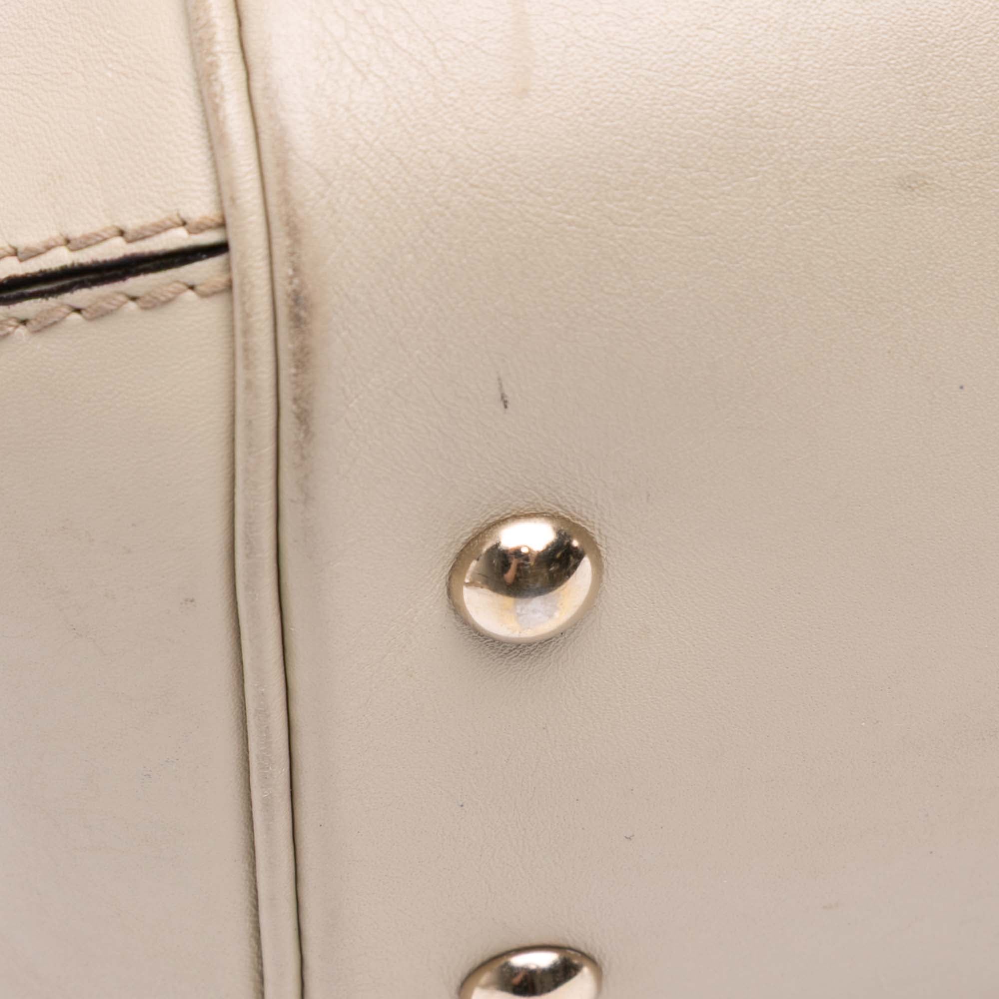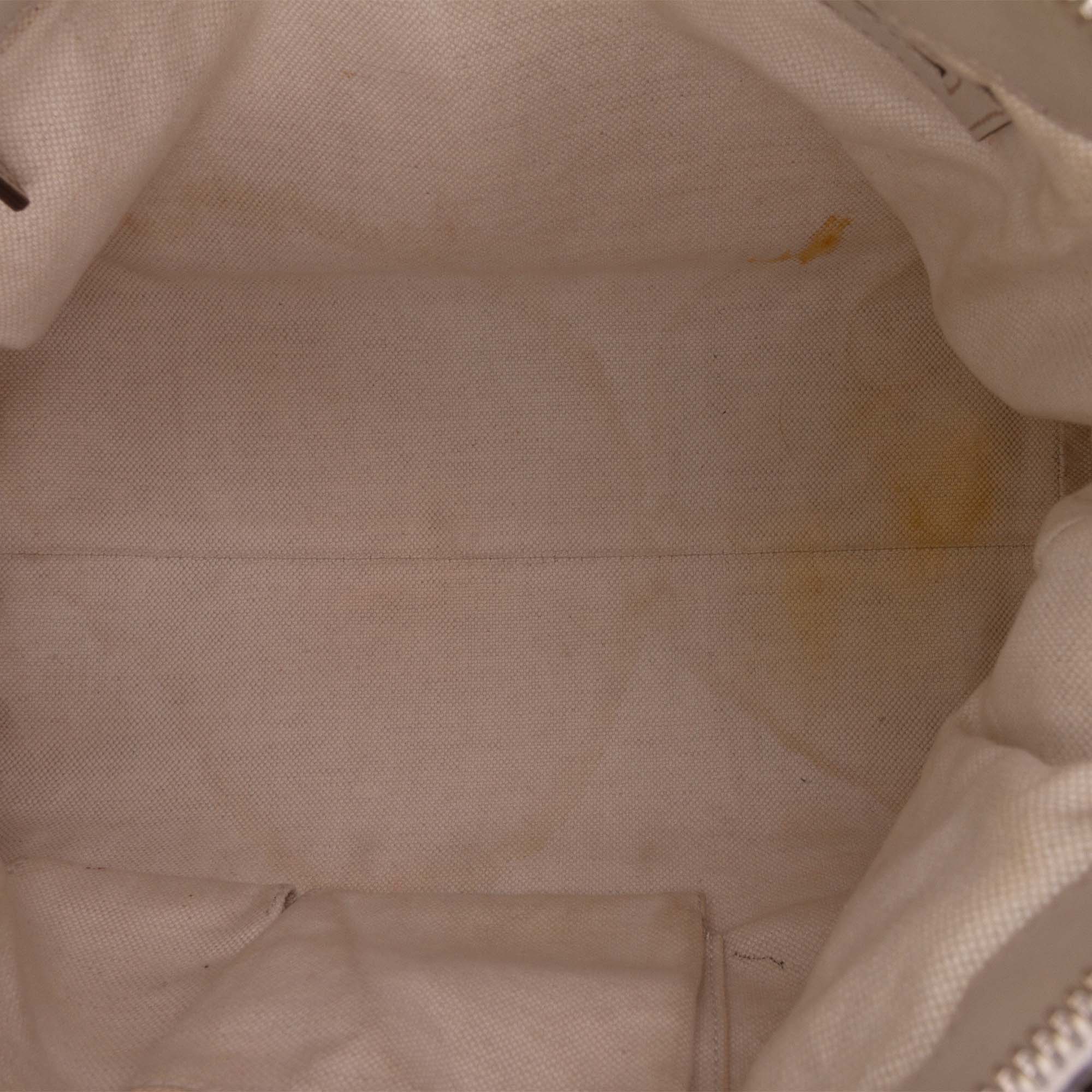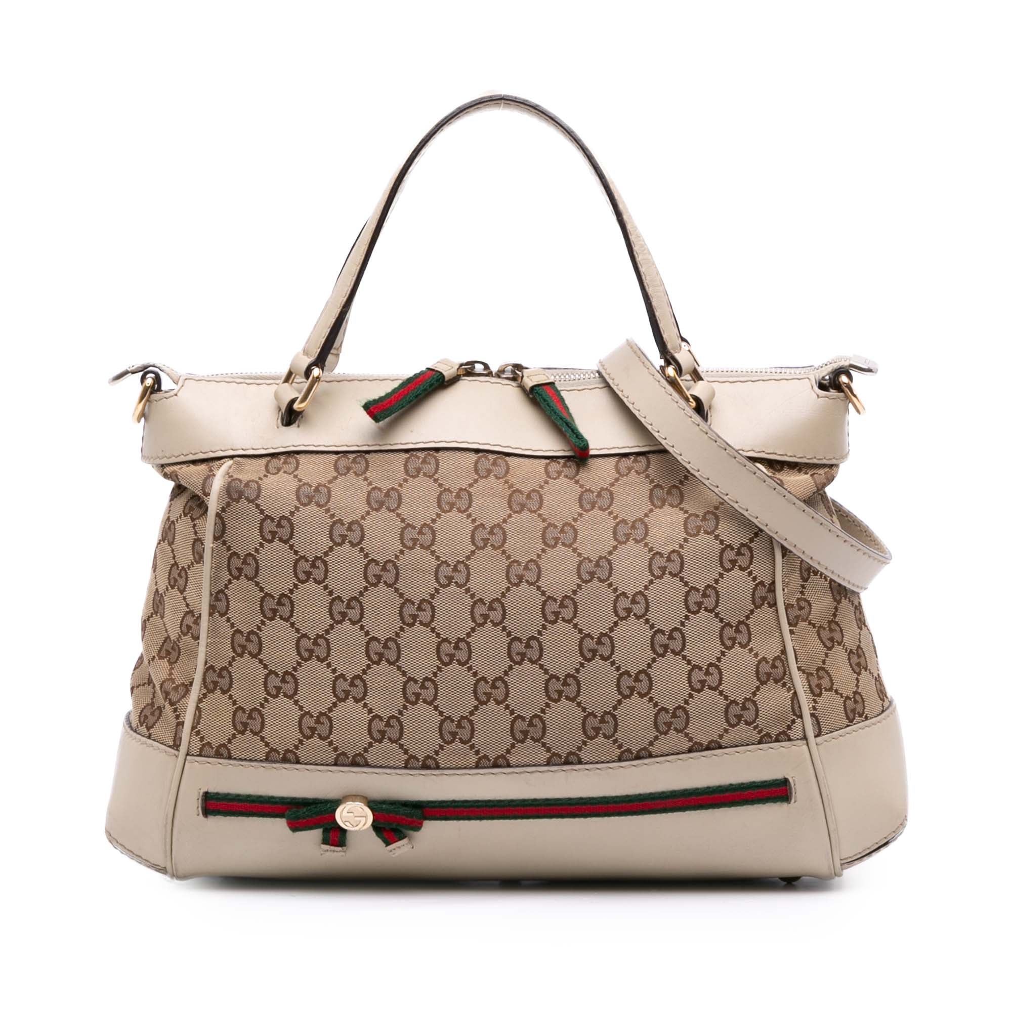 This satchel features a canvas body with leather trim, flat leather handles, a detachable flat leather strap, a top zip closure, and interior zip and slip pockets. Retail Price: 1470.00