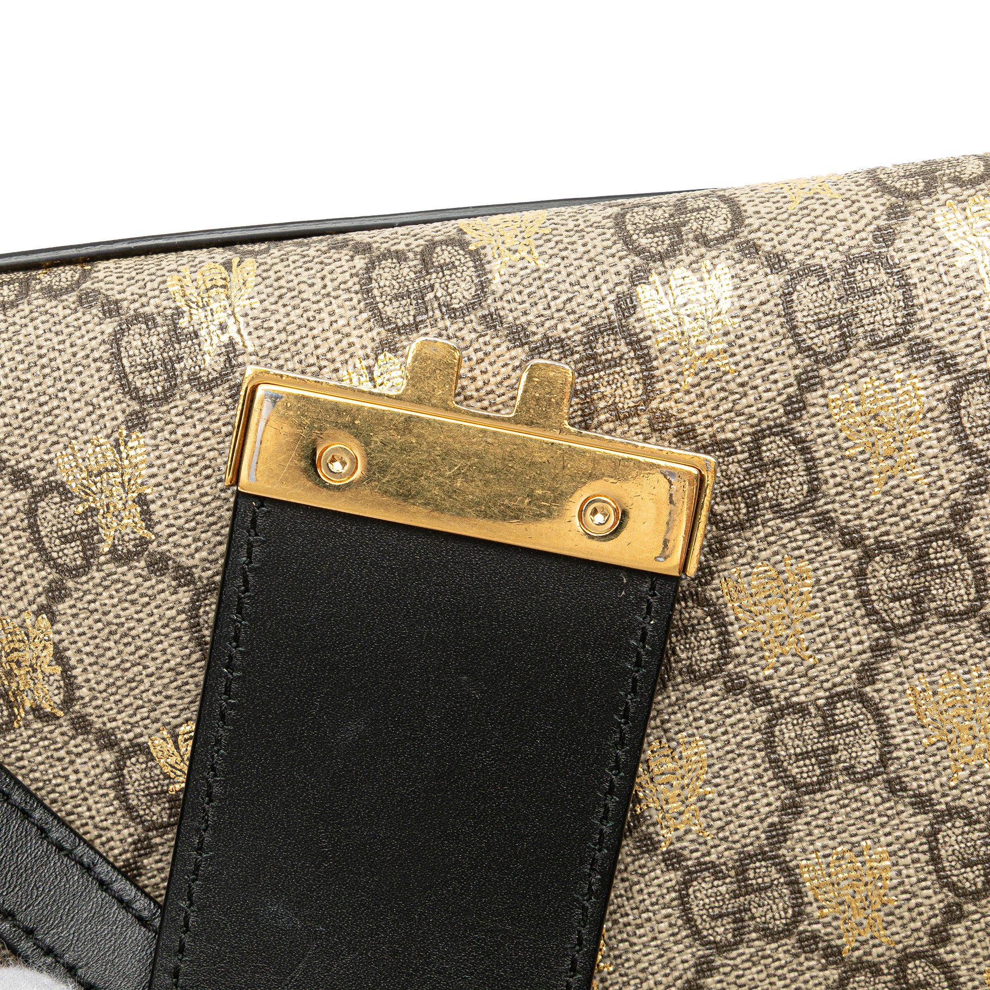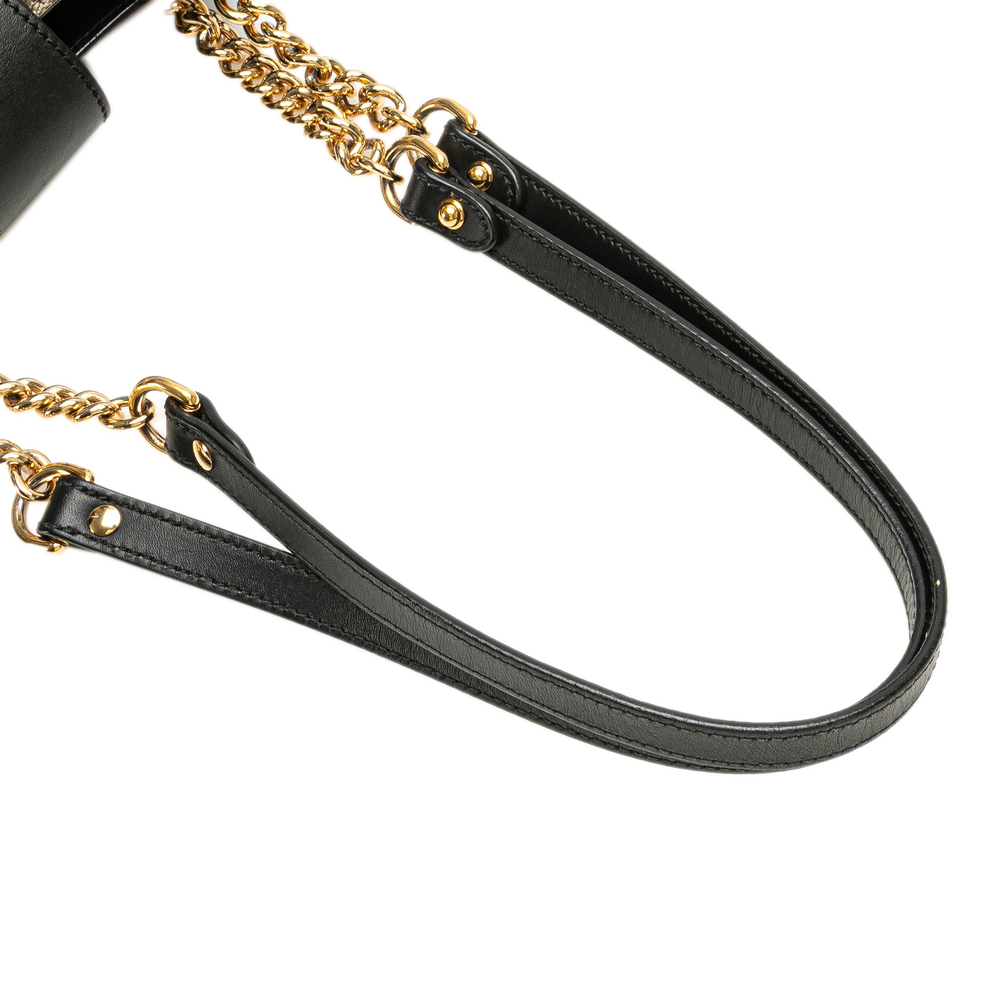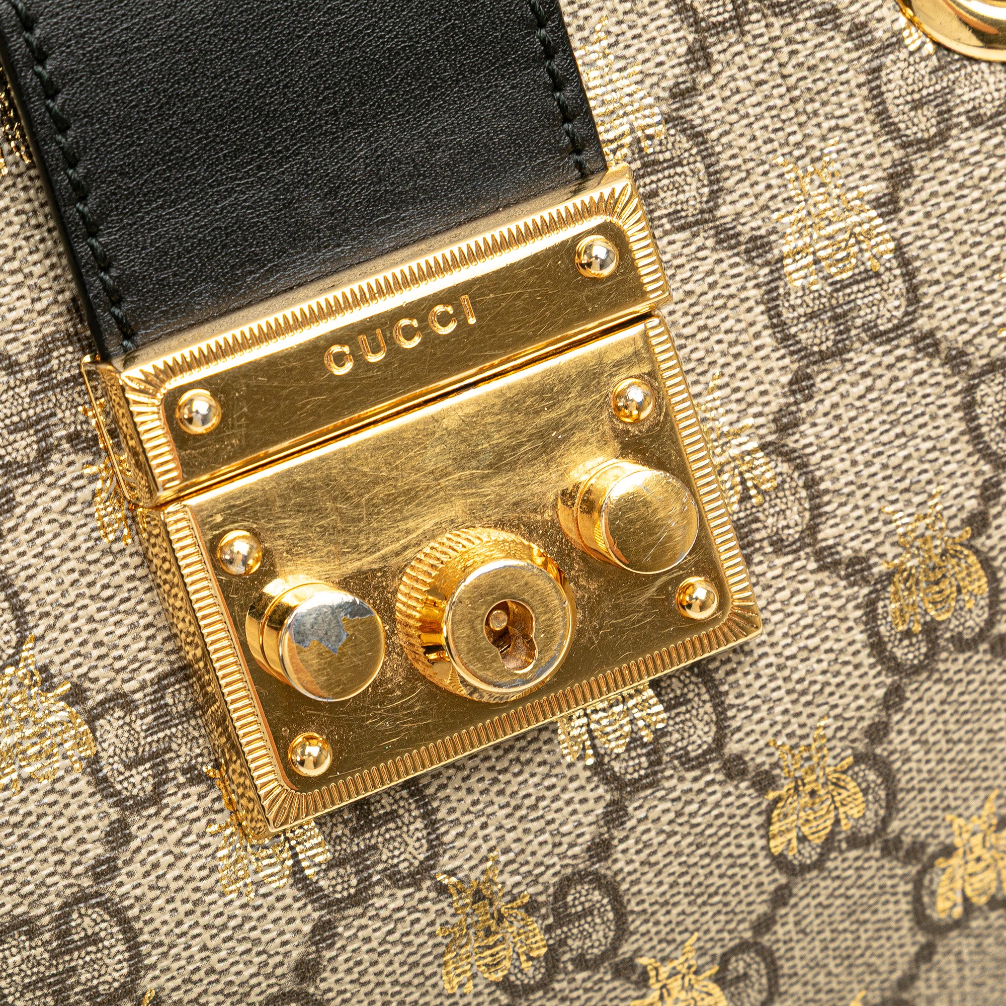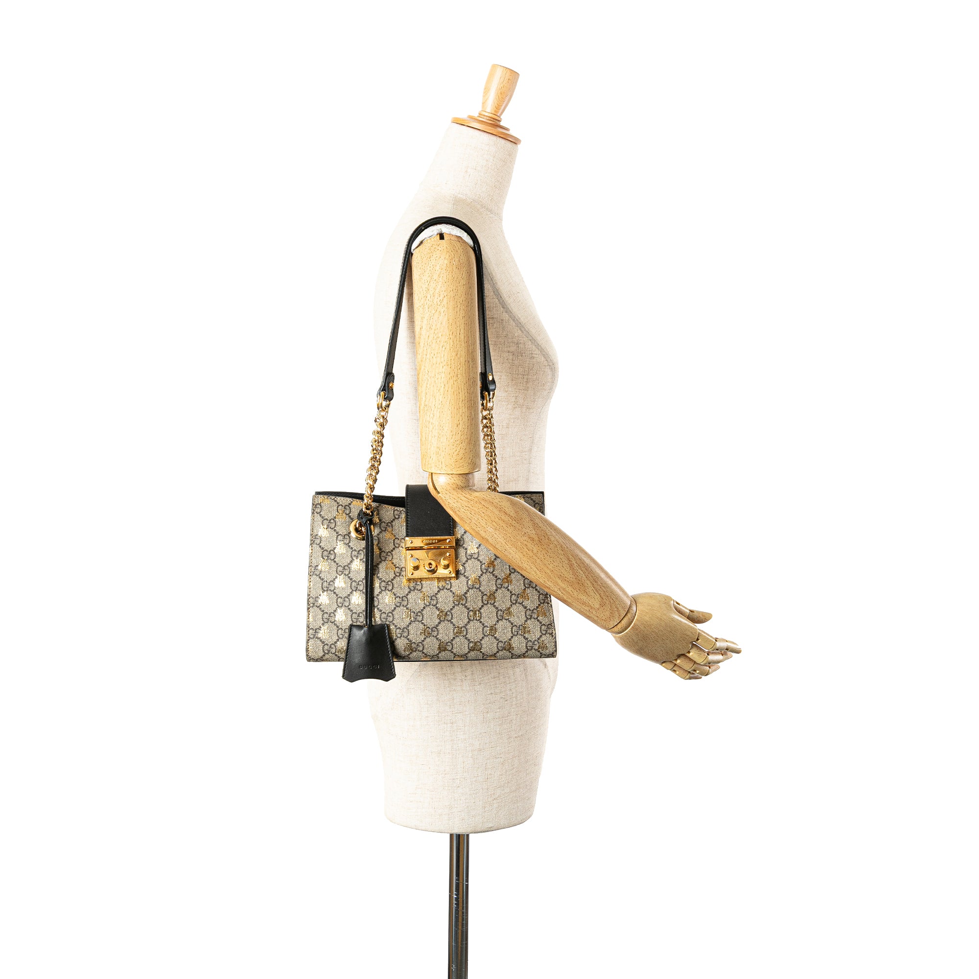 The Padlock tote bag features a printed coated canvas body with leather trim, dual flat leather and chain shoulder straps, an open top with a leather strap and push lock closure, and interior slip pockets. Retail Price: 1890.00