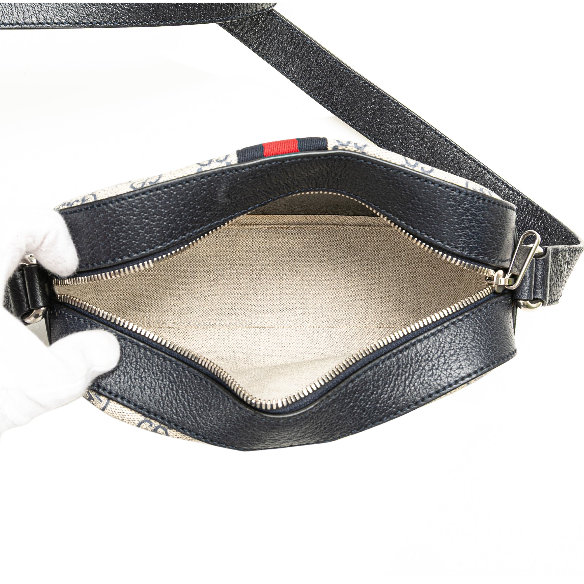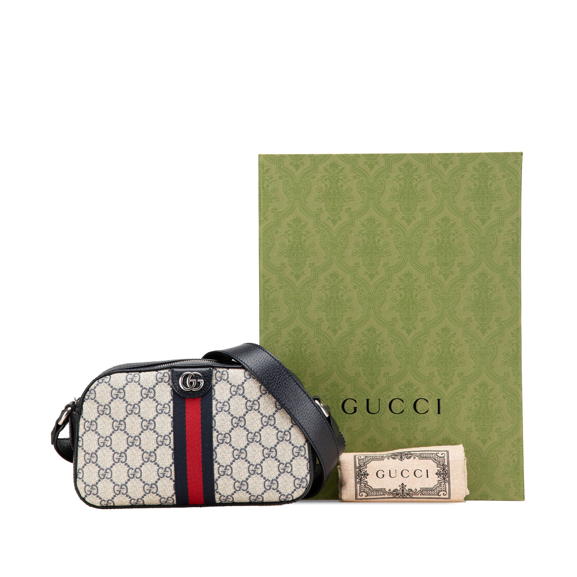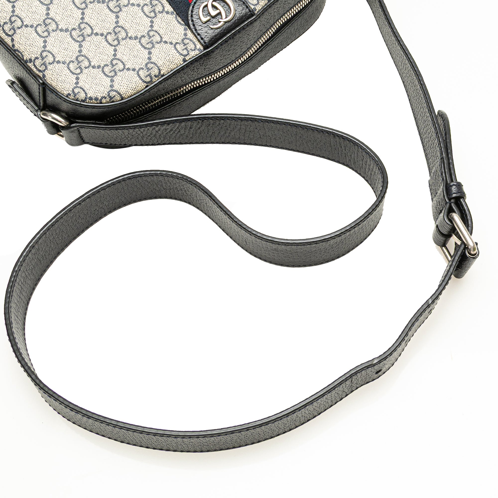The Ophidia crossbody bag features a coated canvas body with leather trim, a flat leather strap, a top zip closure, and an interior slip pocket. Inclusion: Dust bag, box. Retail Price: 1850.00