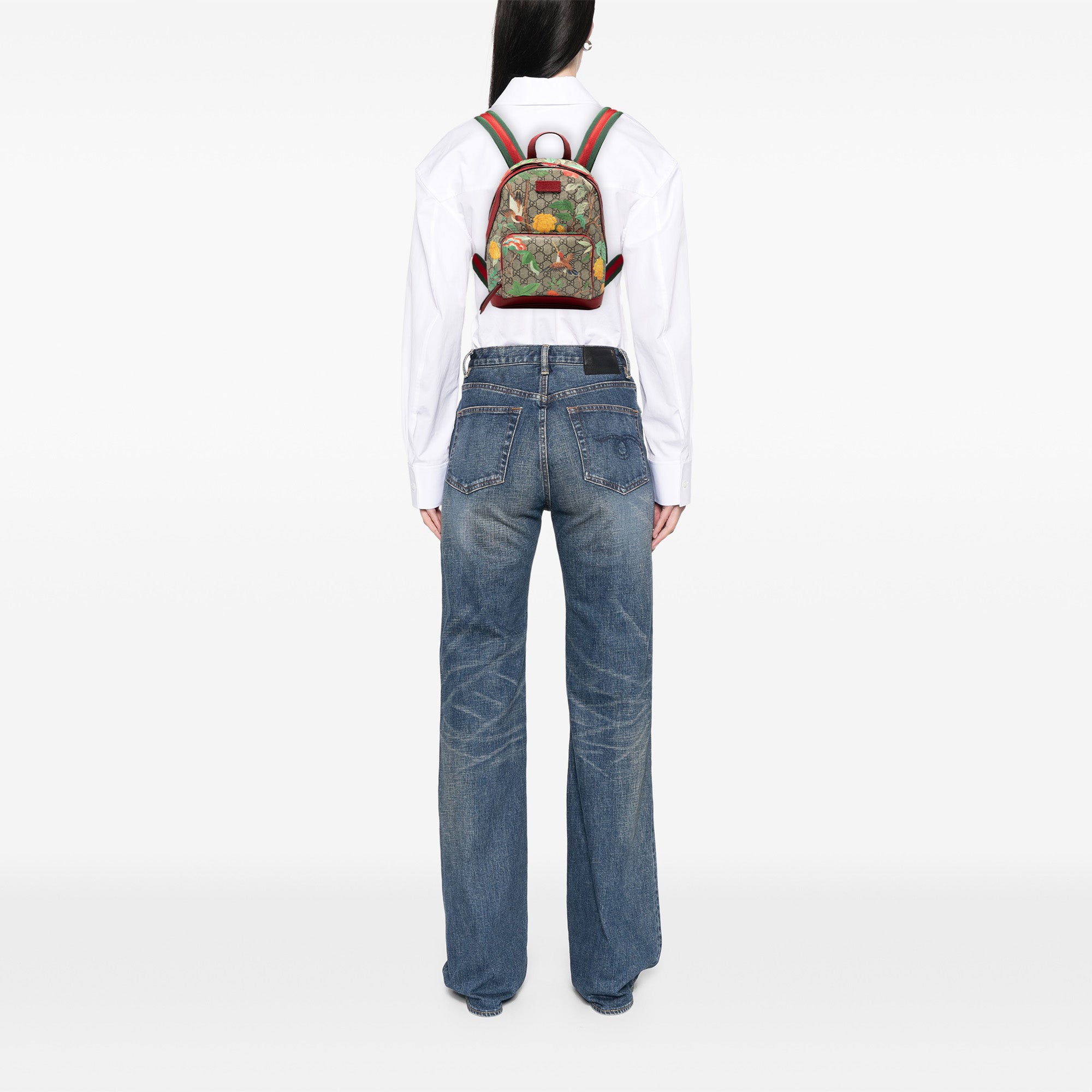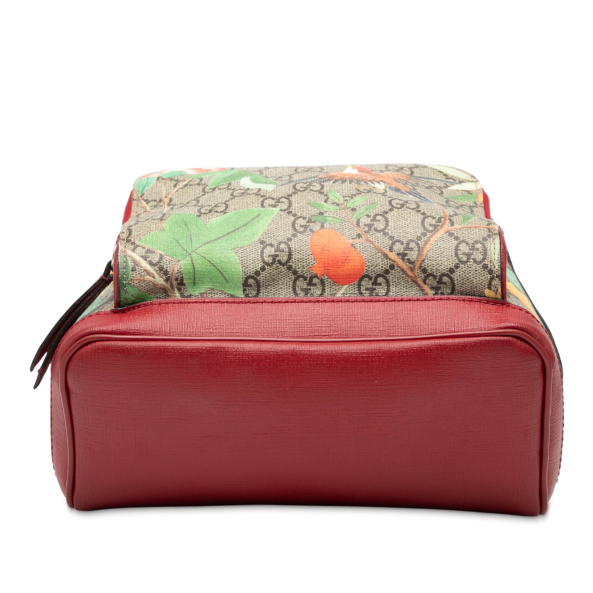 The Tian backpack features a printed coated canvas body with leather trim, a flat leather top handle, flat back straps, a two way top zip closure, an exterior front zip compartment, and interior zip and slip pockets. Retail Price: 1990.00