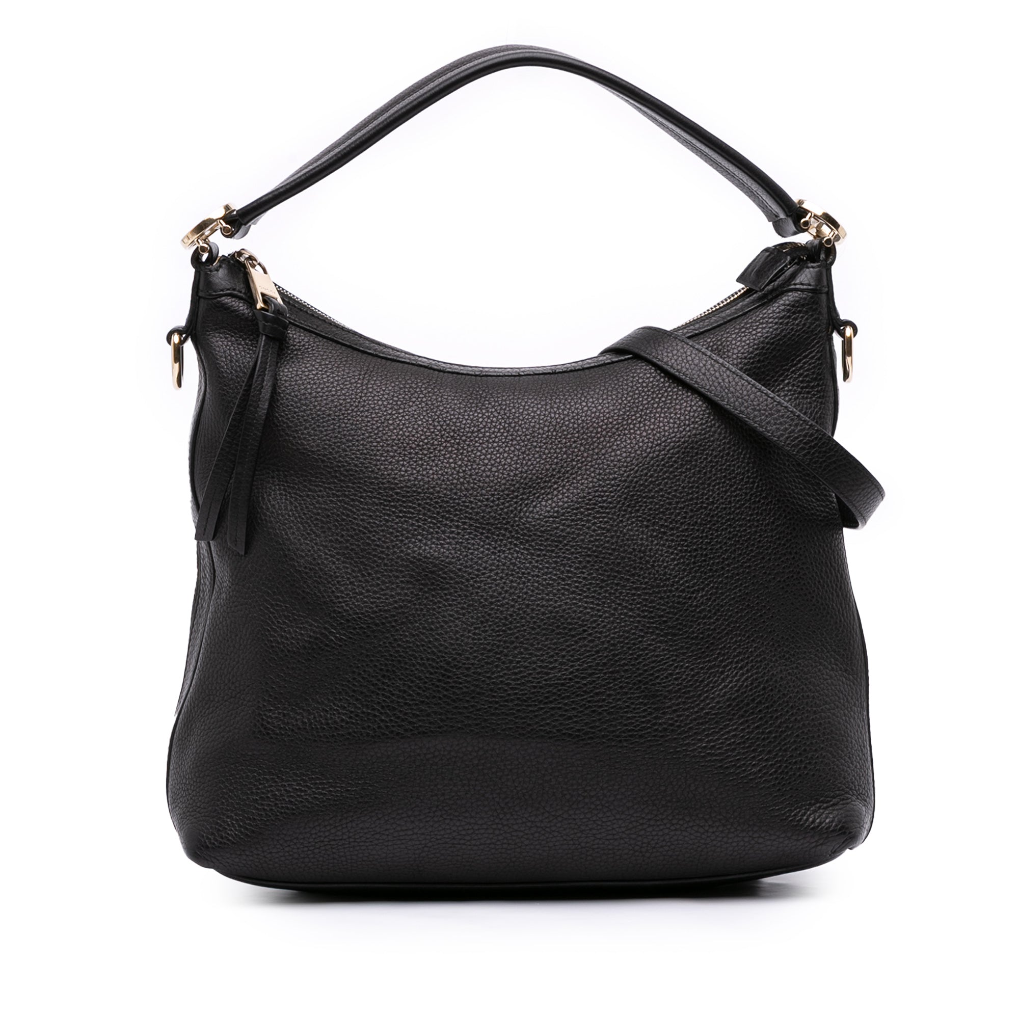 The Miss GG features a leather body, a flat leather handle, a detachable flat strap, a top zip closure, and interior zip and slip pockets. Retail Price: 1690.00