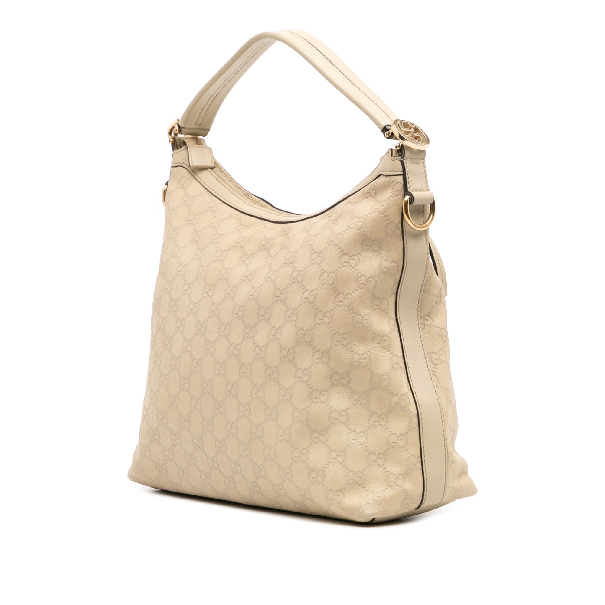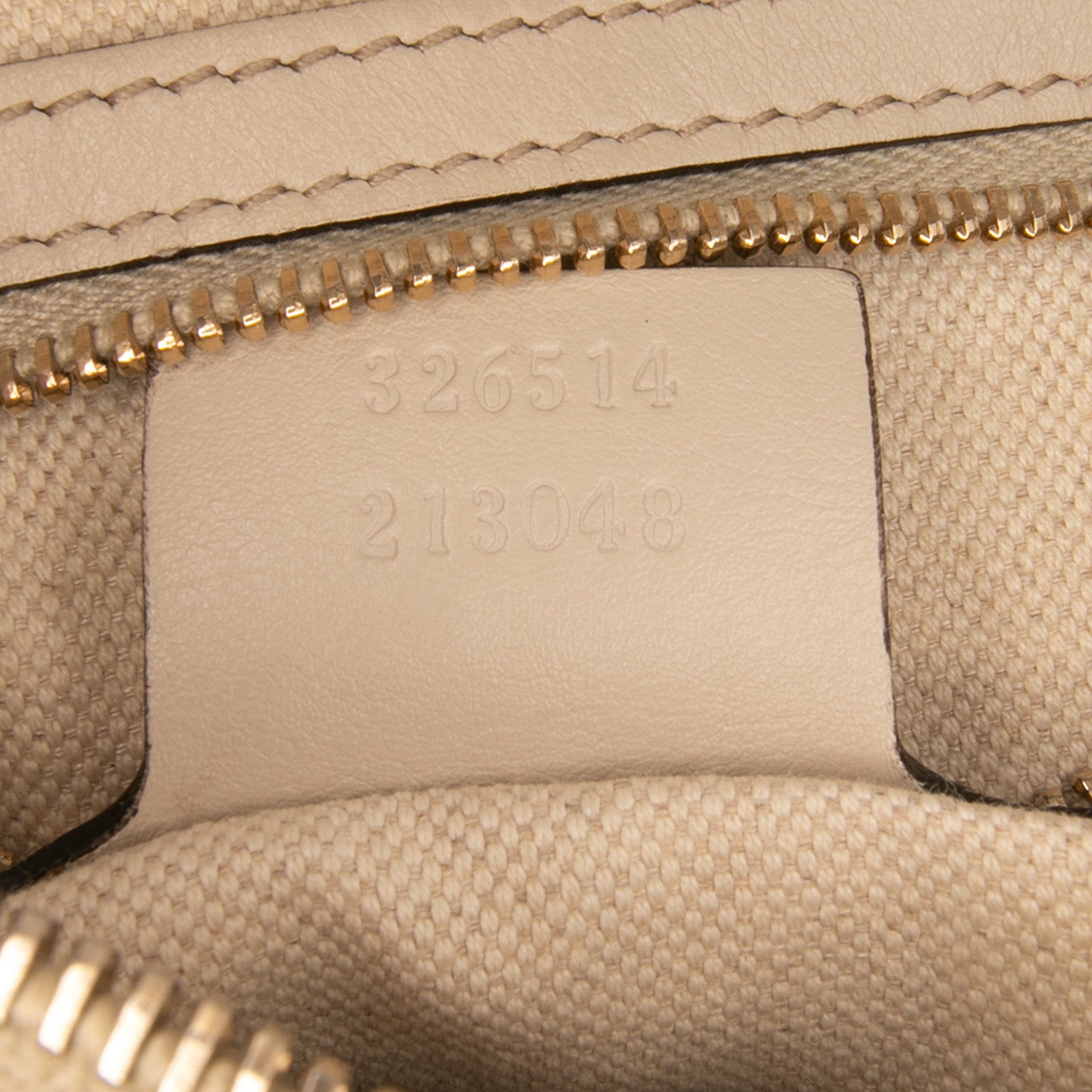 This satchel features an embossed leather body, a flat leather handle, a detachable flat leather strap, a top zip closure, and interior zip and slip pockets. Retail Price: 1200.00