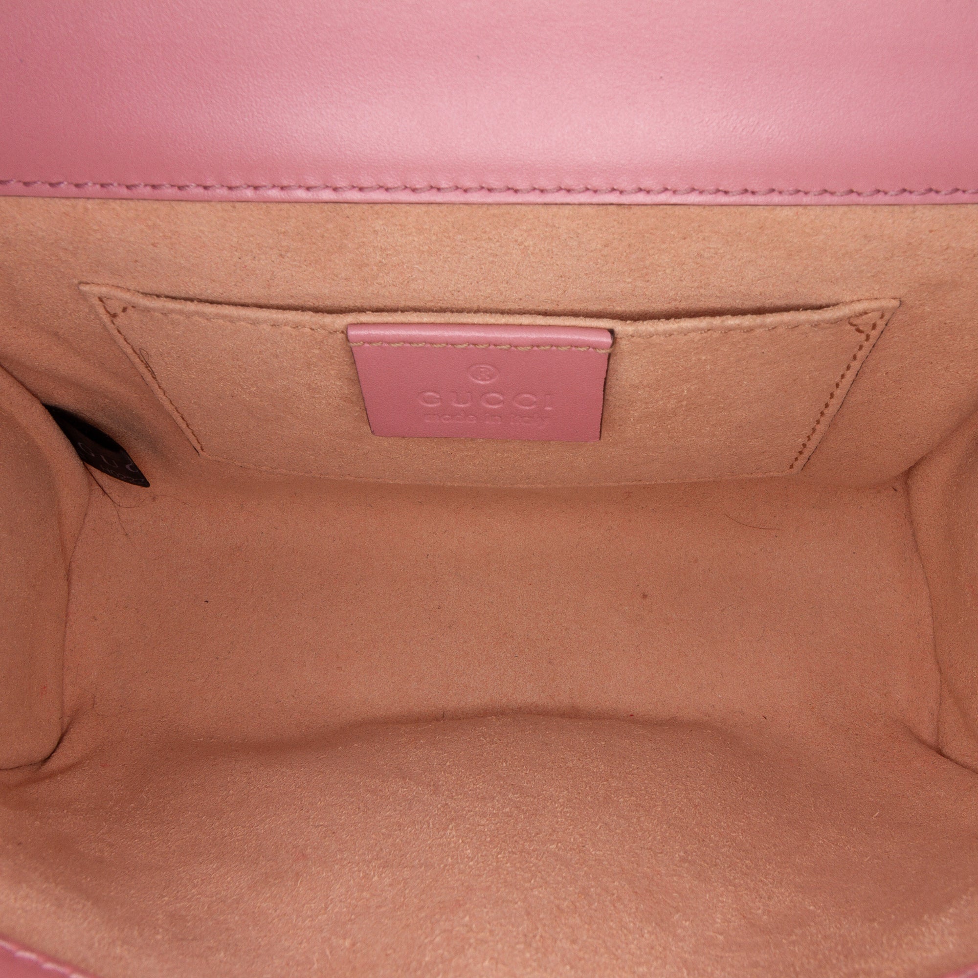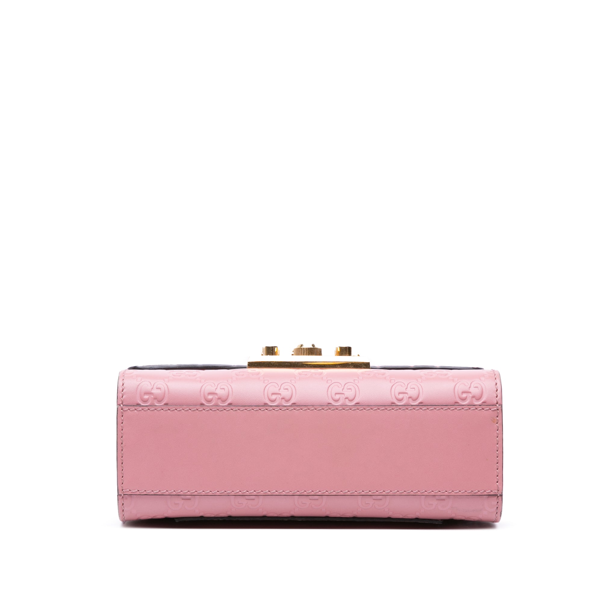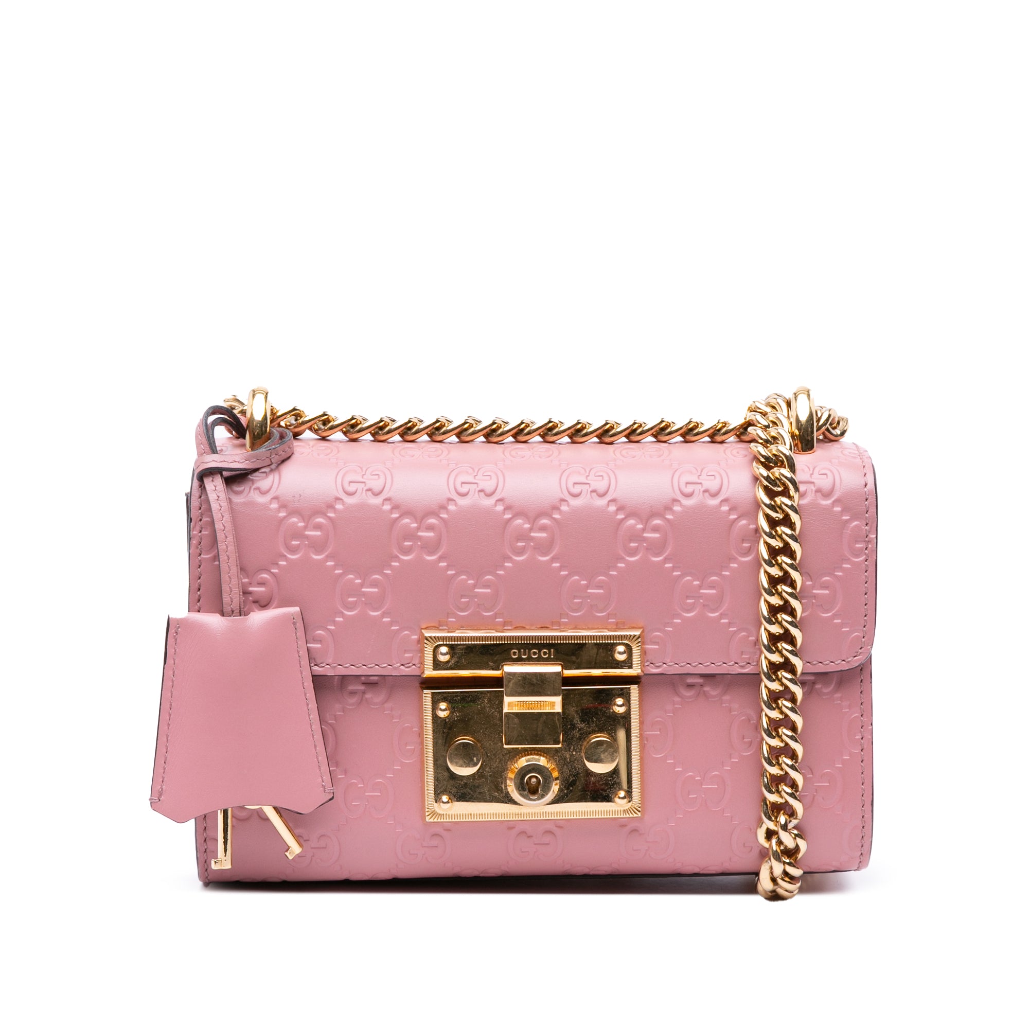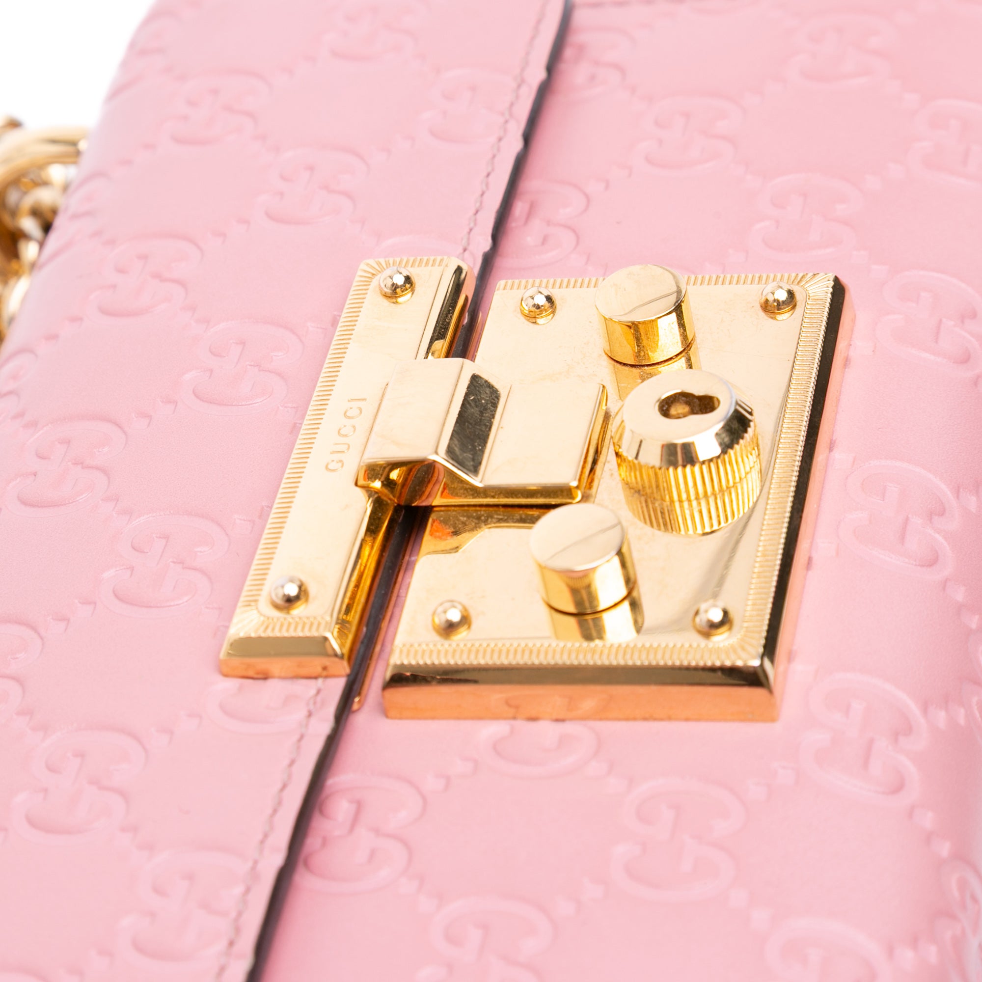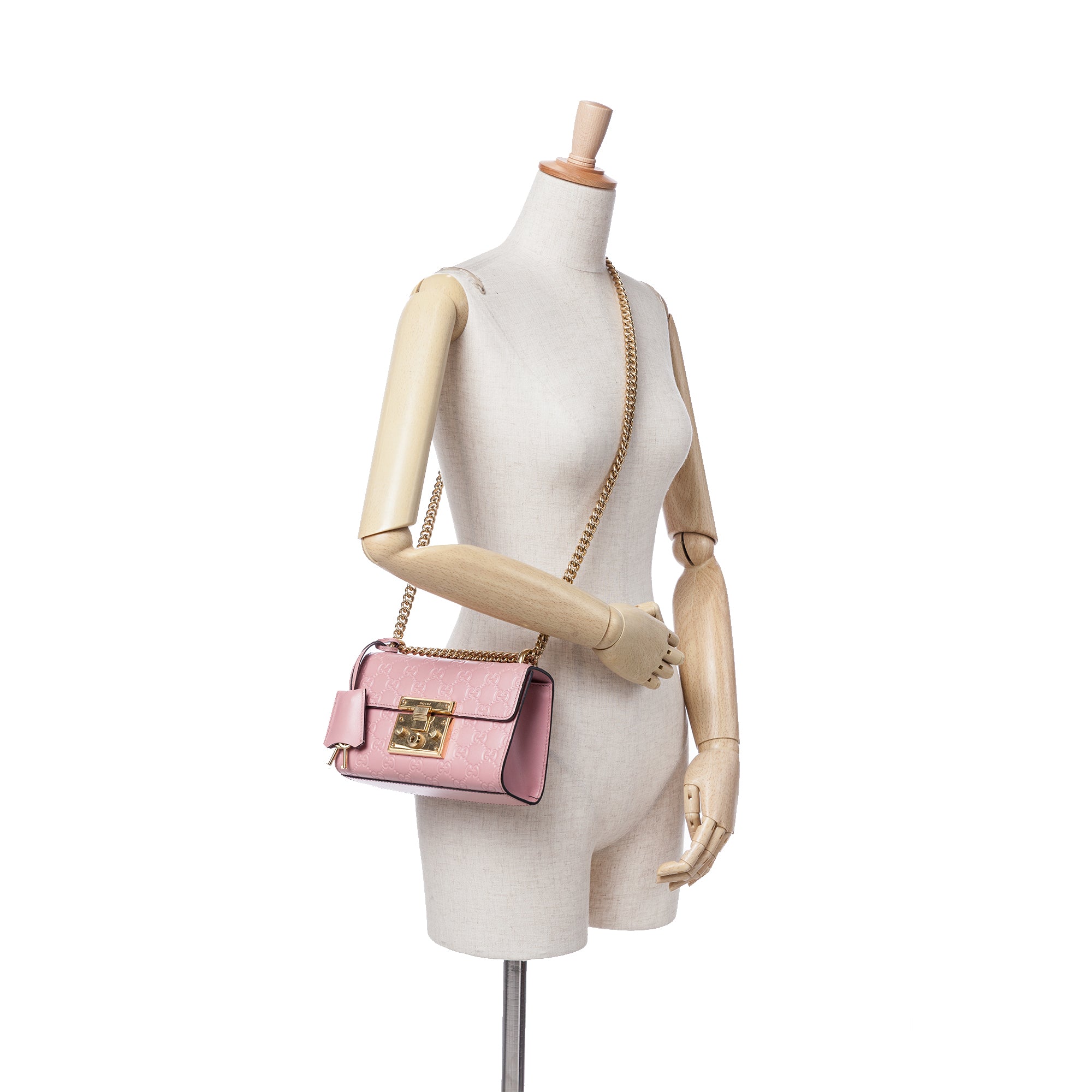 The Padlock crossbody bag features an embossed leather body, gold-tone chain straps, a front flap with push lock closure, an exterior back slip pocket, and an interior slip pocket. Retail Price: 1790.00