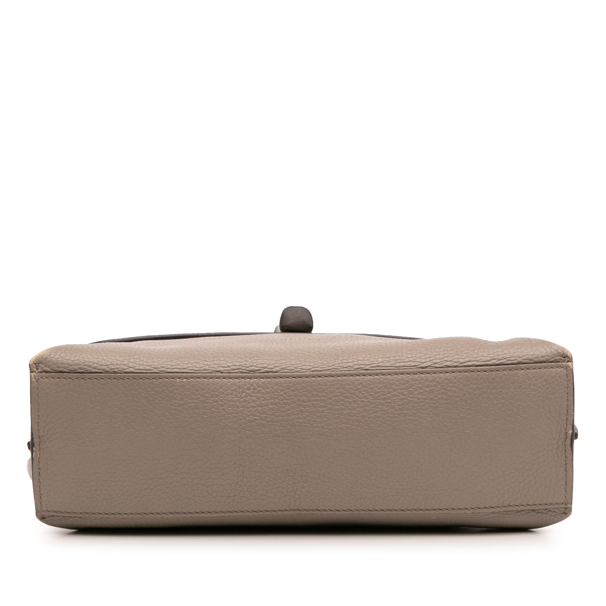 The Daily satchel features a leather body, a flat top handle, a detachable flat strap, a front flap with a bamboo bullet twist lock closure, and interior zip and slip pockets. Retail Price: 1650.00