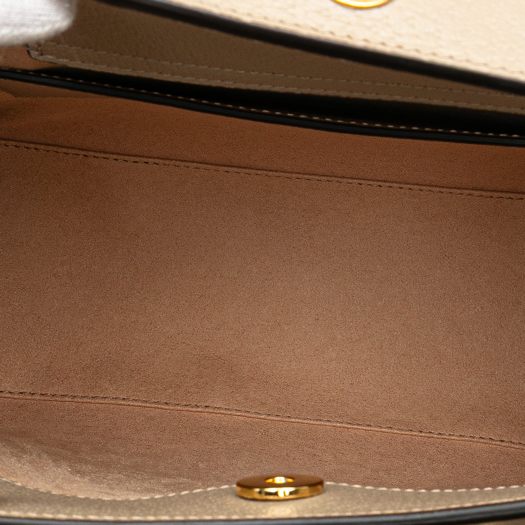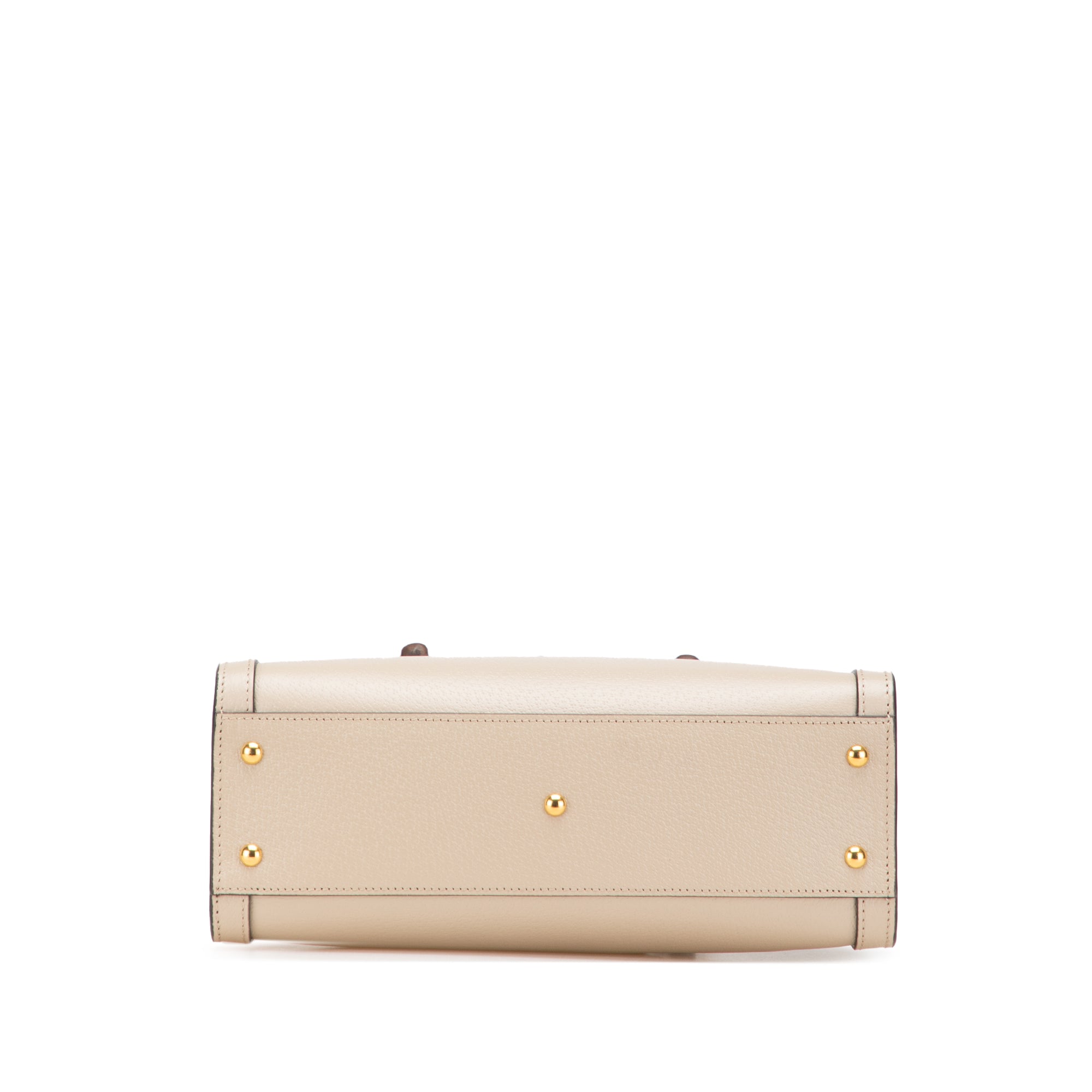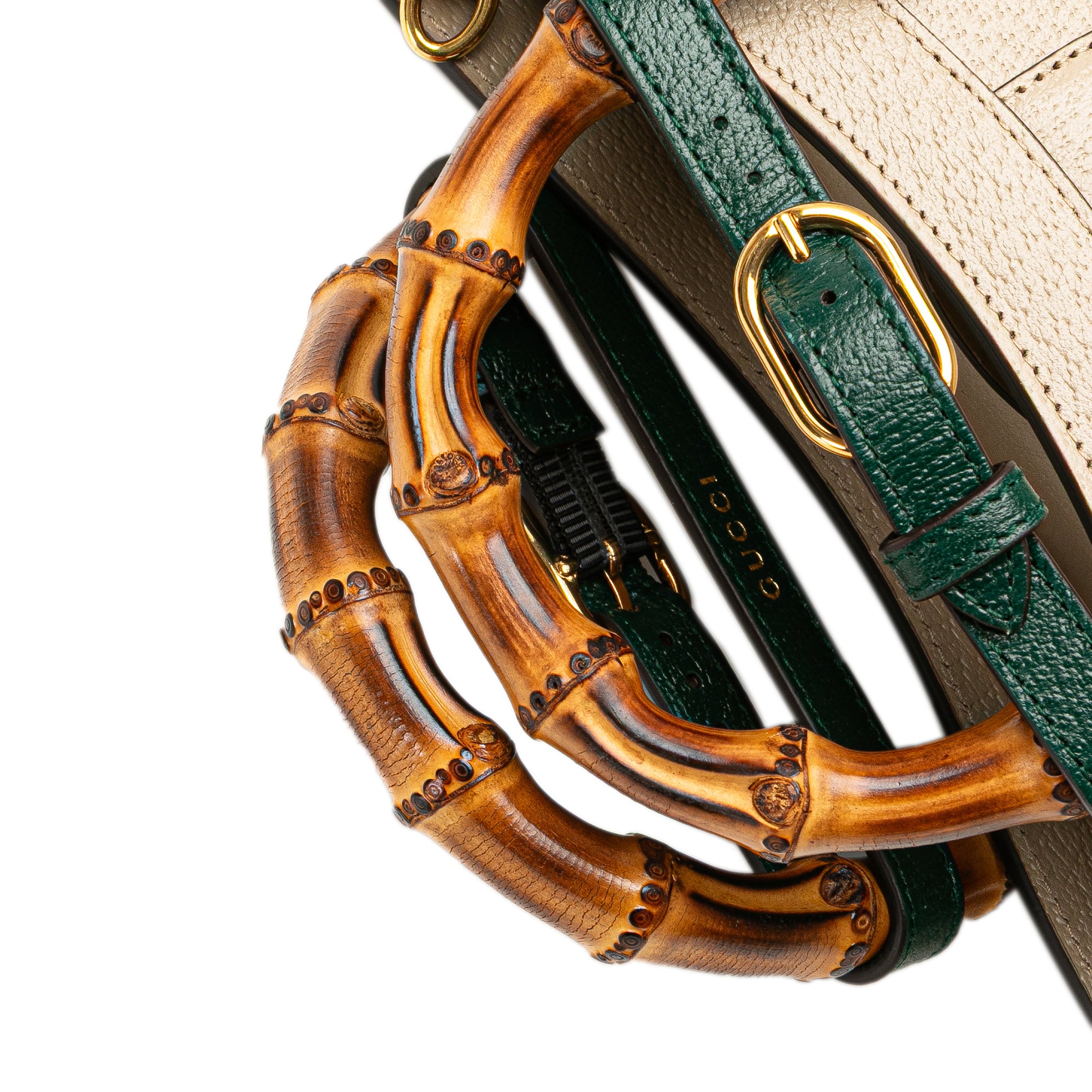 This satchel features a leather body, bamboo handles, detachable flat leather and canvas straps, an open top with magnetic snap button closure, and an interior slip pocket. Inclusion: Dust bag, box. Retail Price: 2458.00