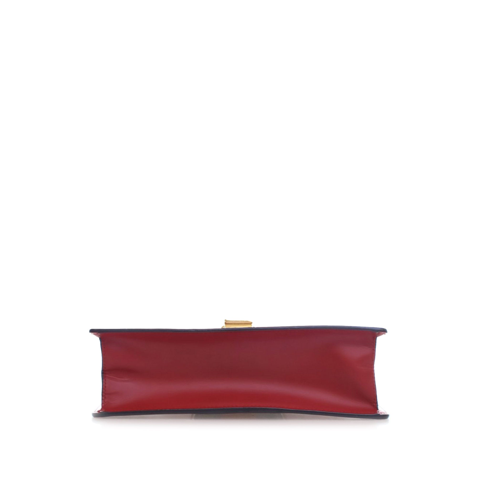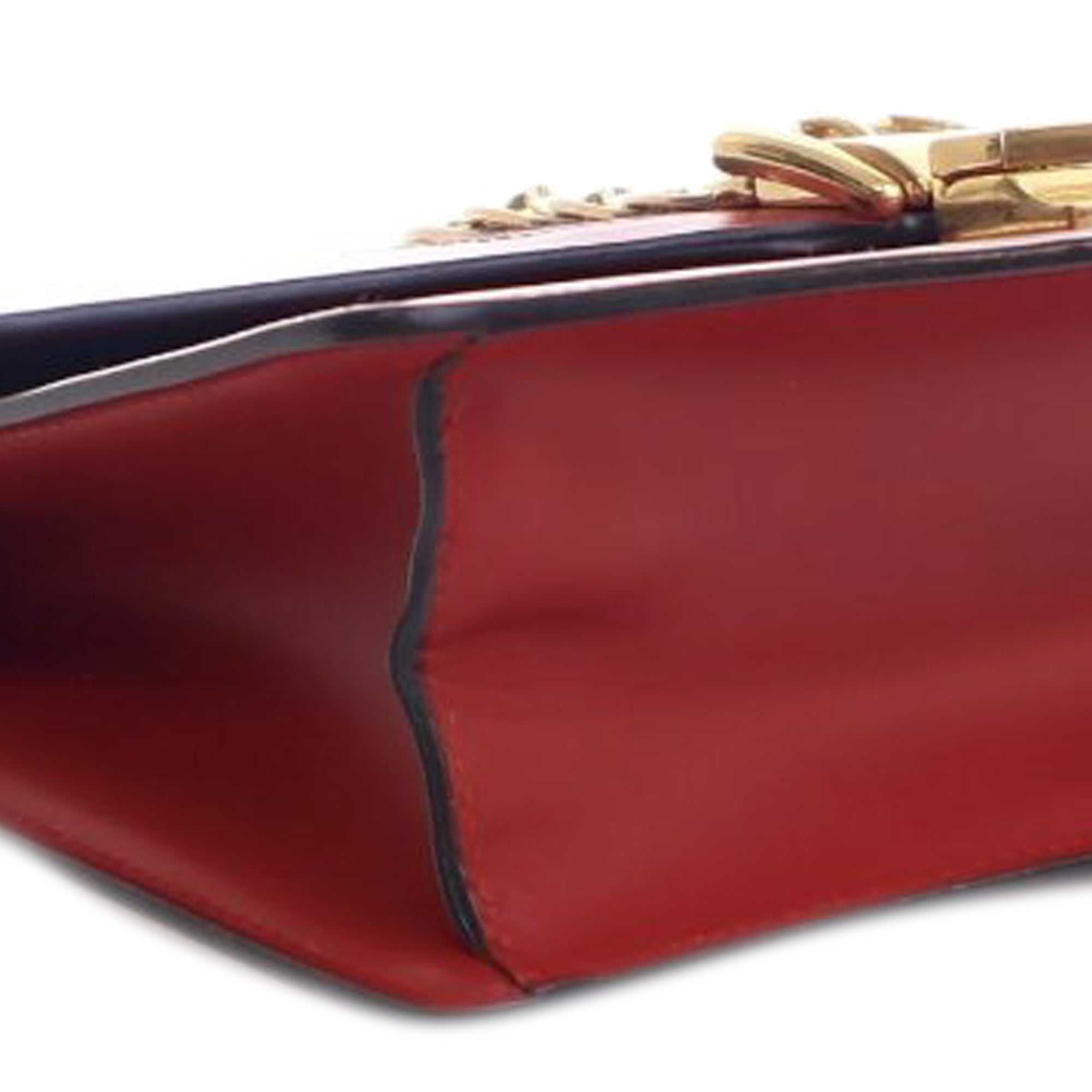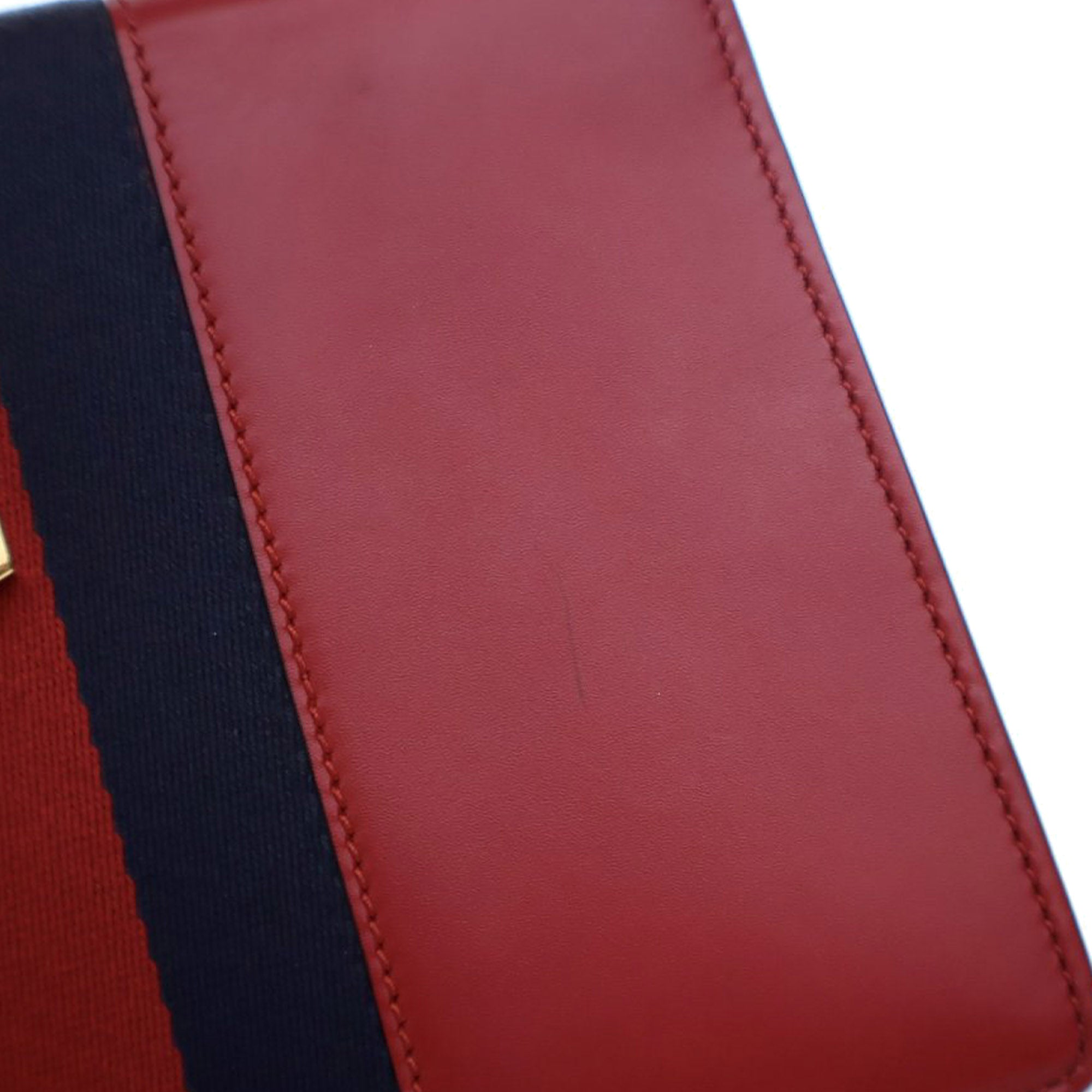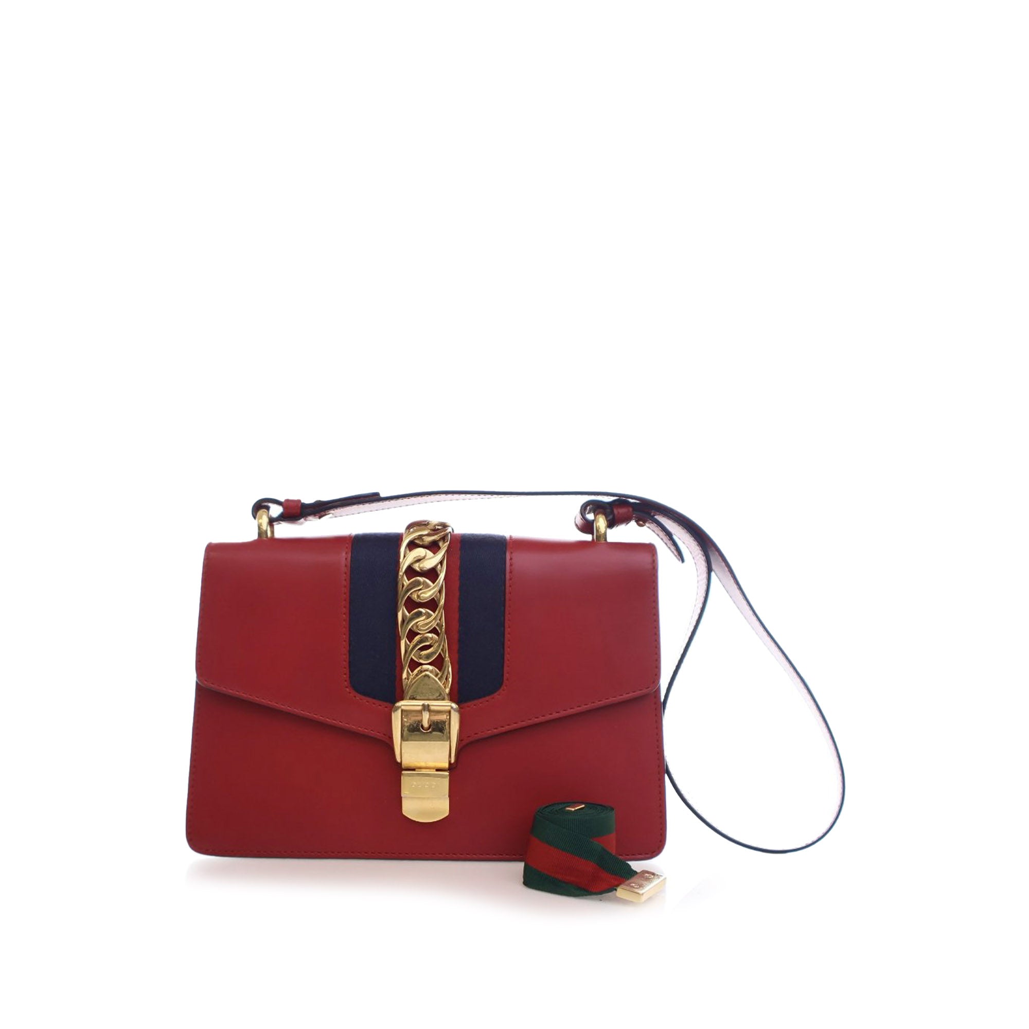 The Sylvie shoulder bag features a leather body, a web trim, a flat leather strap, detachable flat web ribbon strap, a front flap with a metal closure, and interior zip and slip pockets. Retail Price: 1786.00