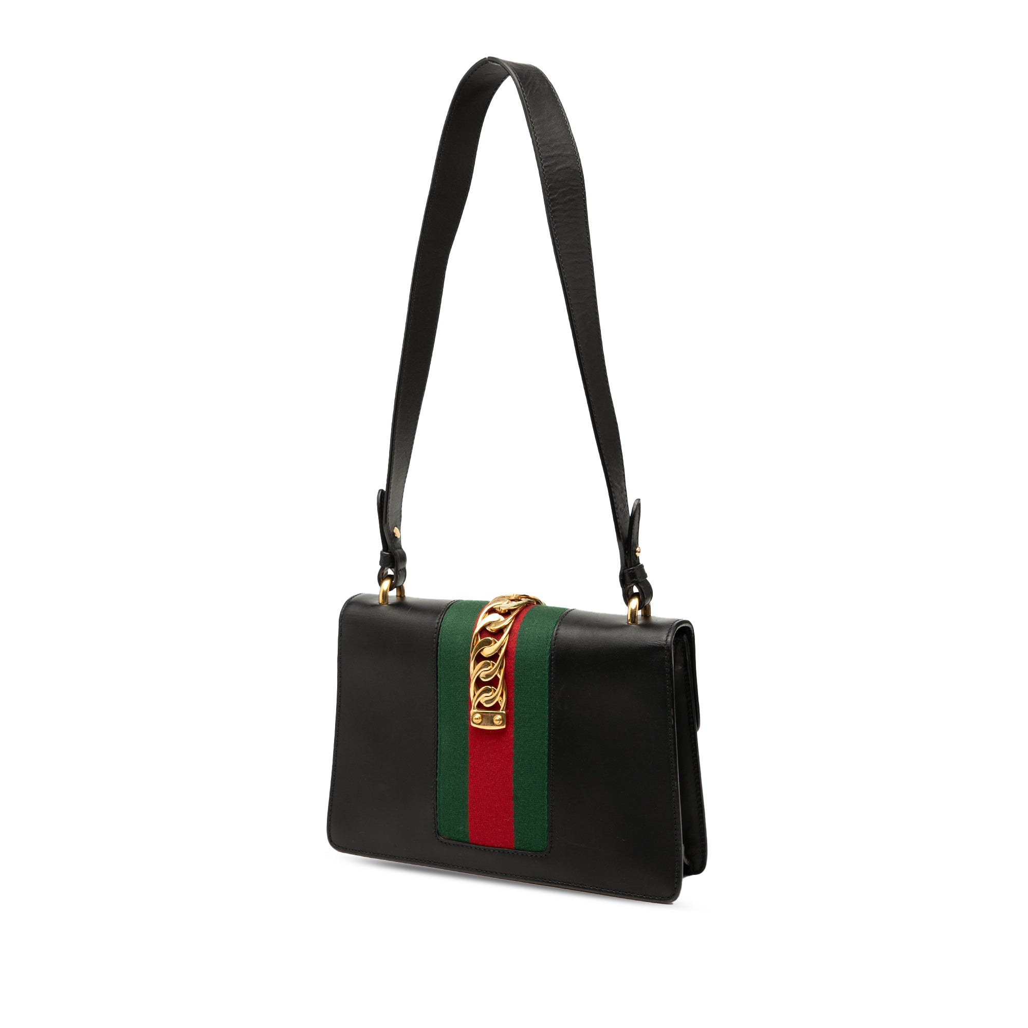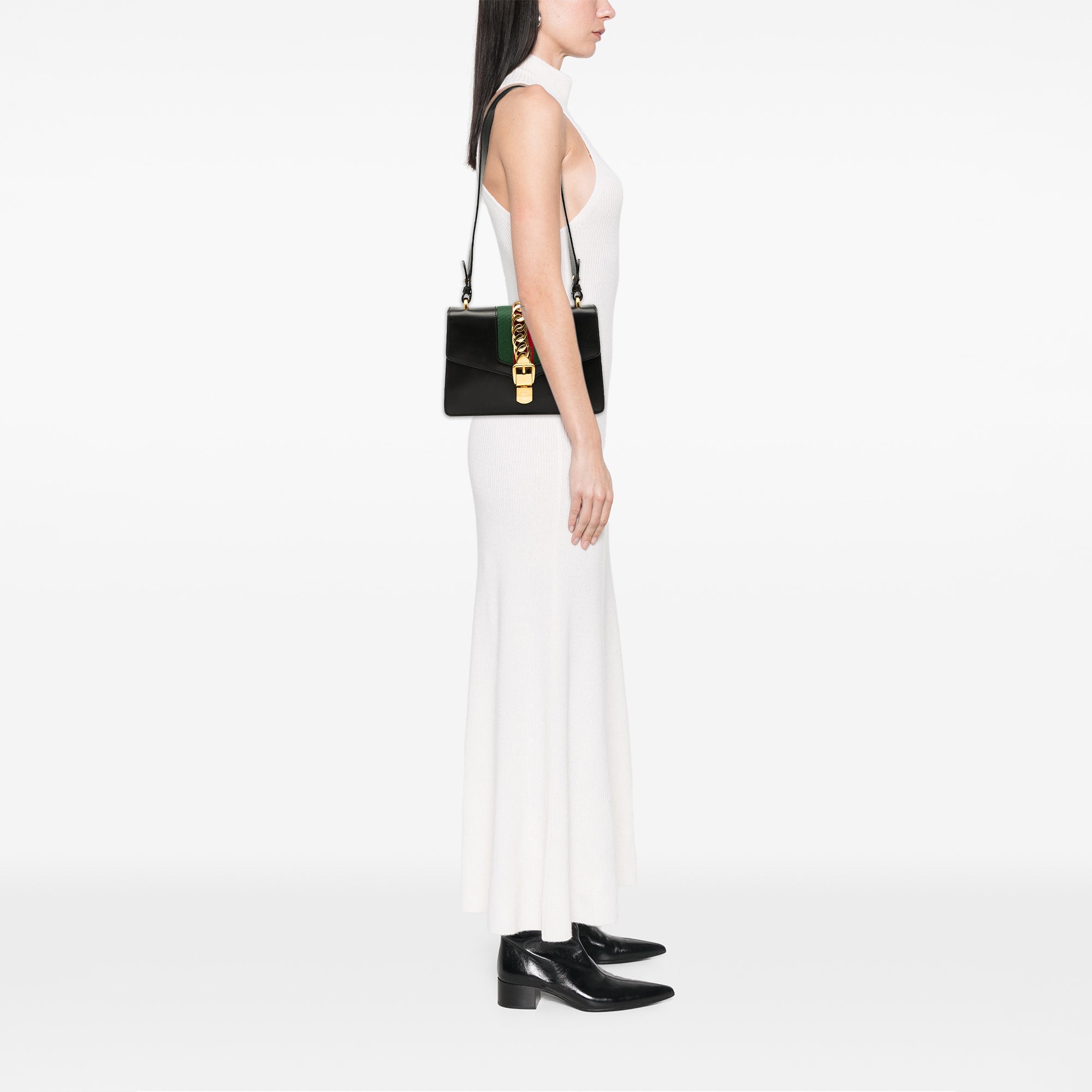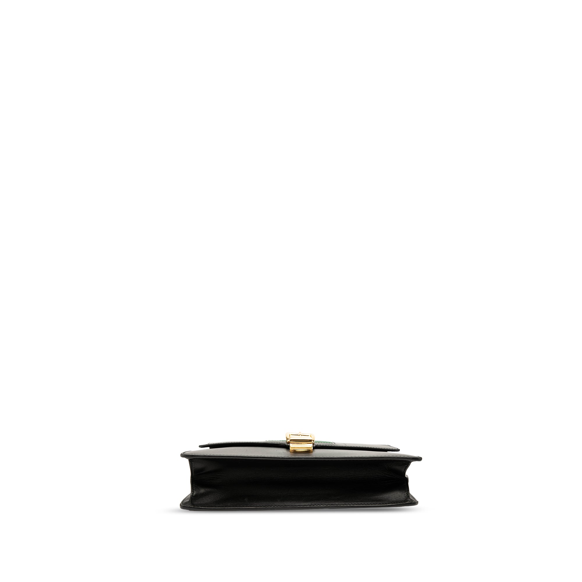 The Sylvie features a leather body, a detachable flat leather shoulder strap, a detachable canvas strap, a front flap with push lock closure, and interior zip and slip pockets. Retail Price: 1800.00
