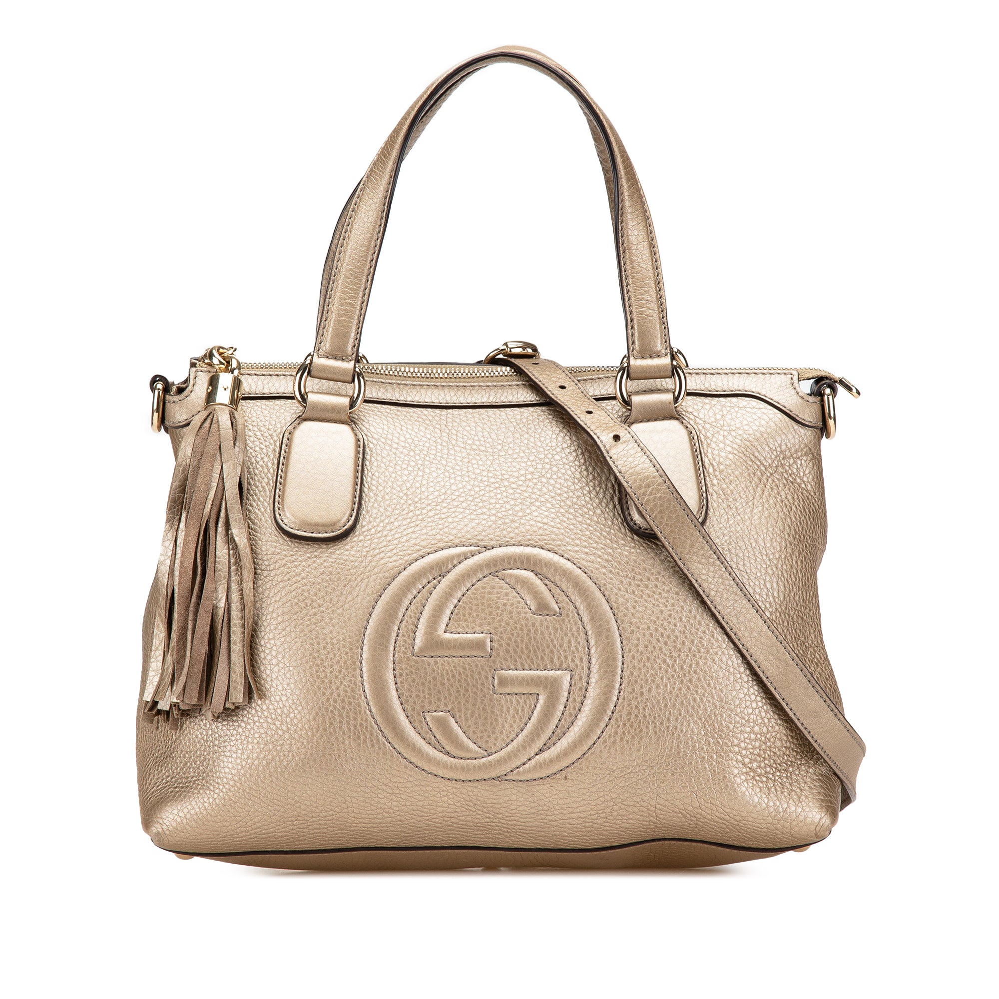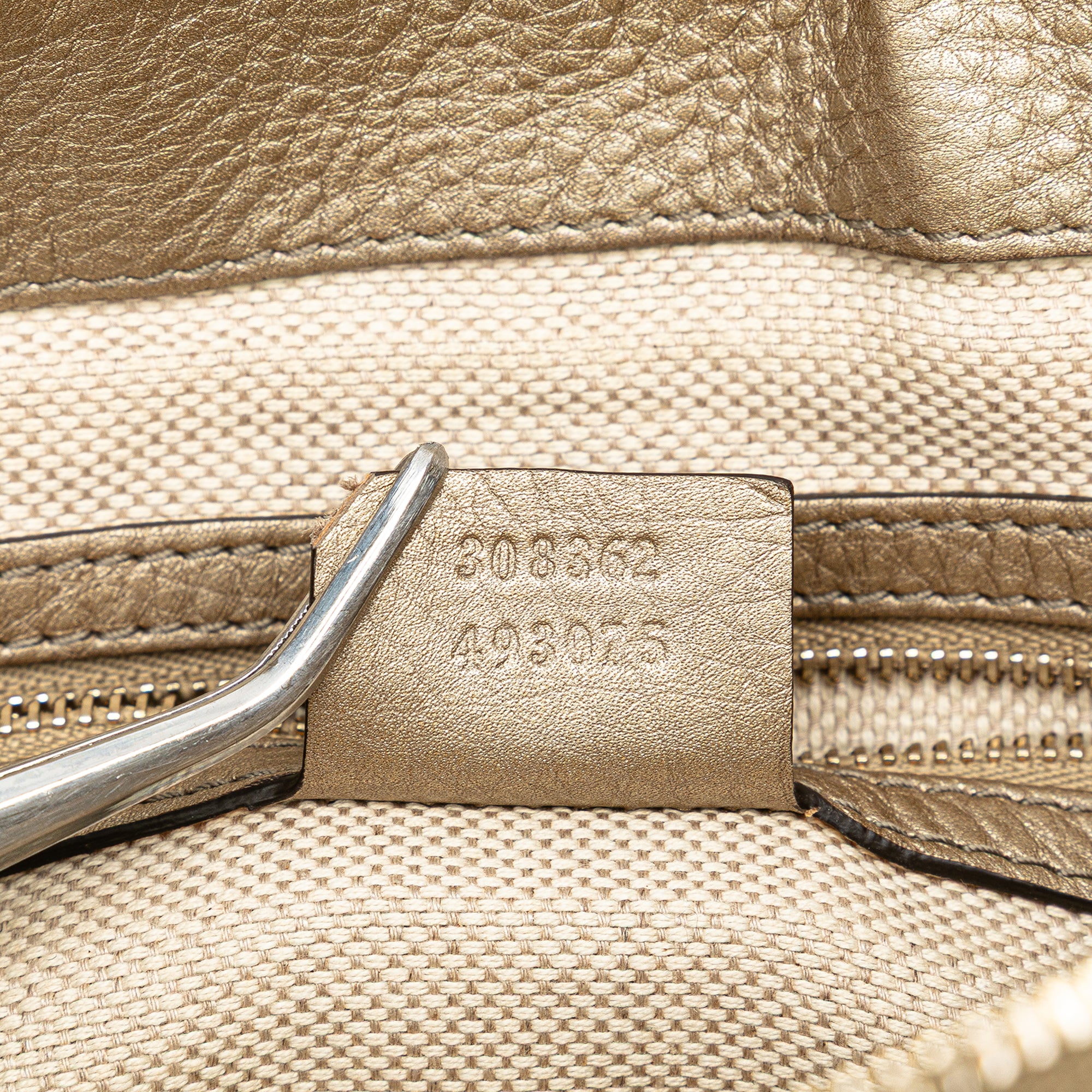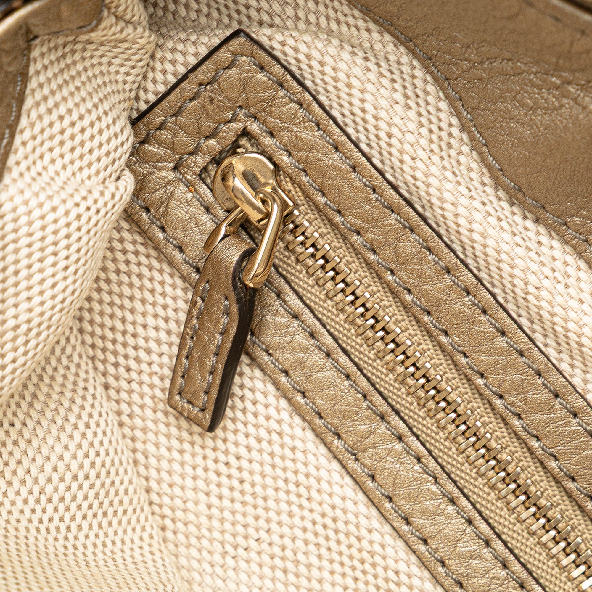 The Soho Working satchel features a metallic leather body, flat leather handles, a detachable flat leather strap, a top zip closure, and interior zip and slip pockets. Retail Price: 1670.00