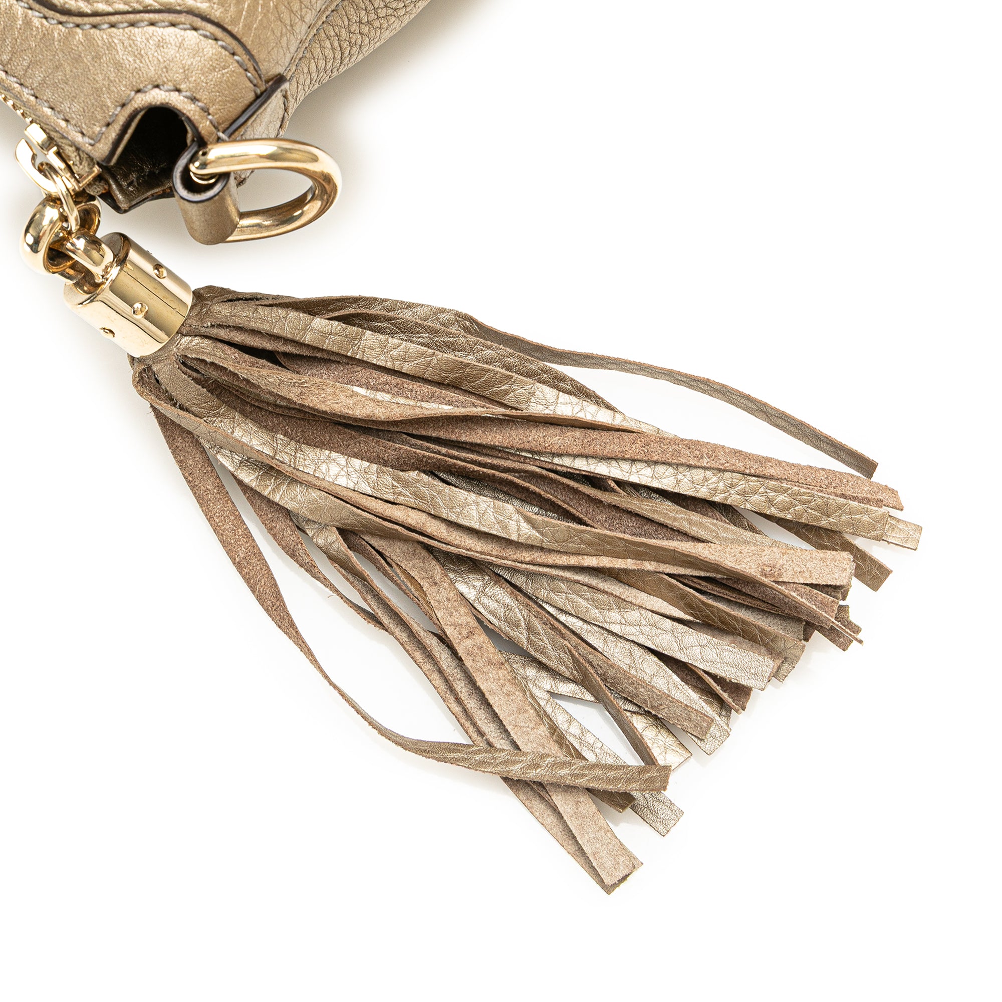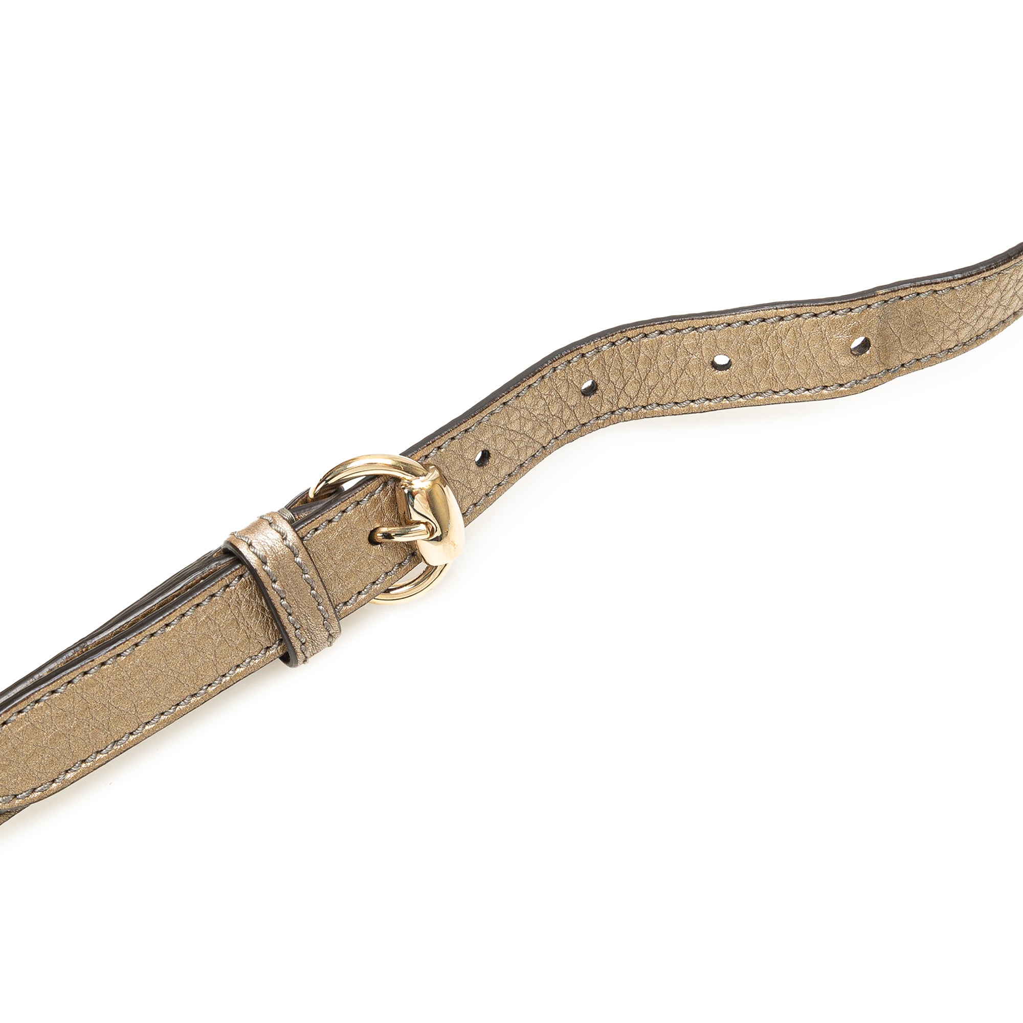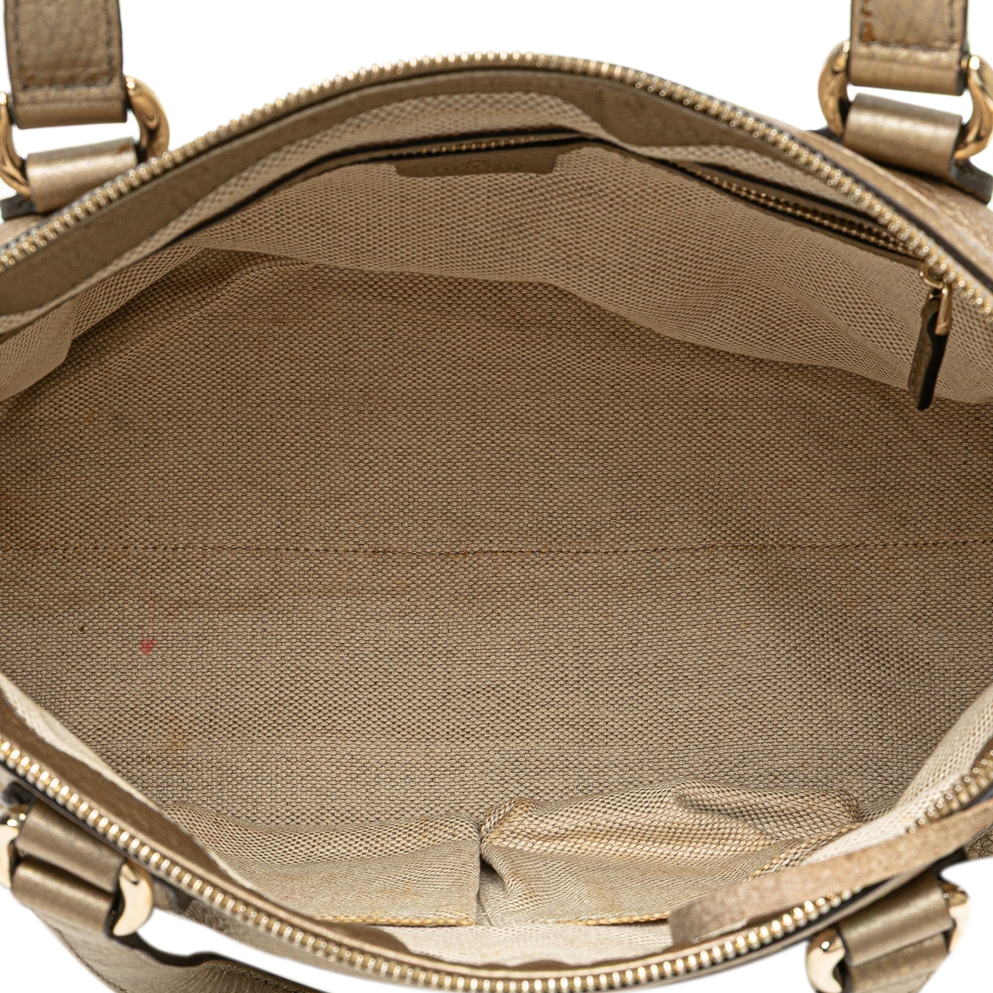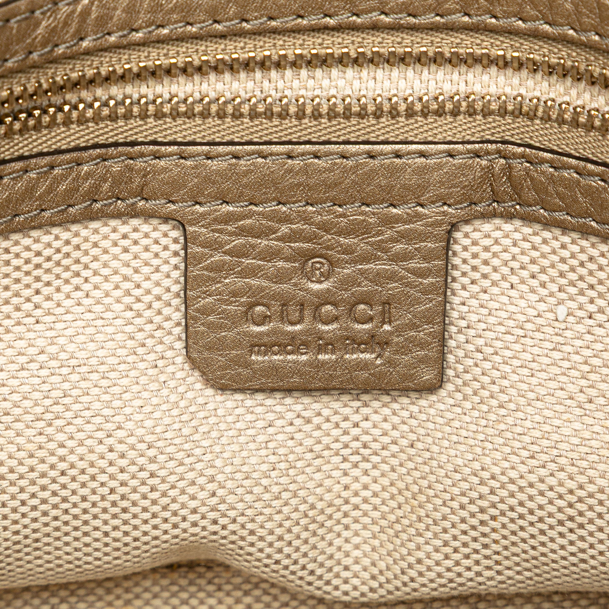 The Soho Working satchel features a metallic leather body, flat leather handles, a detachable flat leather strap, a top zip closure, and interior zip and slip pockets. Retail Price: 1670.00