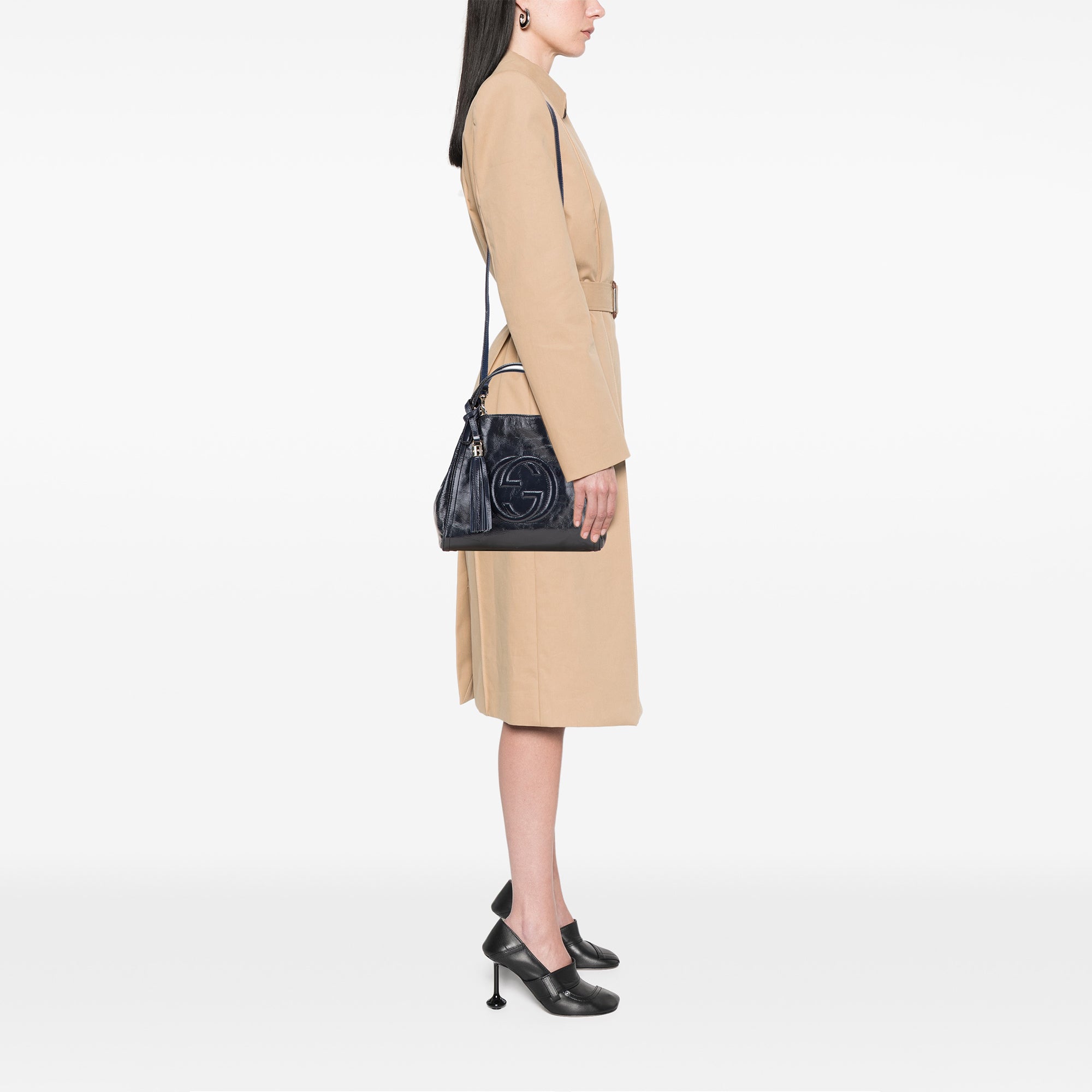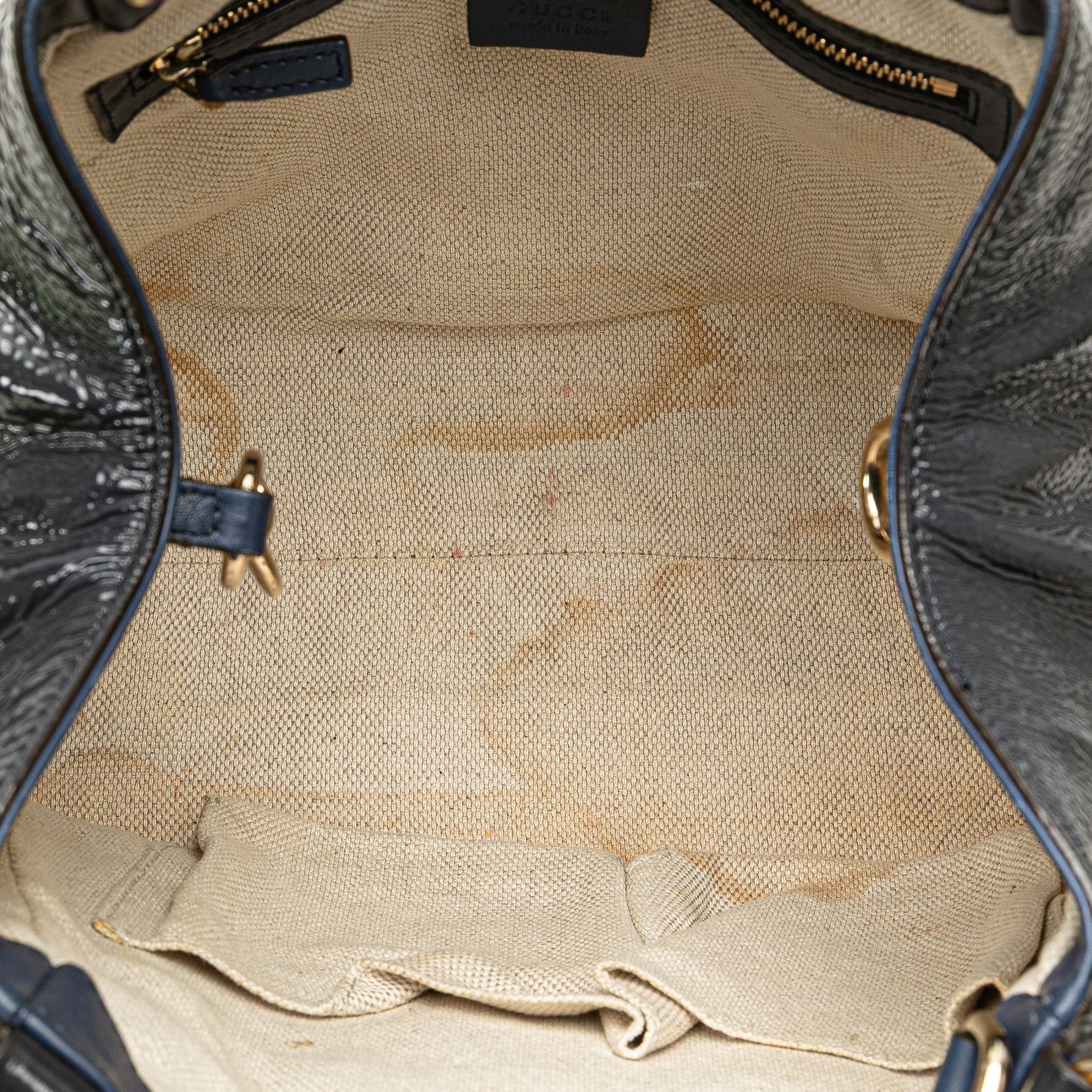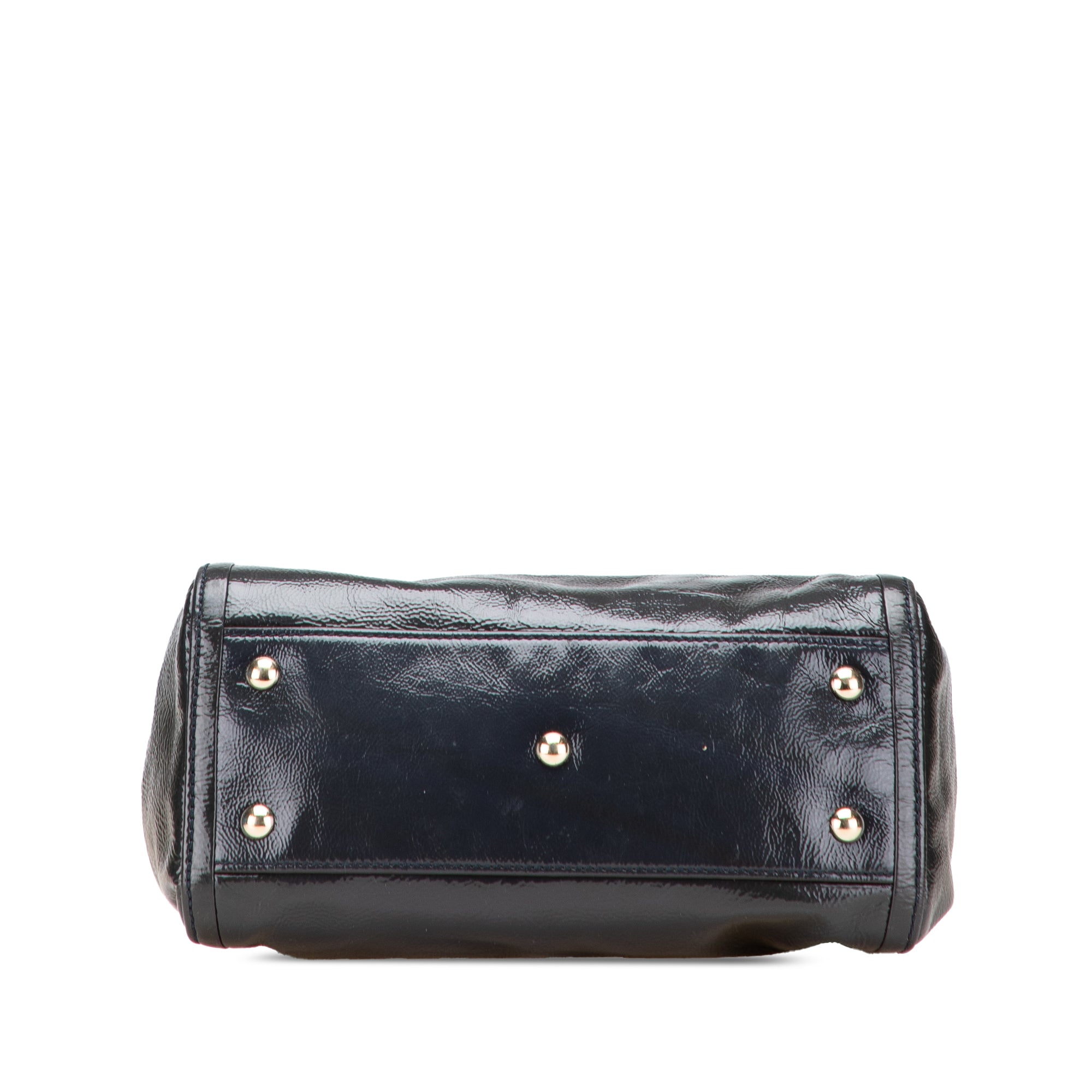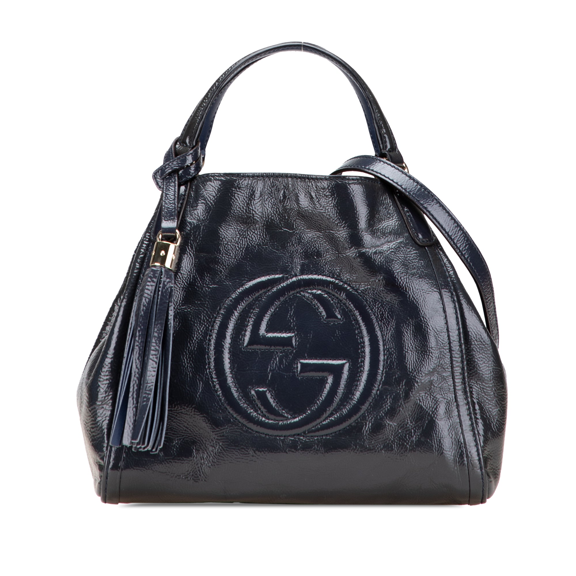 The Soho features a patent leather body, flat leather handles with tassel details, a detachable flat strap, an open top with lobster clasp closure, and interior zip and slip pockets. Retail Price: 1650.00