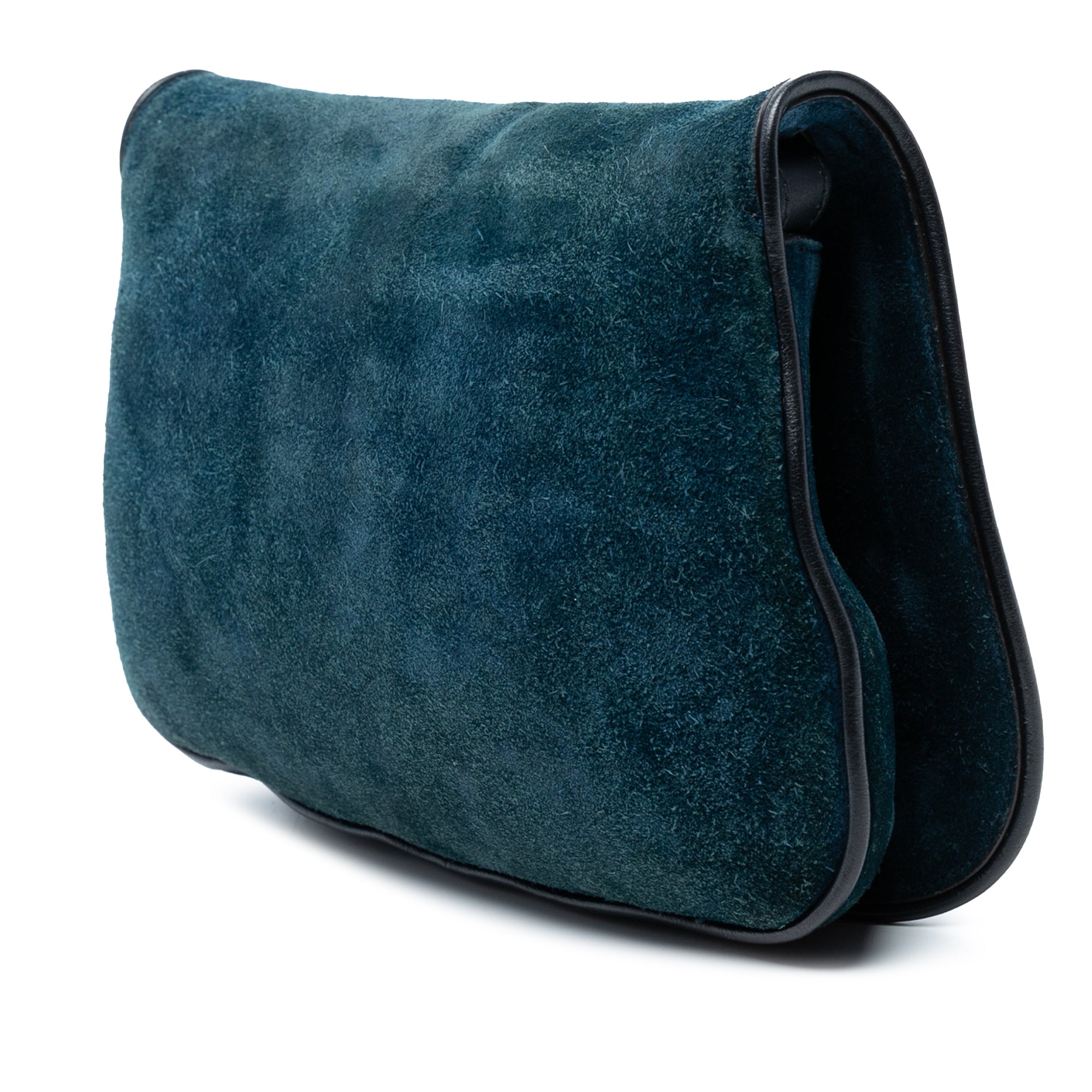 The Blondie bag features a suede body, a chain link strap, an adjustable and detachable flat leather strap, a front flap with magnetic snap closure, and an interior zip pocket. Retail Price: 2200.00