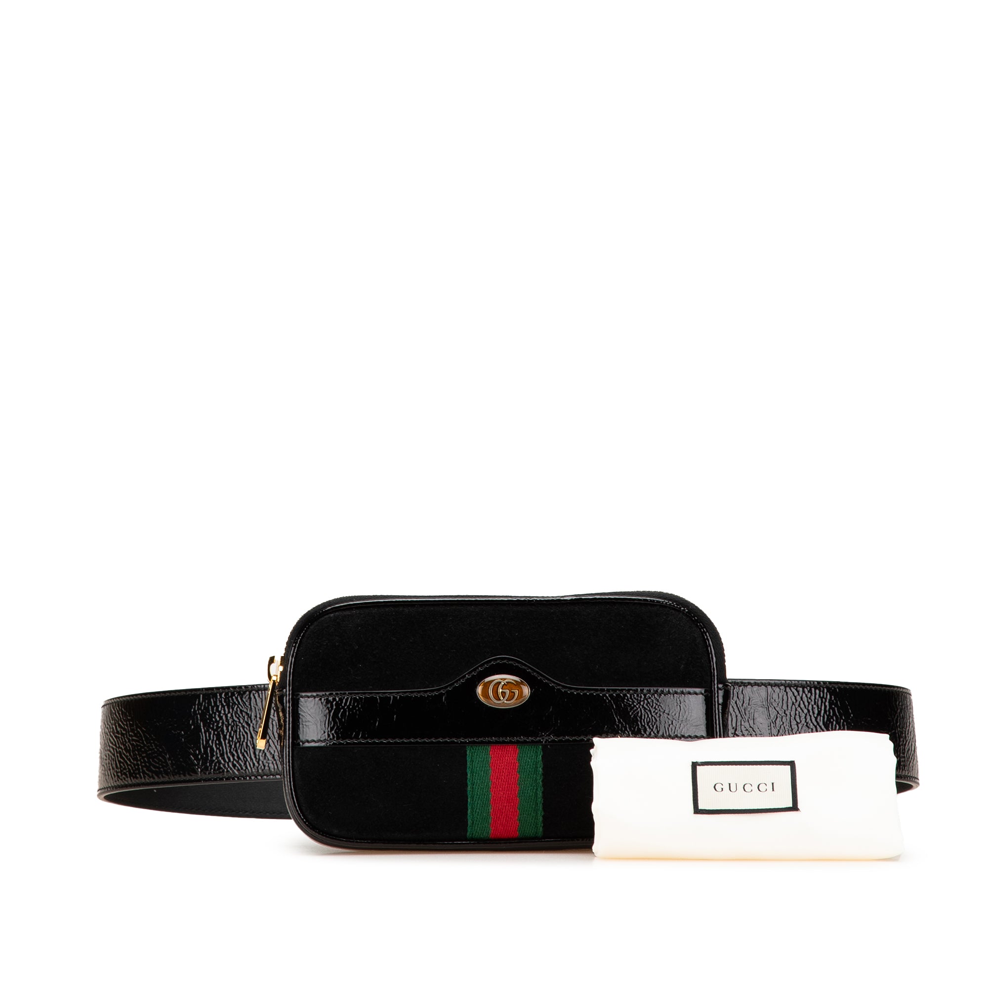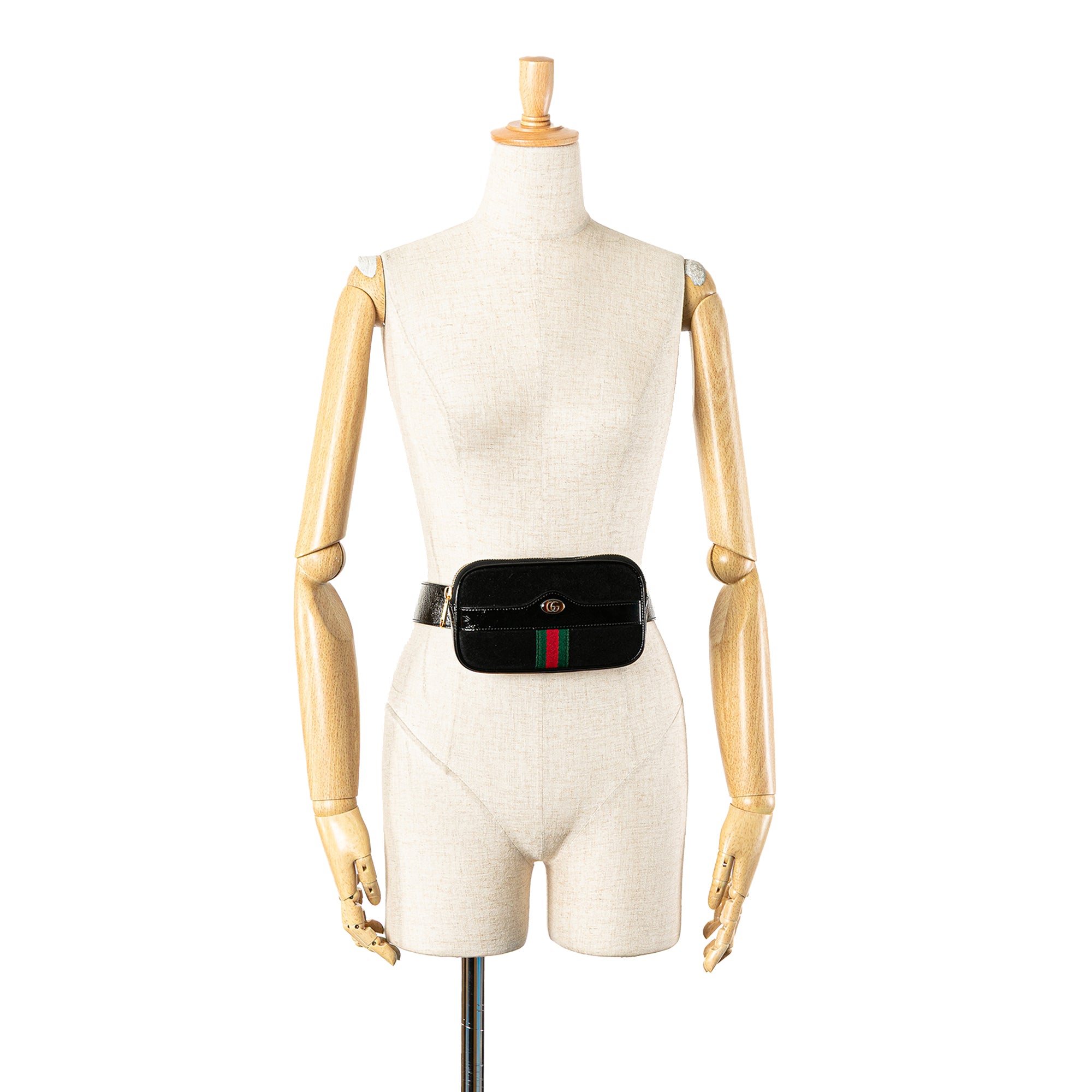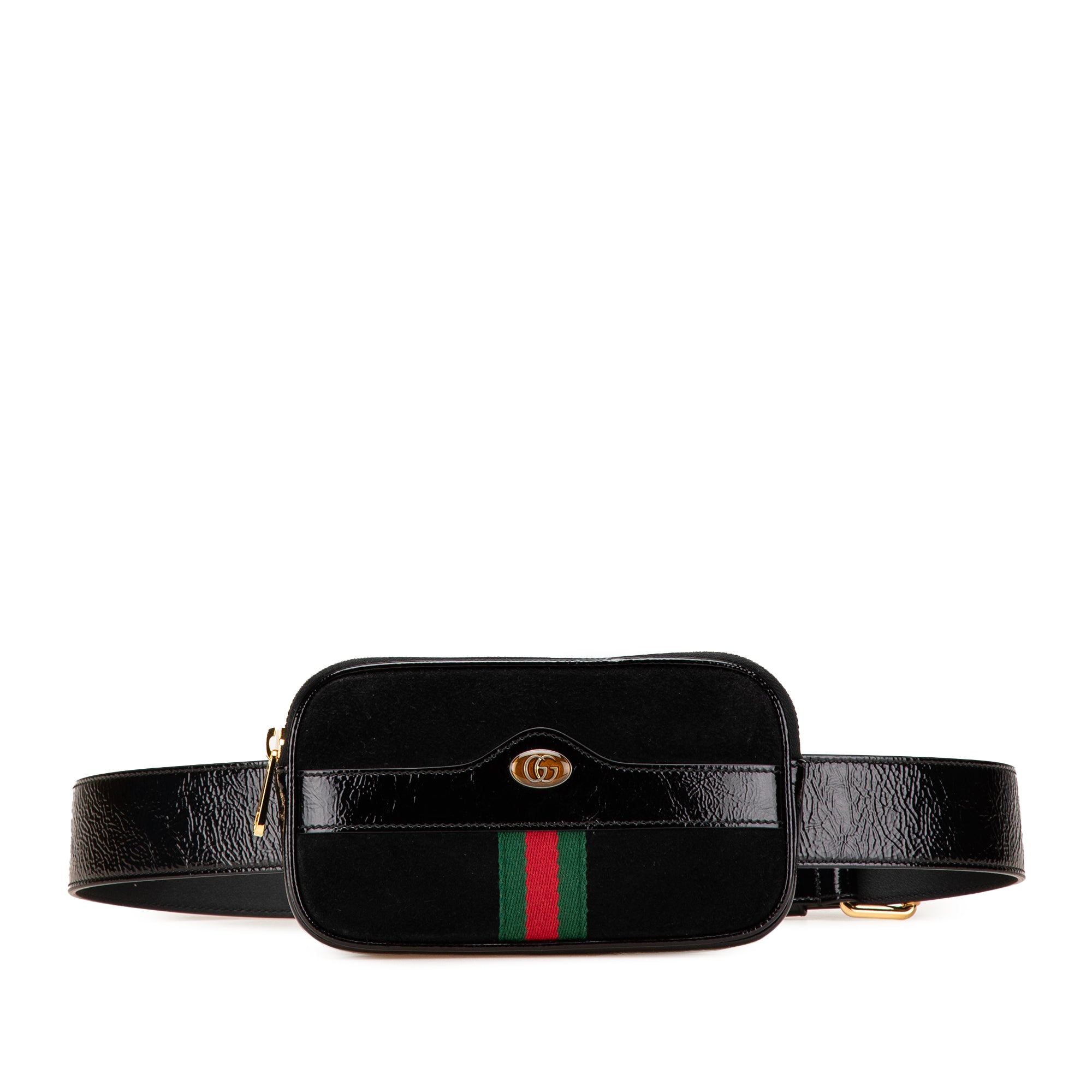 The Ophidia belt bag features a suede body with patent leather trim, a flat leather waist strap, a top zip closure, and interior slip pockets. Inclusion: Dust bag. Retail Price: 1350.00
