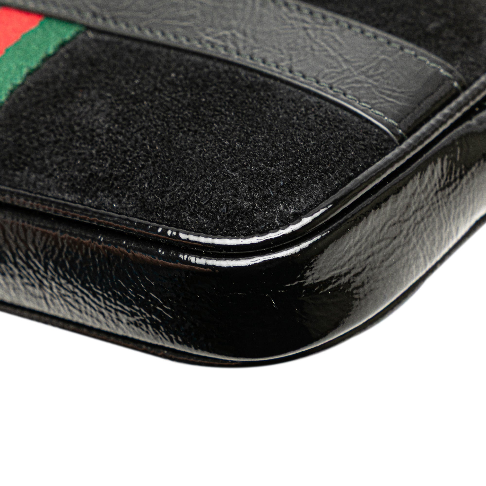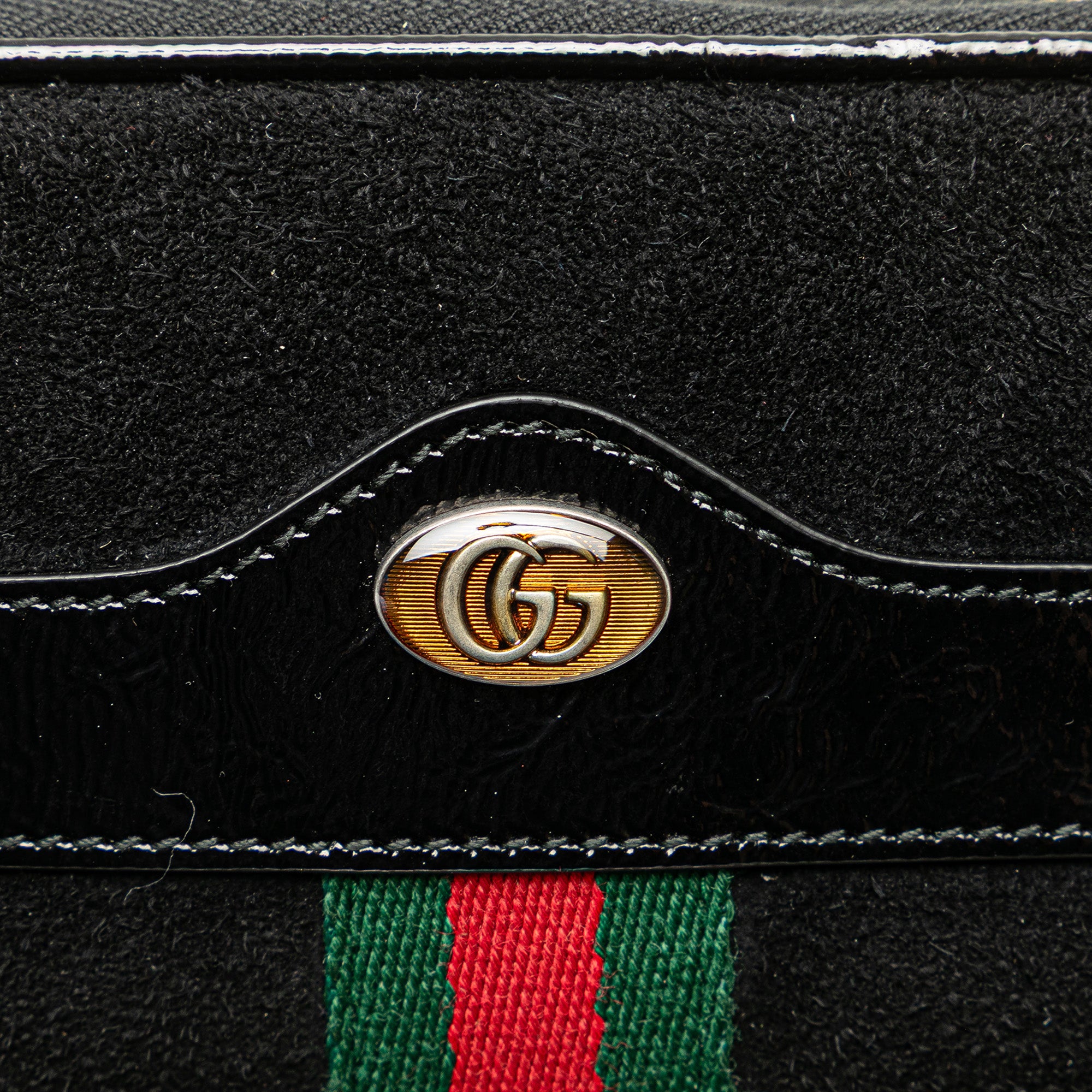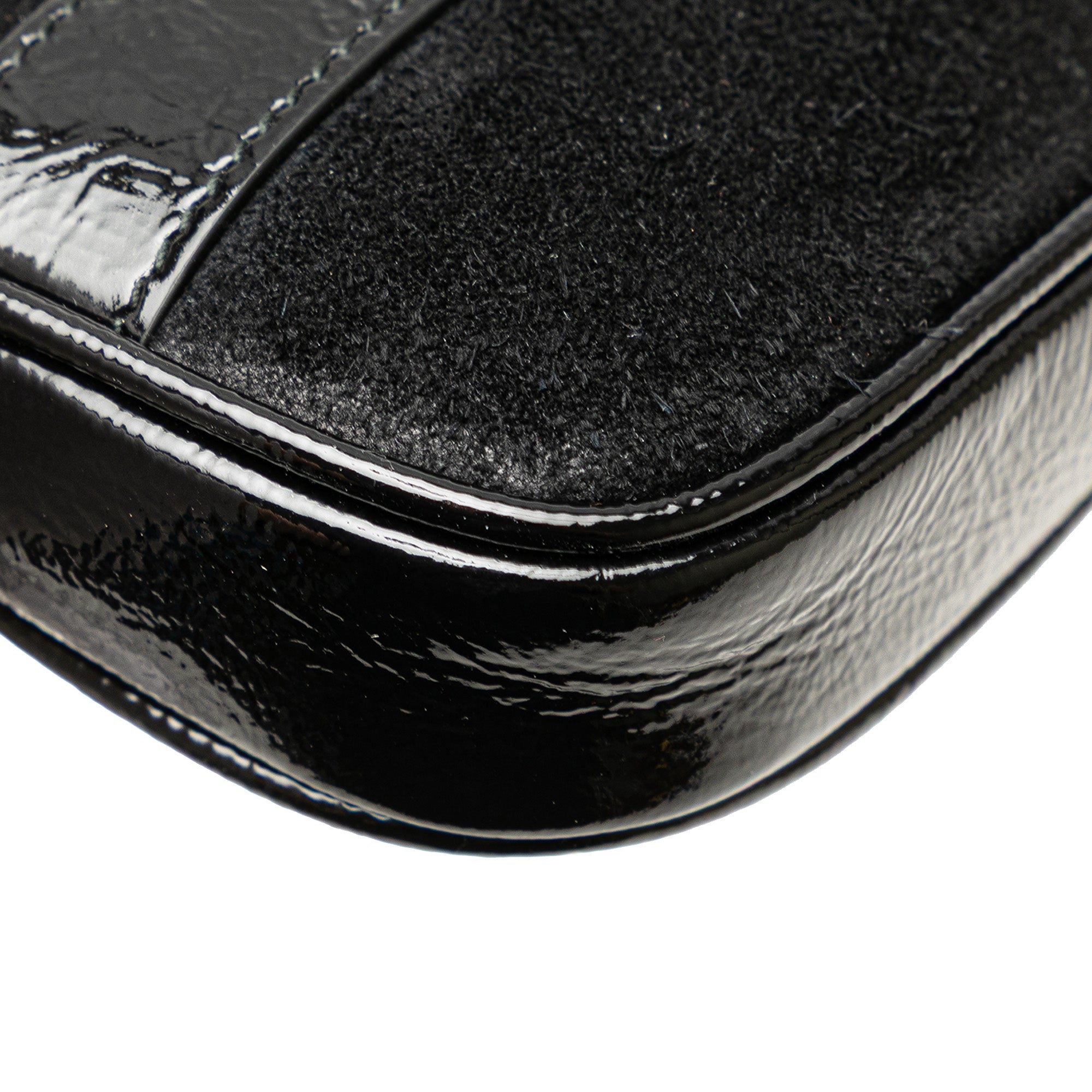 The Ophidia belt bag features a suede body with patent leather trim, a flat leather waist strap, a top zip closure, and interior slip pockets. Inclusion: Dust bag. Retail Price: 1350.00