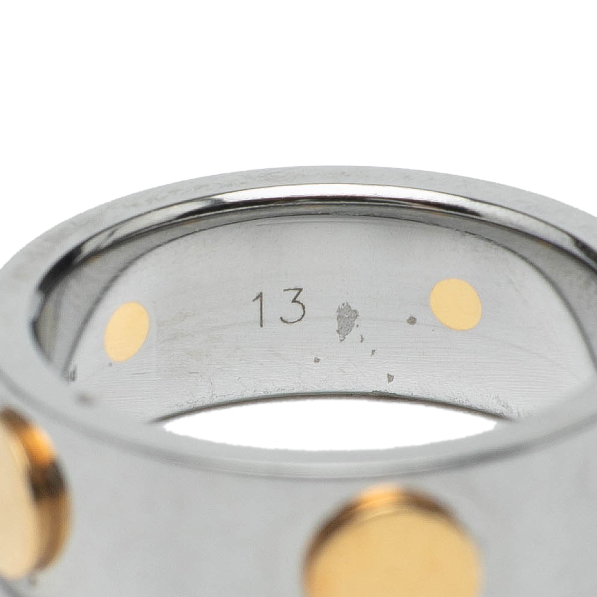 This ring features a stainless steel and yellow gold plated metal body. US Ring Size: 6.50 Retail Price: 450.00