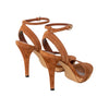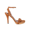 Gucci Suede Ankle Strap Heels in brown suede with GG emblem, thin strap upper, cork platform, and elegant heel.