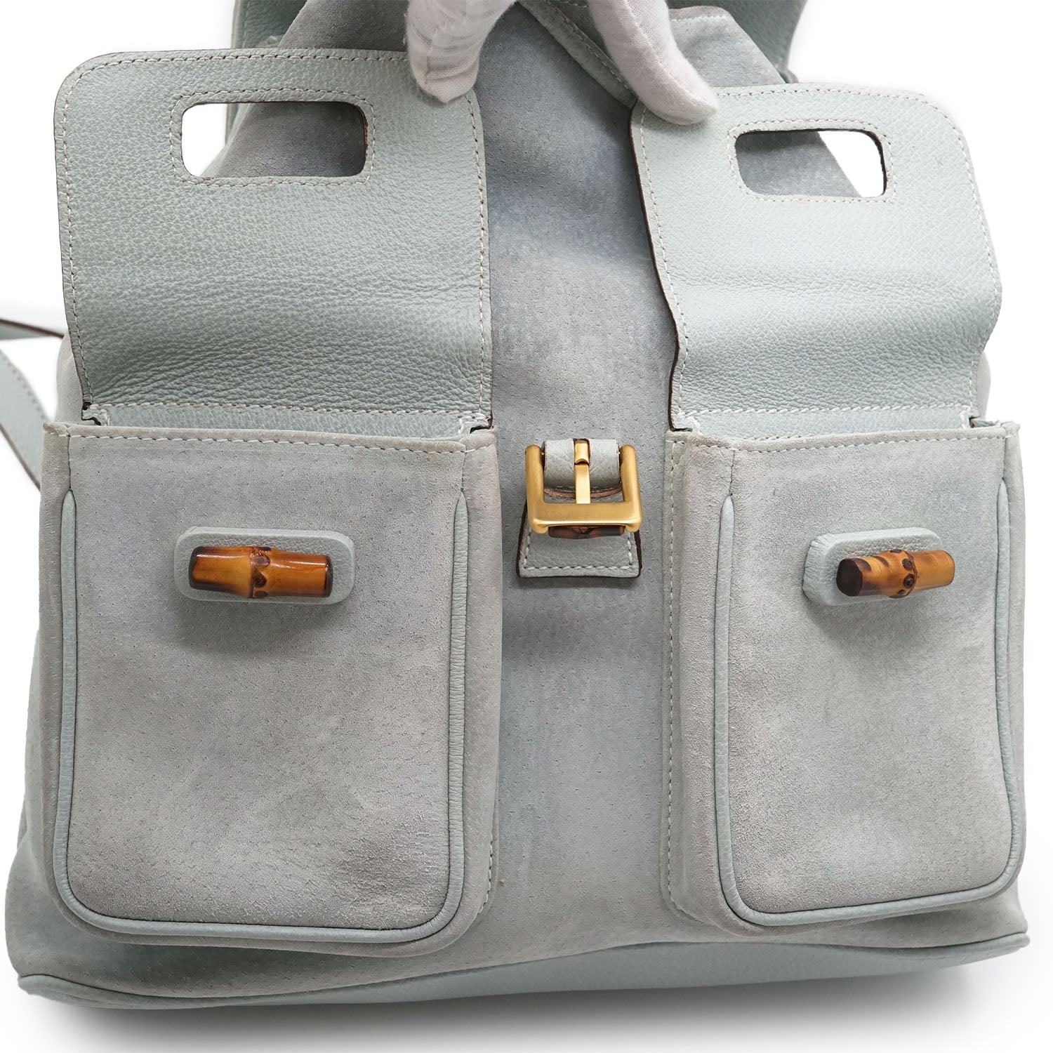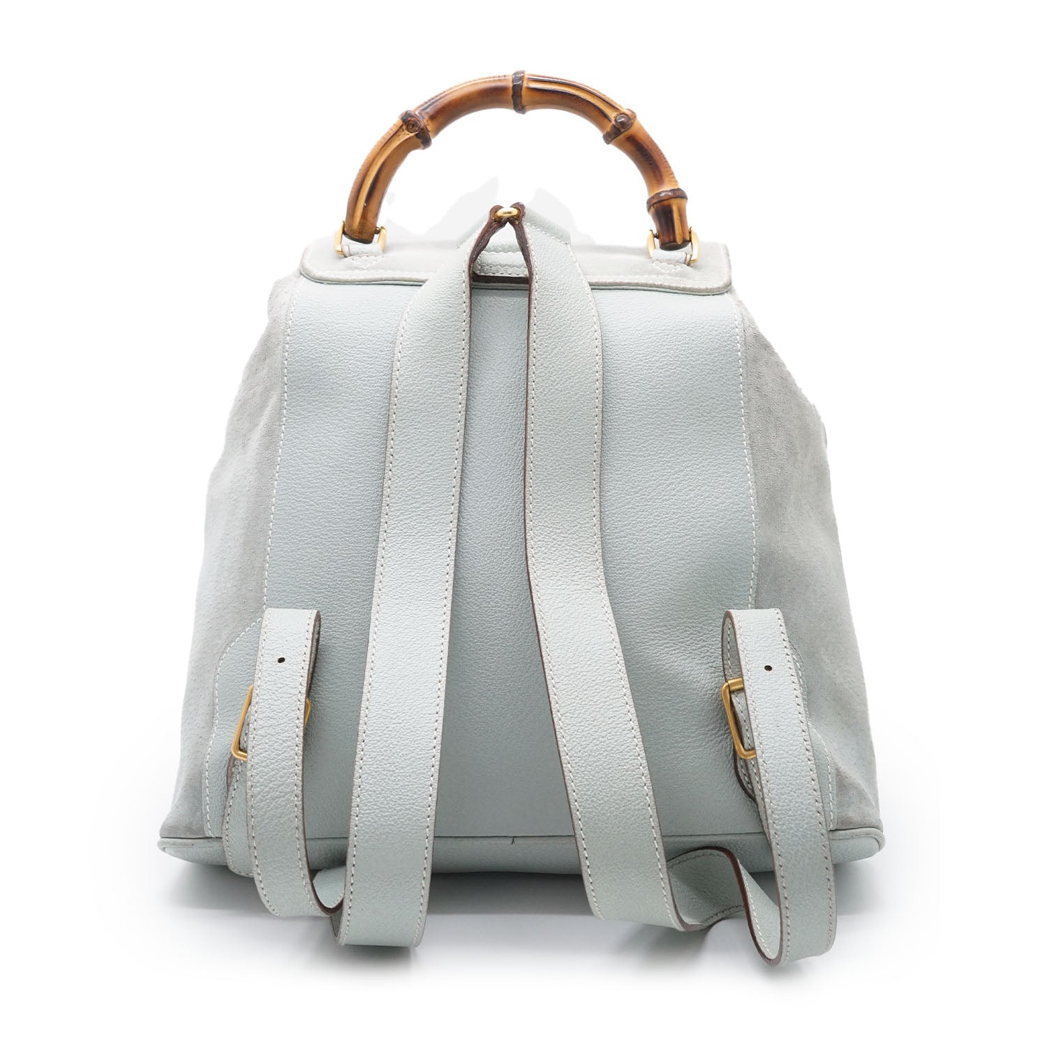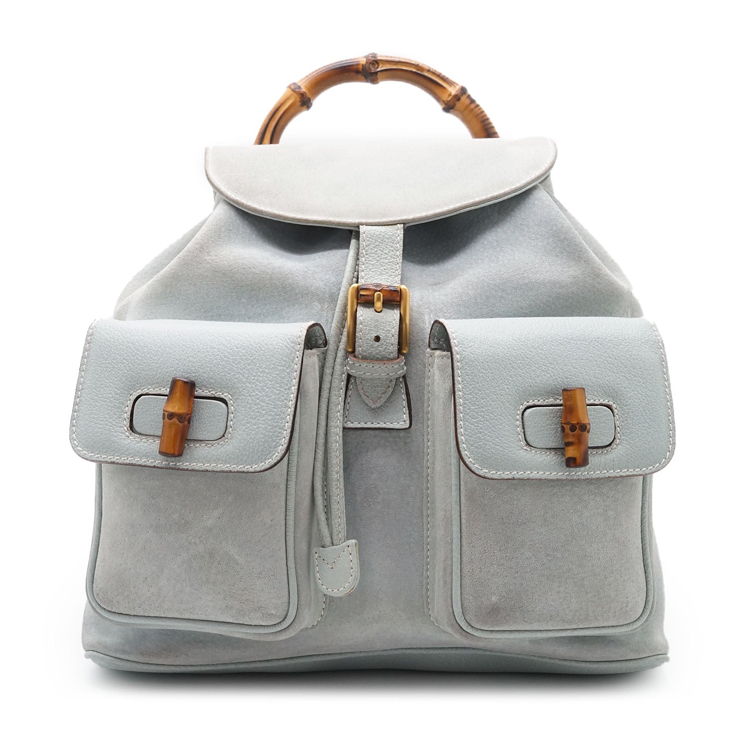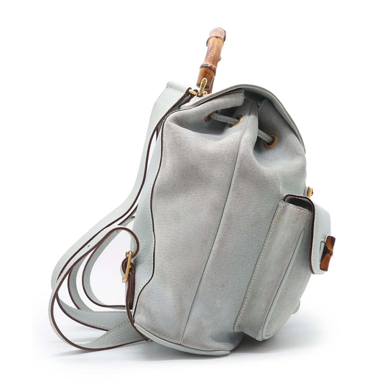 Vintage Bamboo Suede Backpack GM Light blue Suede, LeatherDepth: 9.5cmHeight: 30cmWidth: 30cmShoulder Drop: 36cmBOutside Rank: BInside Rank: ABStain: Faint dark discoloration on the outside (near the front pocket)Discoloration: Slight suede discolorationWorn: No visible signs of wearOdor: No odor presentSerial code: 003.2058.0016SKU: 7070072