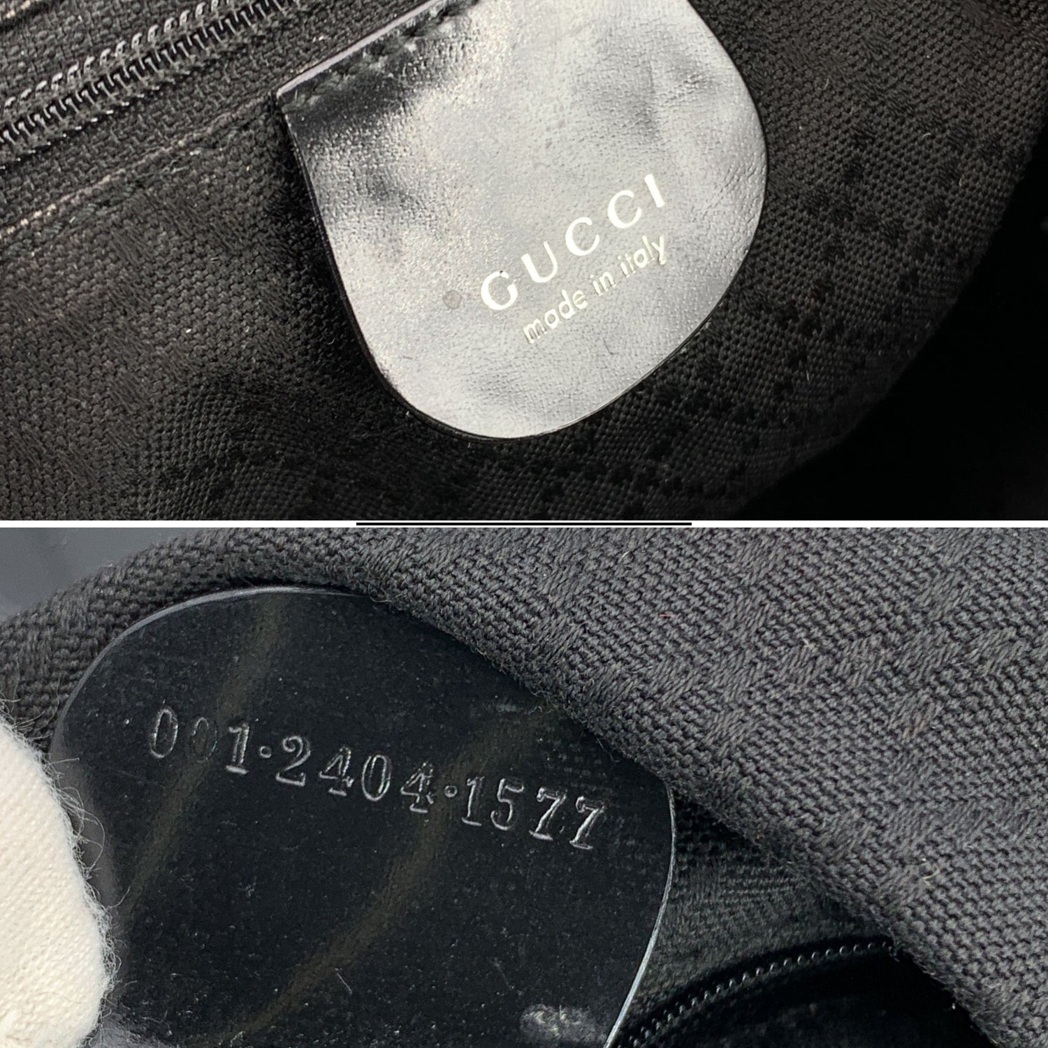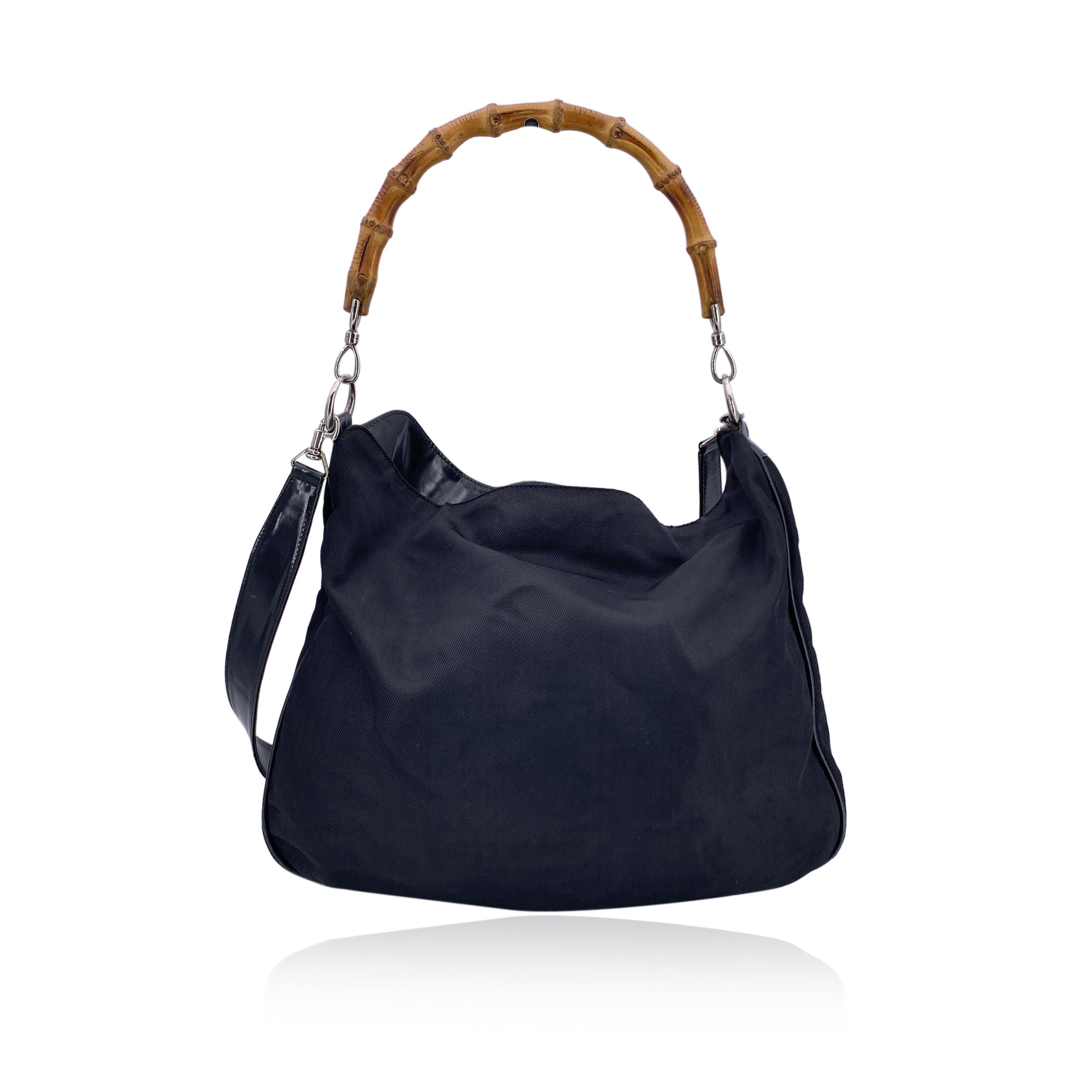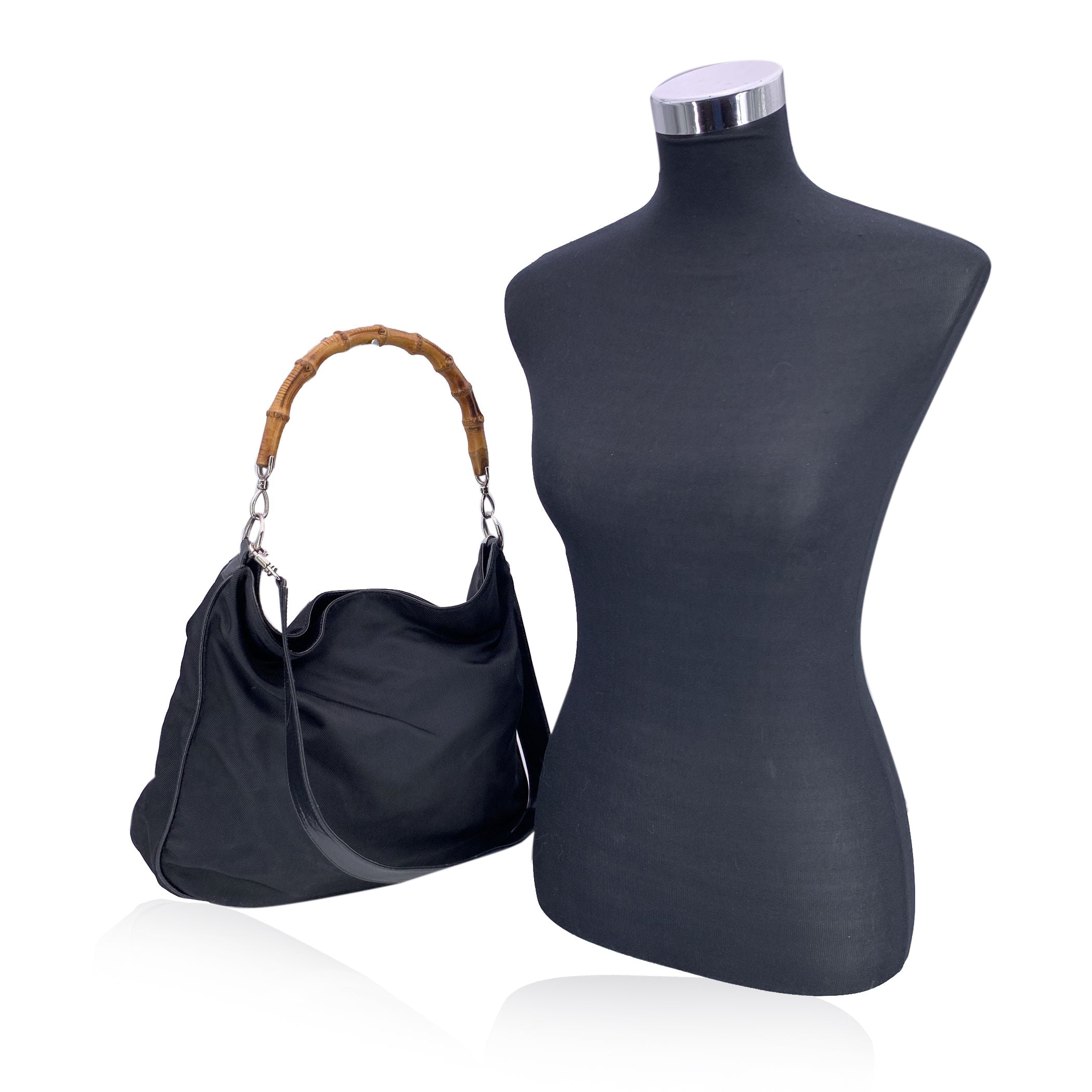 This Beautiful Gucci Hobo Bag Is Crafted From Sleek Black Nylon Canvas And Features The Brand's Signature Bamboo Loop Handle, Offering a Refined Yet Modern Aesthetic. The Bag Closes With An Upper Magnetic Button For Easy Access And Is Accented With Gold-tone Metal Hardware That Adds a Touch Of Elegance. Inside, It Is Lined With Black Fabric And Includes a Convenient Side Zip Pocket For Essentials. A Removable Shoulder Strap Allows For Versatile Styling. The Interior Also Features a Leather Tag Stamped With "Gucci - Made In Italy," With The Serial Number Embossed On The Reverse-an Authentic Mark Of Gucci's Renowned Craftsmanship.