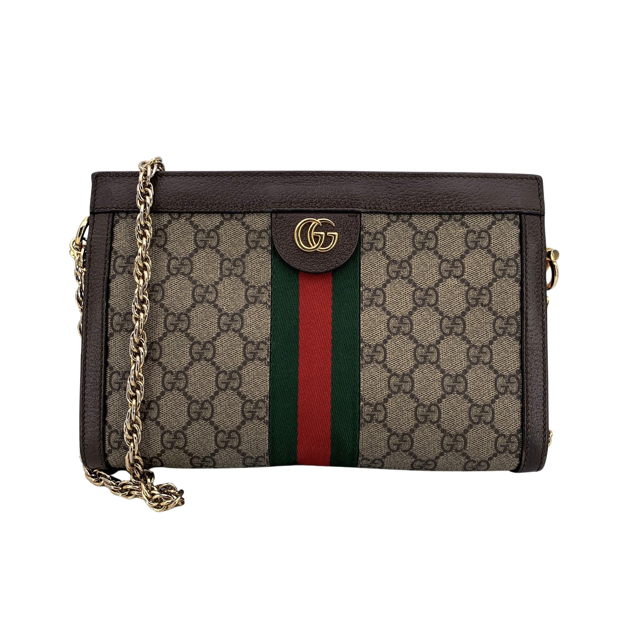 Step Into The World Of Gucci With The Ophidia Shoulder Bag, An Exquisite Piece From The Cruise 2018 Collection That Effortlessly Blends Retro Charm With Modern Style. Crafted From Beige Gg Supreme Monogram Canvas, This Bag Is Accented With Rich Brown Leather Trim, Giving It An Air Of Sophistication And Timeless Appeal. The Iconic Gold Metal Gg Logo On The Front Nods To Gucci's 70s Archives, While The Signature Green/red/green Stripes, Featured Both On The Front And Back, Bring a Playful Yet Classic Touch. Designed With Versatility In Mind, This Shoulder Bag Comes With a Gold Metal Chain Strap That Adds a Touch Of Glamour And Can Be Worn Comfortably On The Shoulder. The Bag's Double Hidden Magnetic Button Closure Ensures Easy Access While Keeping Your Essentials Secure. Inside, The Teal Silk Lining Offers a Pop Of Color, With Two Main Sections And One Side Open Pocket, Perfect For Organizing Your Items. From a Smartphone, a Long Wallet, And Lipstick, This Bag Comfortably Holds Your Everyday Essentials. The 'Gucci - Made In Italy' Tag Inside, With Its Serial Number On The Reverse, Ensures The Bag's Authenticity And Luxurious Craftsmanship. The Ophidia Shoulder Bag Is a Statement Piece That Beautifully Honors Gucci's Rich Heritage While Embracing a Contemporary Sensibility, Making It a Must-have For The Style-conscious. Retail Price Is 1750 Euros.