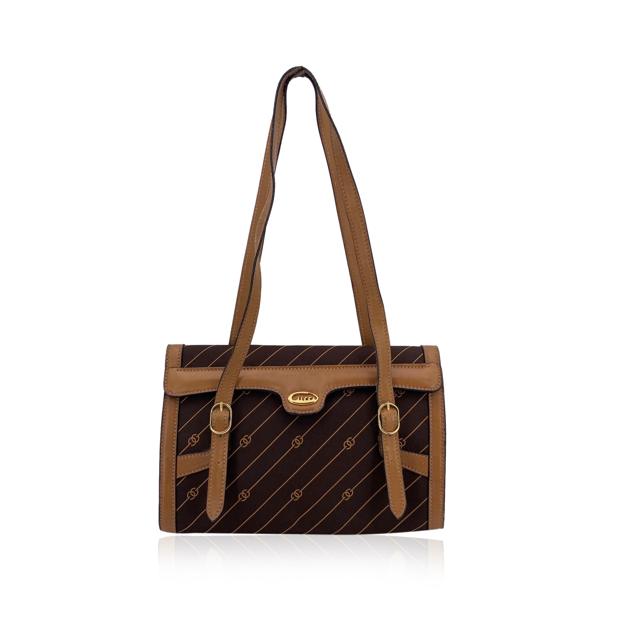 Embrace a Piece Of Vintage Luxury With This Gucci Shoulder Bag, a Timeless Classic That Perfectly Blends Iconic Design With Practicality. Crafted In Rich Brown Canvas Adorned With Gucci's Signature Stripes And Gg Logo Pattern In Orange Color, This Bag Radiates Sophistication And Subtle Luxury. The Light Brown Leather Accents Add Warmth And Refinement, While The Gold Hardware And Striking Silver And Gold Metal Gucci Signature Logo Detailing On The Front Provide a Bold, Yet Elegant Touch. The Short Flap Closure Opens To Reveal a Spacious Interior With a Side Zip Pocket Offers Additional Storage For Smaller Items. With Adjustable Double Shoulder Strap, This Bag Is Designed For Comfort And Versatility, Allowing You To Wear It To Suit Your Style. The "Made In Italy By Gucci" Embossing Serves As a Mark Of Craftmanship, Highlighting The Quality Behind This Iconic Piece. Whether You're Running Errands Or Heading Out For a Night On The Town, This Vintage Gucci Shoulder Bag Adds a Touch Of Timeless Luxury To Any Outfit.