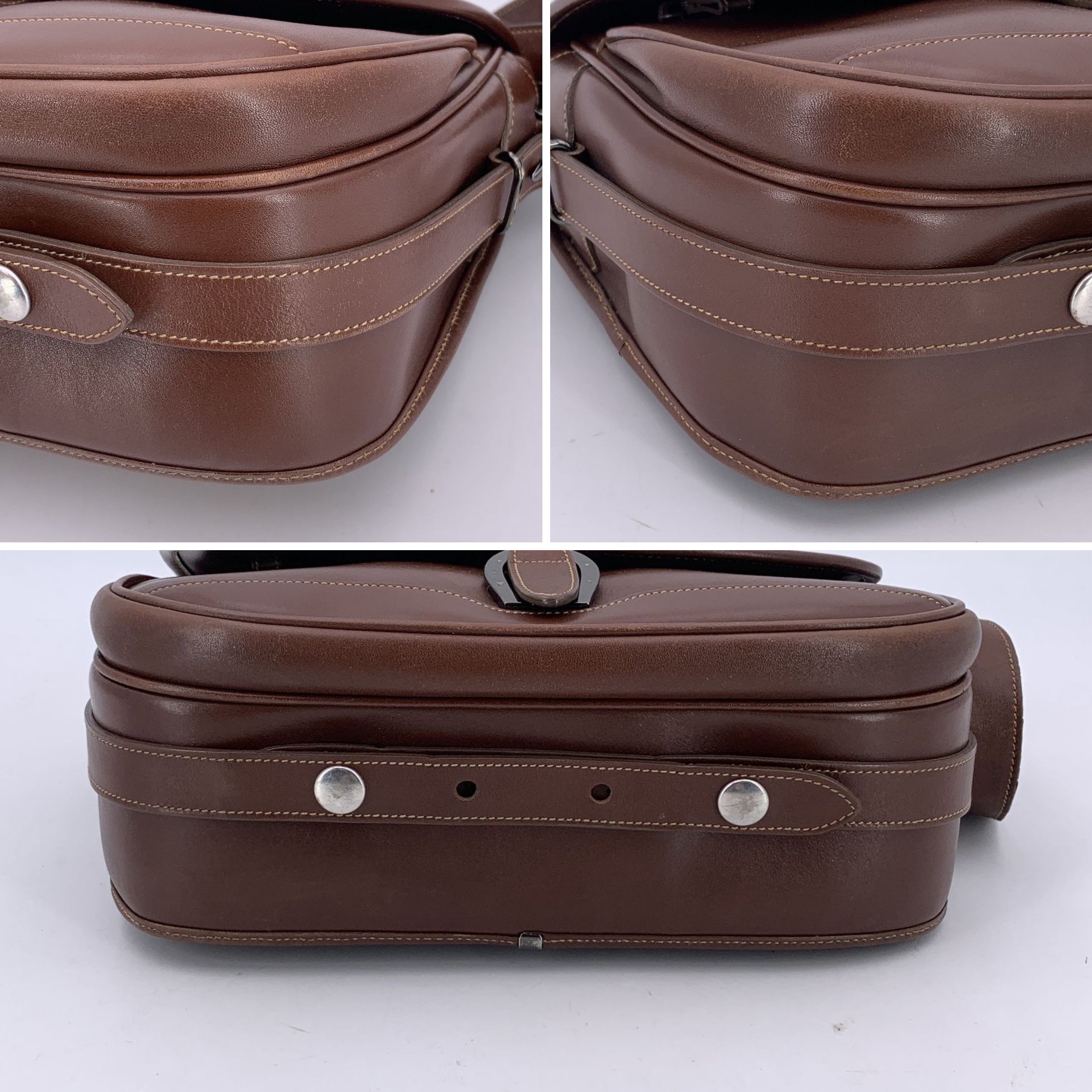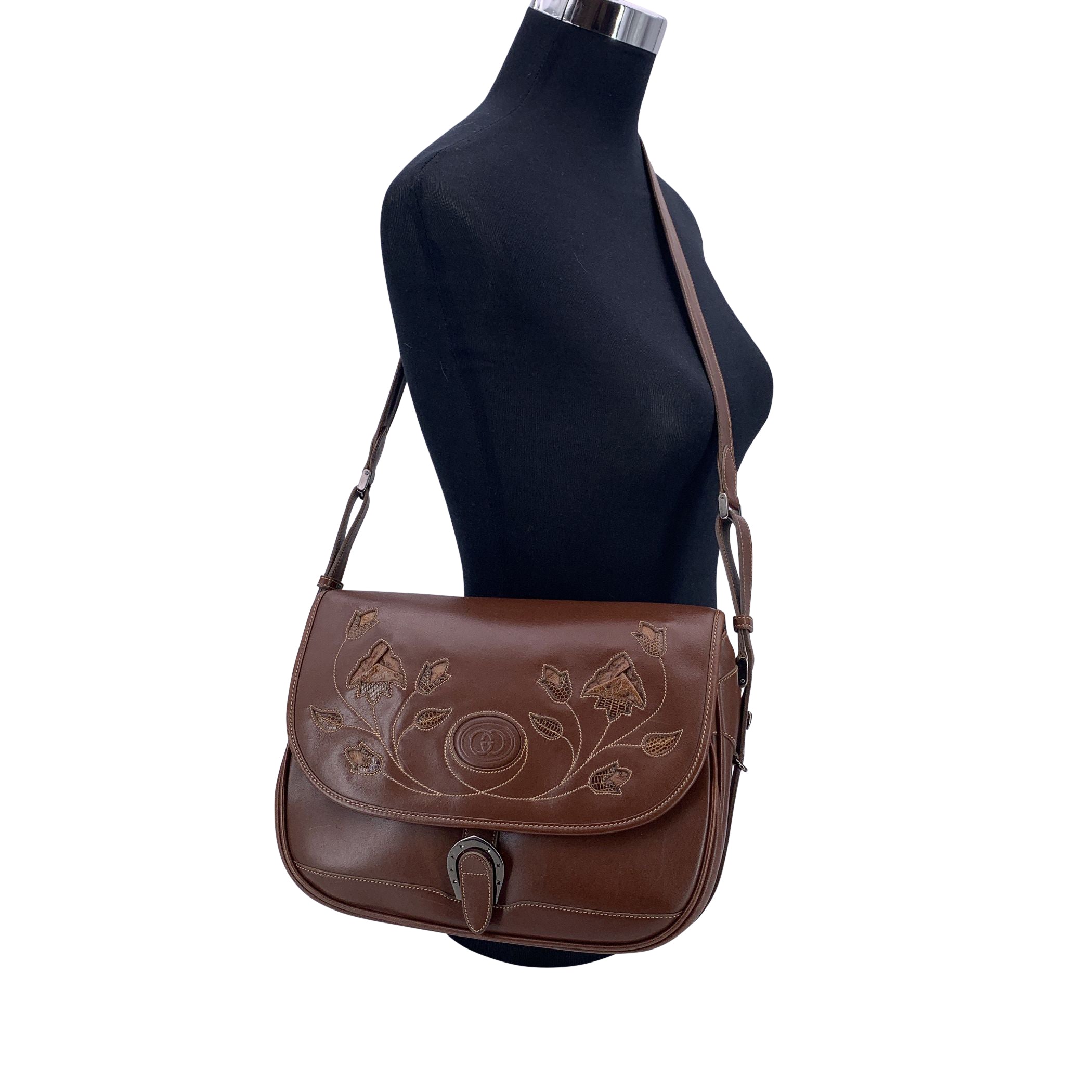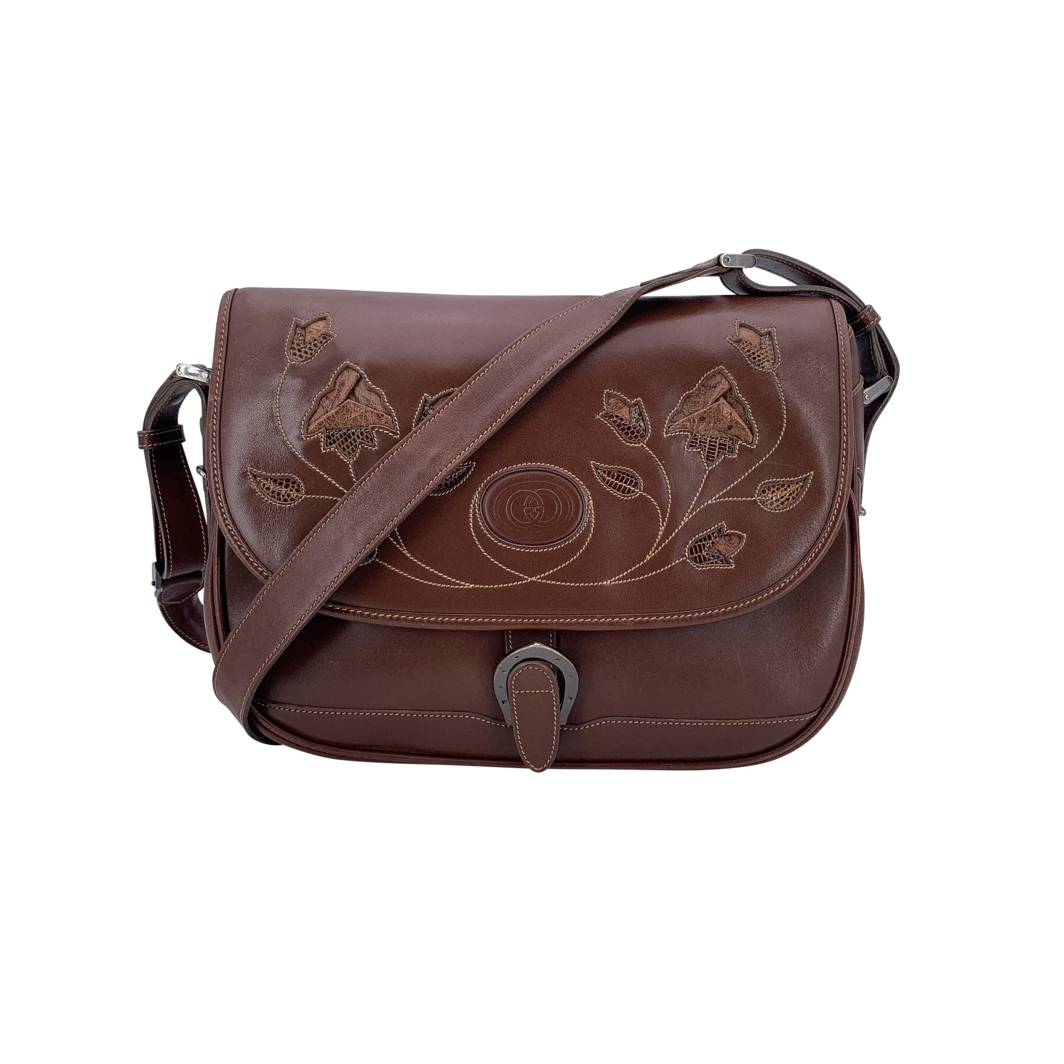 Sophisticated And Structured, This Vintage Gucci Shoulder Bag Is a True Reflection Of The House's Classic Elegance. Crafted In Brown Leather, It Features Beautiful Floral Cut-out Intarsia On The Flap, With Contrast Stitchings.The Flap, With a Beautiful Silver Metal Horseshoe-shaped Buckle, Opens To a Brown Suede-lined Interior, Thoughtfully Designed With Both a Side Zip Pocket And An Open Pocket For Organization. 1 Zip Pocket Under The Flap. Adjustable Shoulder Strap. Inside, The Embossed 'Gucci -Made In Italy' Tag Confirms Its Heritage (With Serial Number On Its Reverse). A Timeless Piece With Understated Refinement, This Box Bag Embodies The Enduring Charm Of Gucci's Vintage Designs.