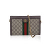 Step Into The World Of Gucci With The Ophidia Shoulder Bag, An Exquisite Piece From The Cruise 2018 Collection That Effortlessly Blends Retro Charm With Modern Style. Crafted From Beige Gg Supreme Monogram Canvas, This Bag Is Accented With Rich Brown Leather Trim, Giving It An Air Of Sophistication And Timeless Appeal. The Iconic Gold Metal Gg Logo On The Front Nods To Gucci's 70s Archives, While The Signature Green/red/green Stripes, Featured Both On The Front And Back, Bring a Playful Yet Classic Touch. Designed With Versatility In Mind, This Shoulder Bag Comes With a Gold Metal Chain Strap That Adds a Touch Of Glamour And Can Be Worn Comfortably On The Shoulder. The Bag's Double Hidden Magnetic Button Closure Ensures Easy Access While Keeping Your Essentials Secure. Inside, The Teal Silk Lining Offers a Pop Of Color, With Two Main Sections And One Side Open Pocket, Perfect For Organizing Your Items. From a Smartphone, a Long Wallet, And Lipstick, This Bag Comfortably Holds Your Everyday Essentials. The 'Gucci - Made In Italy' Tag Inside, With Its Serial Number On The Reverse, Ensures The Bag's Authenticity And Luxurious Craftsmanship. The Ophidia Shoulder Bag Is a Statement Piece That Beautifully Honors Gucci's Rich Heritage While Embracing a Contemporary Sensibility, Making It a Must-have For The Style-conscious. Retail Price Is 1750 Euros.