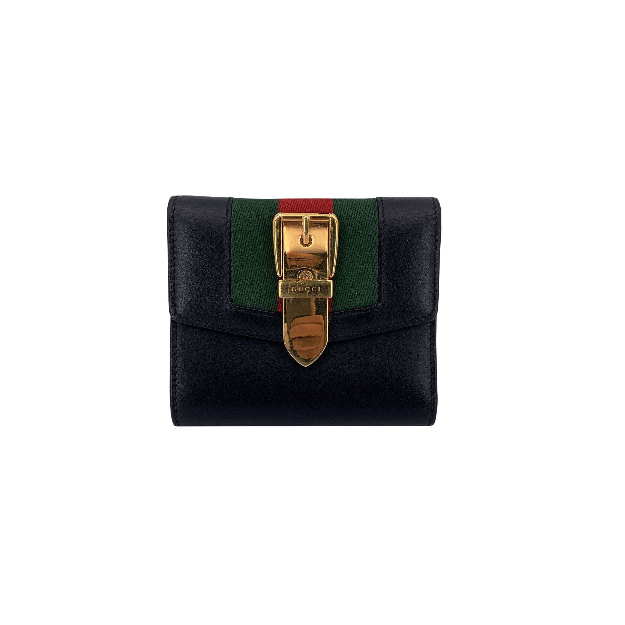 A Classic From The House Of Gucci, This "Sylvie" Trifold Wallet Beautifully Reflects The Elegance Of The Iconic Handbag Line. Expertly Crafted In Black Leather, It Features The Instantly Recognizable Green-red-green Web Stripe Framed By a Polished Gold-tone Buckle Detail On The Front - a True Emblem Of Gucci's Heritage. The Interior, Lined In Supple Leather, Is Thoughtfully Designed With 4 Credit Card Slots, 4 Open Pockets, And 1 Bill Compartment, Balancing Functionality With Sophistication. Inside, The Piece Is Stamped With "Gucci - Made In Italy" And Its Unique Serial Number, Confirming Its Authenticity. A Refined Accessory That Carries The Bold Spirit Of The Sylvie Collection, This Wallet Combines Timeless Craftsmanship With Gucci's Signature Flair.
