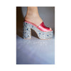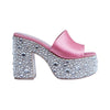 Diamonds are everyone’s best friend. A cascade of crystals that decors the heel. The shoe to be worn with modesty at any occasion. Light weight cork wedge covered with crystals on nappa leather. A mule sandal made of silk satin. Remarks: There are some spots inside the sole.