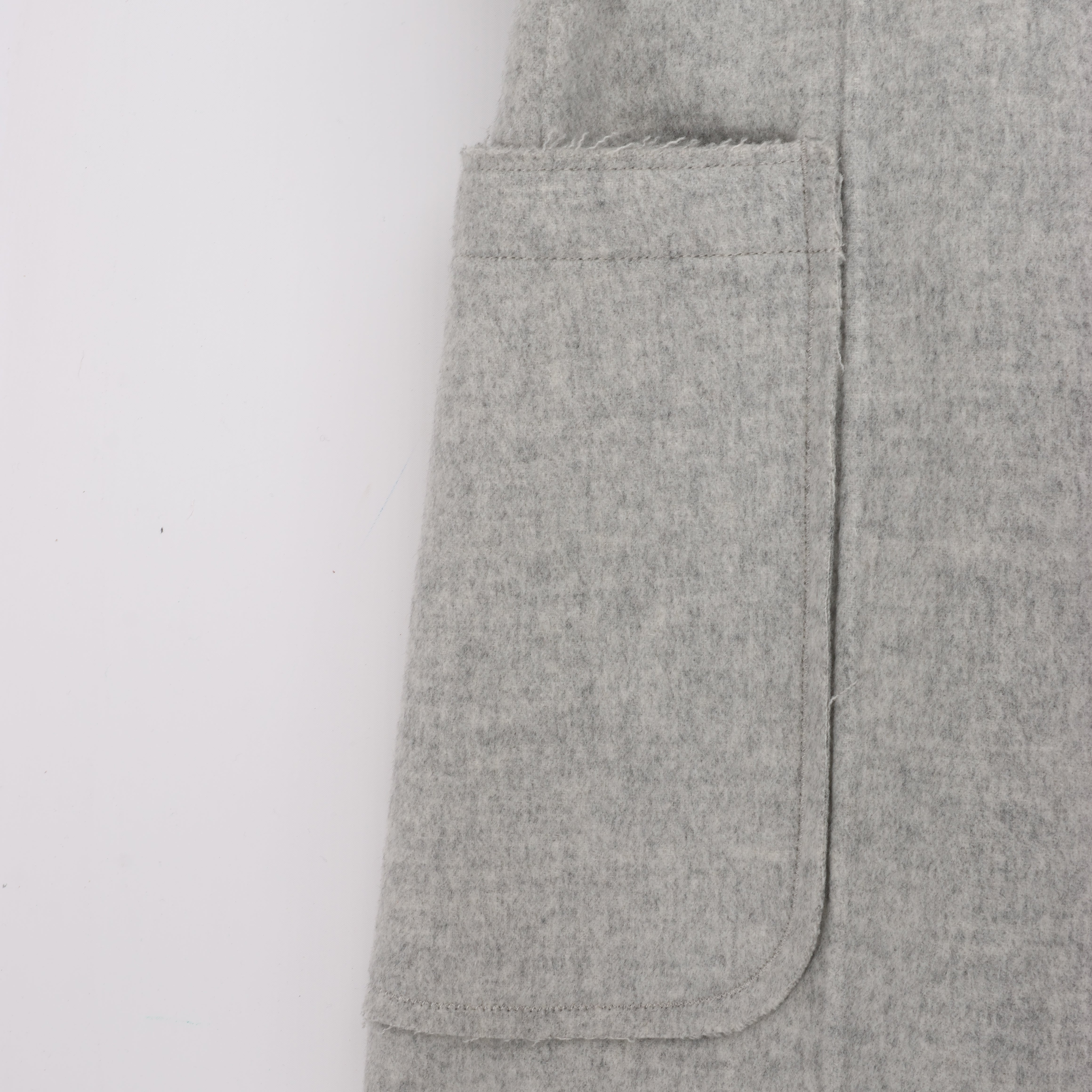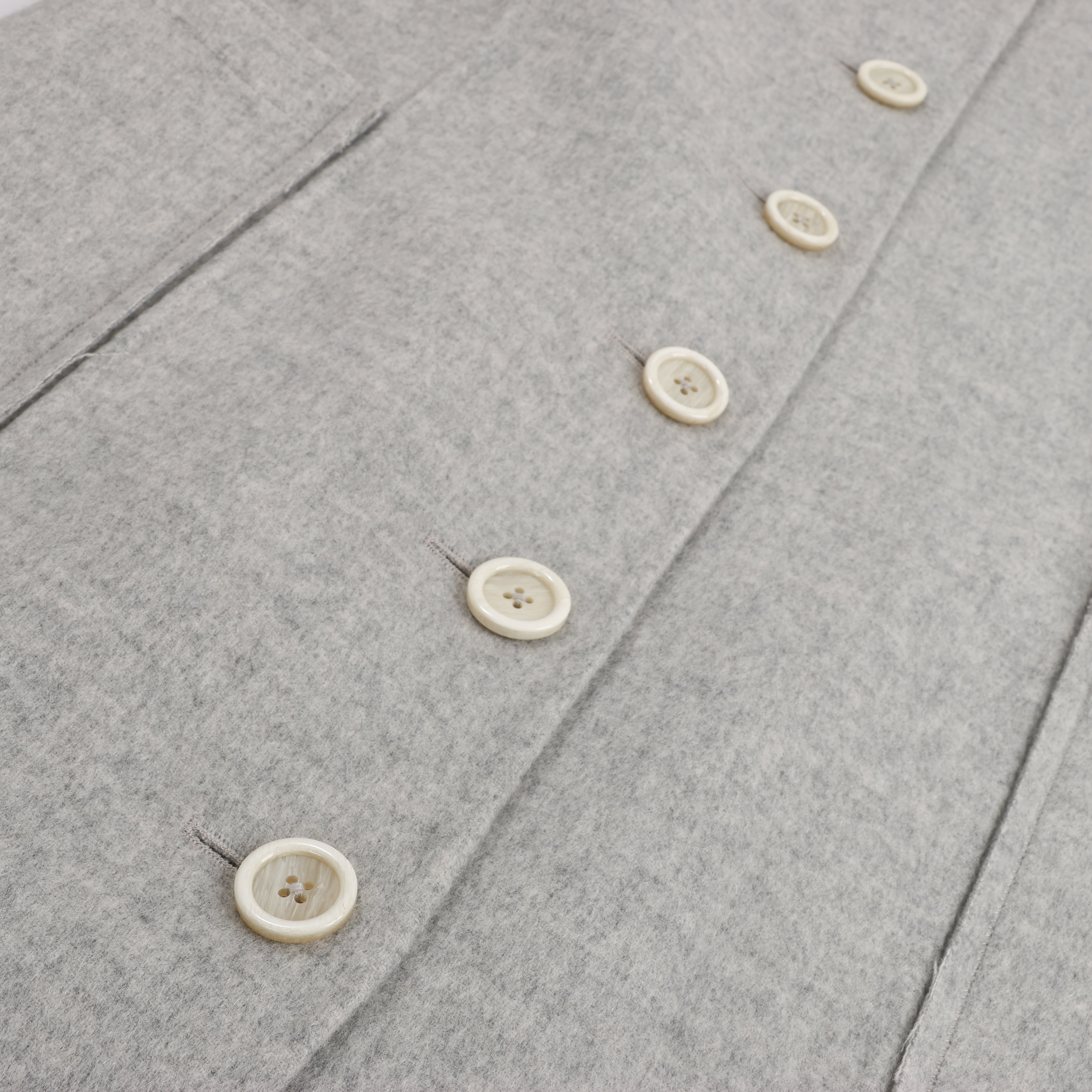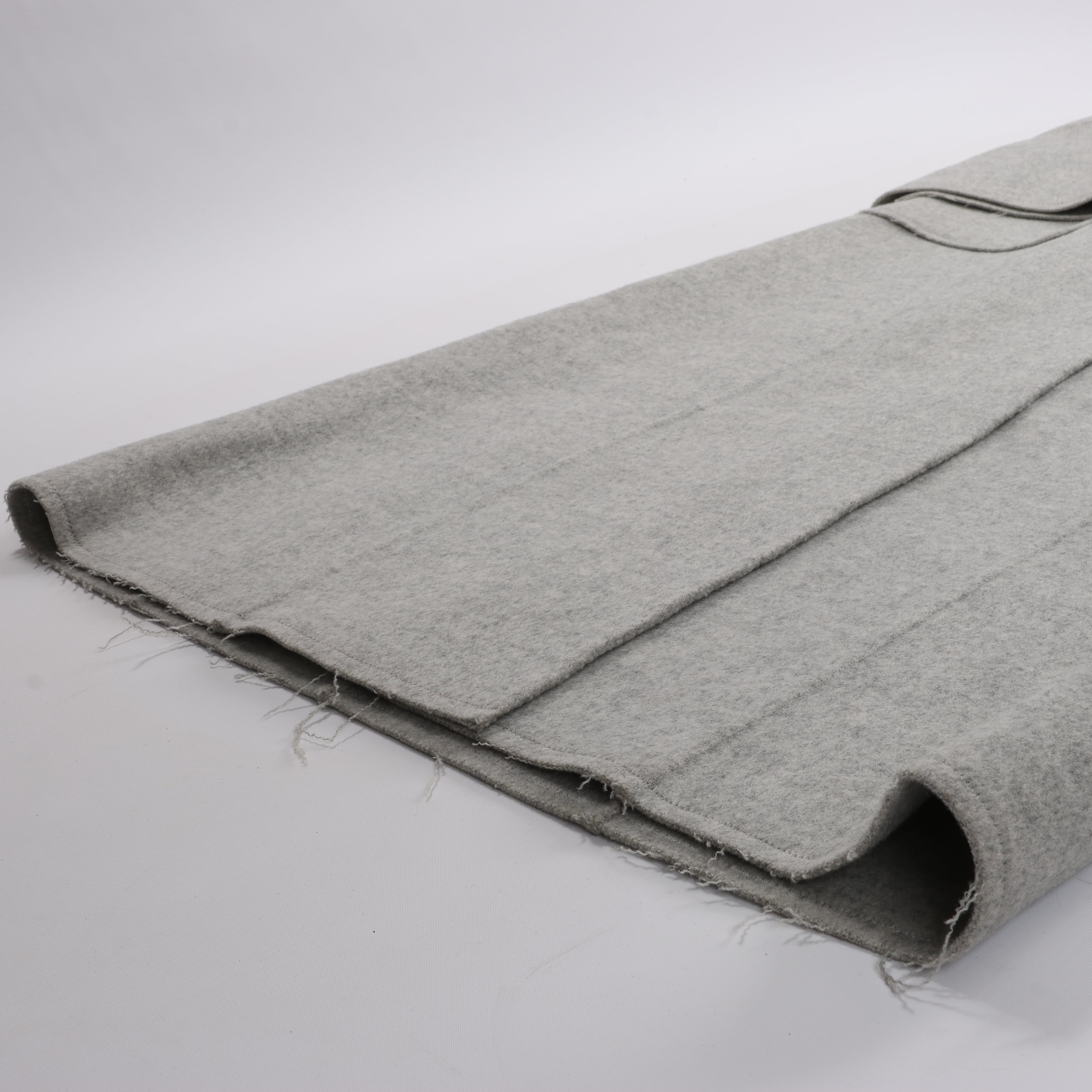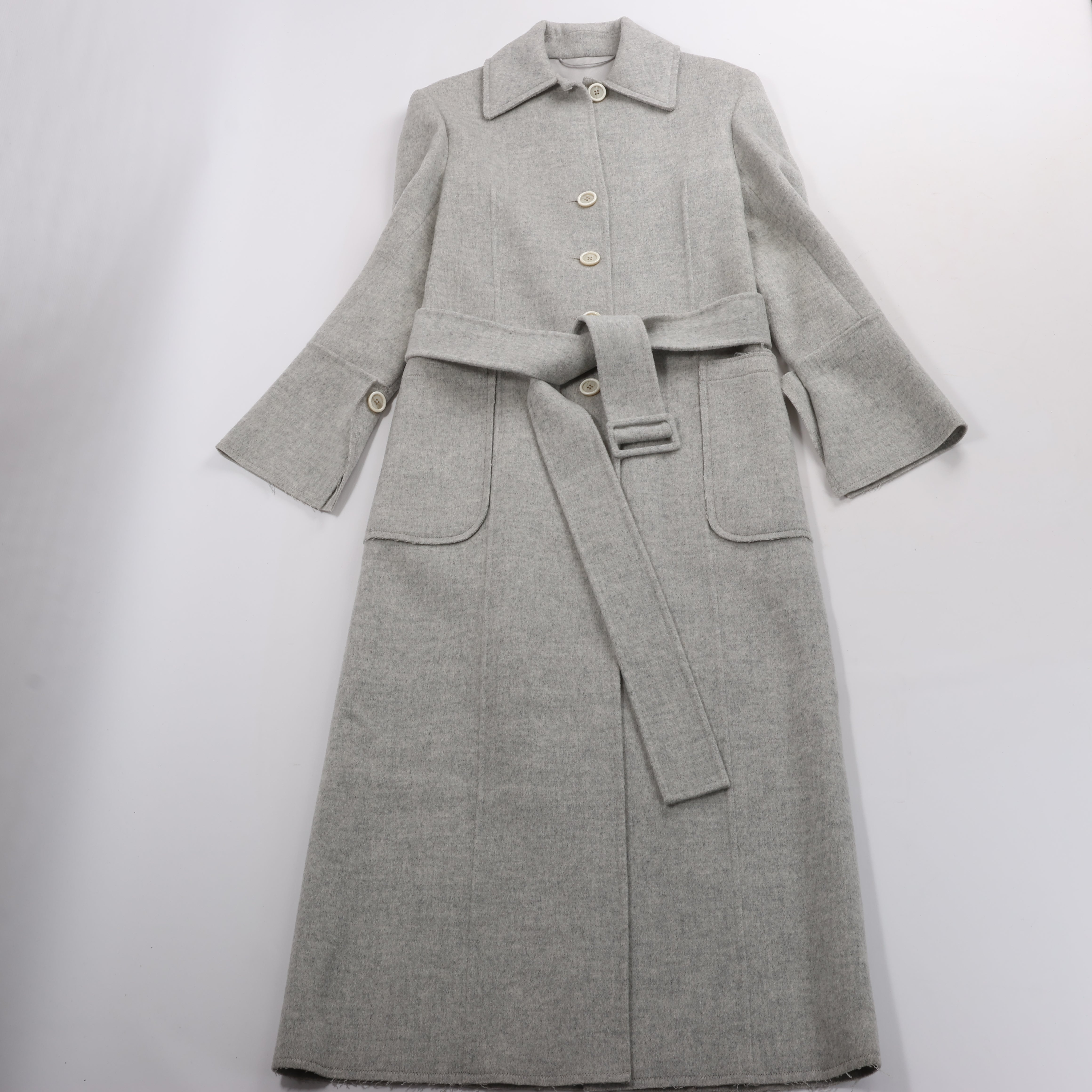 This Helmut Lang double-faced wool coat in a minimalist grey features a belted waist, oversized pockets, and a structured collar. The raw hem and clean lines deliver a sleek, modern silhouette for understated luxury.