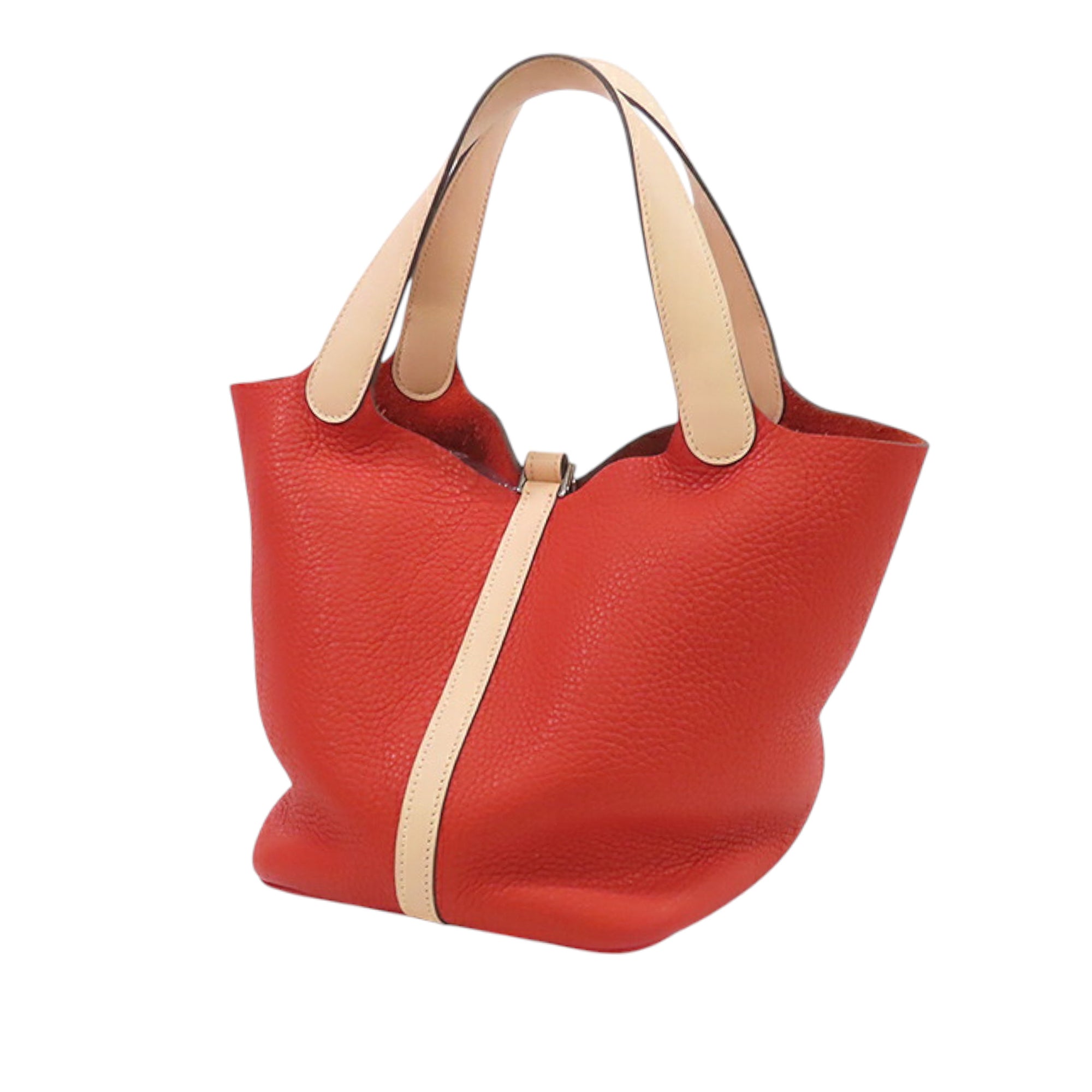 The Picotin Lock 22 features a clemence leather body with swift leather trim, flat leather handles, and an open top with a flat strap and buckle closure. Retail Price: 5500.00