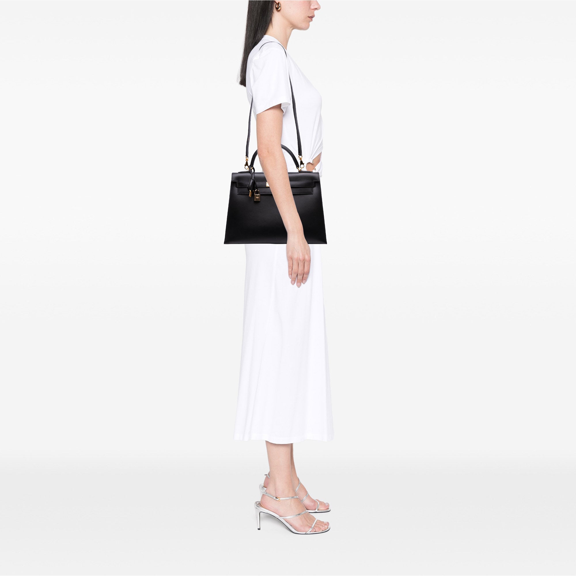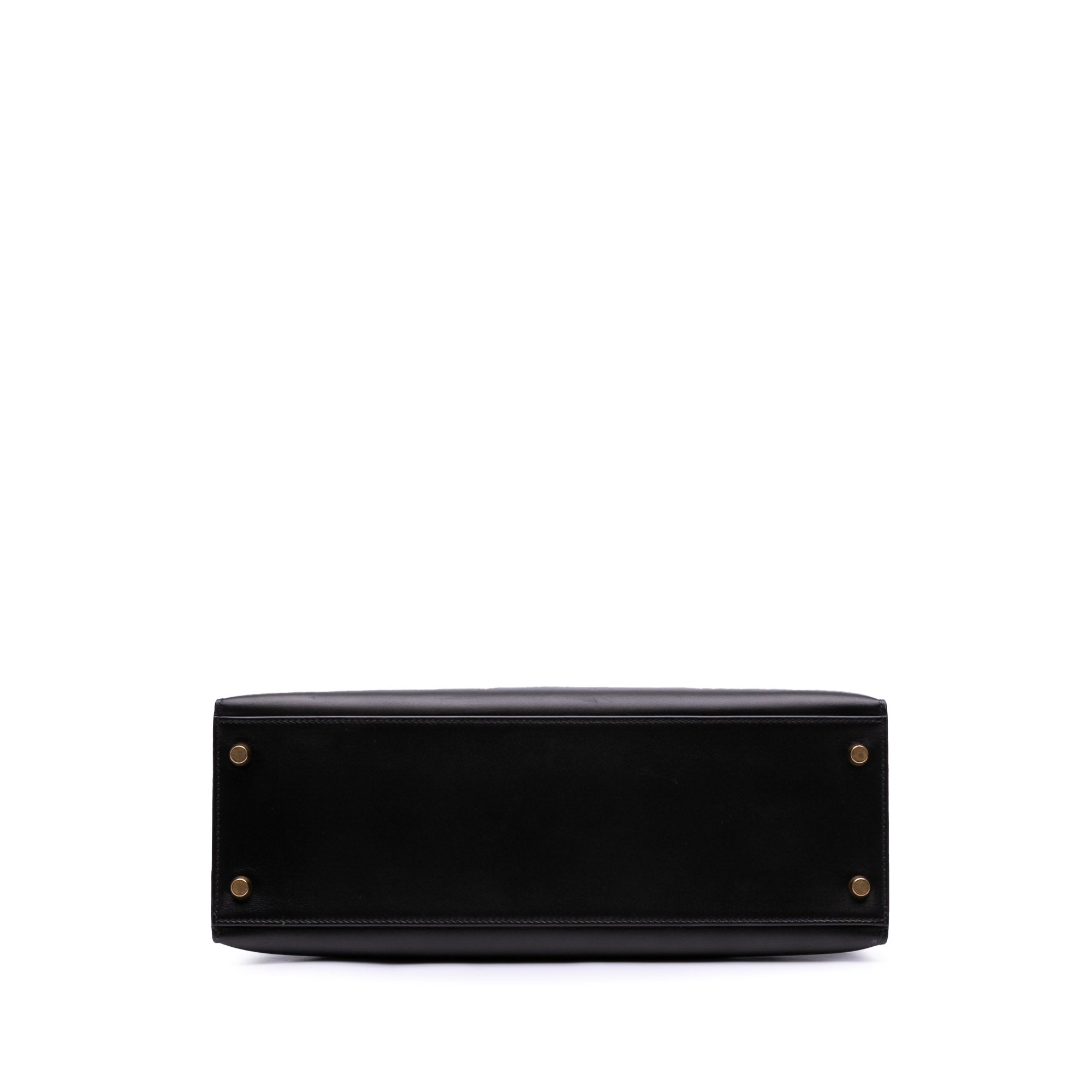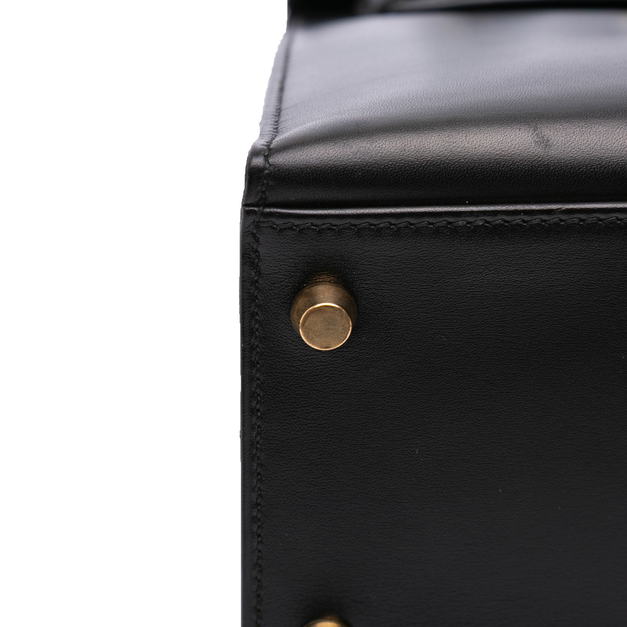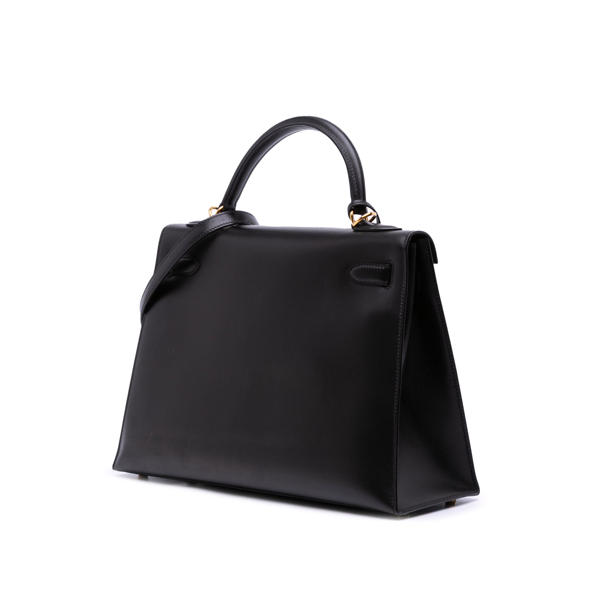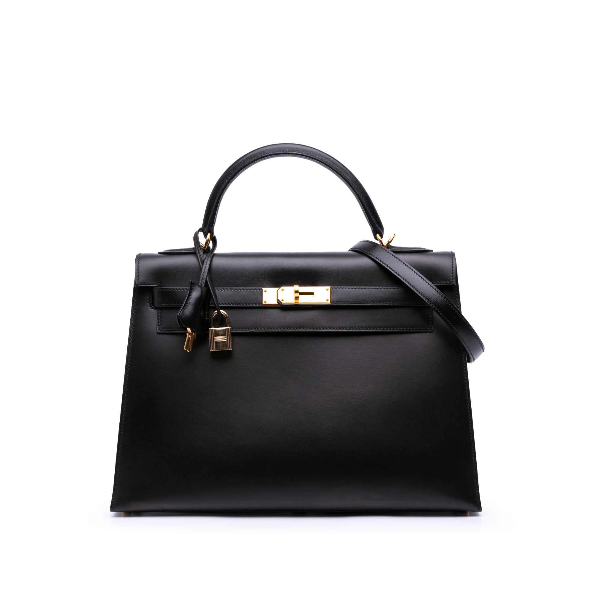 This Kelly 32 features a Box Calf leather body in Noir color, a flat top handle, a detachable flat leather strap, a top flap with twist lock closure, gold-tone hardware, and interior zip and slip pockets. Inclusion: Dust bag. Retail Price: 18000.00