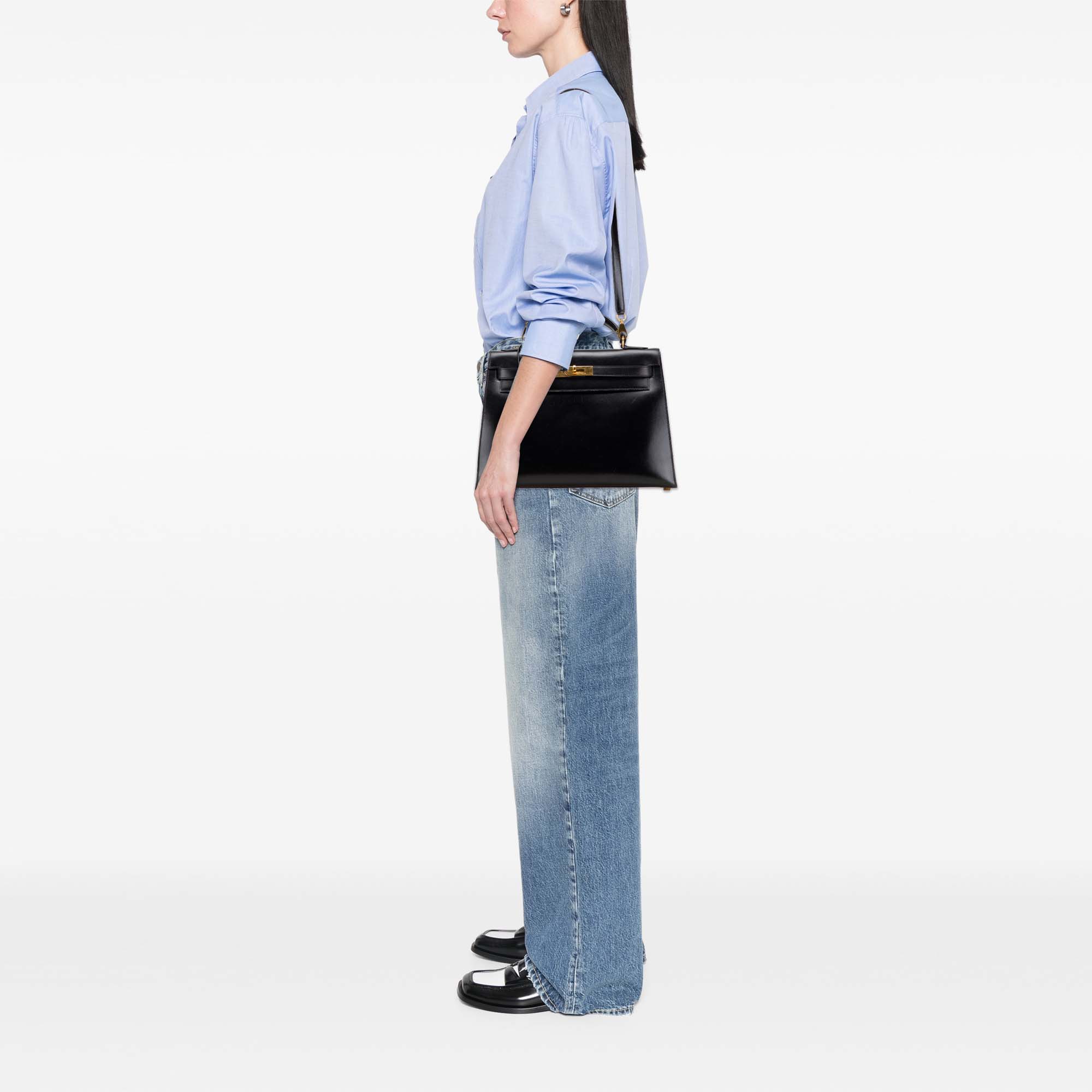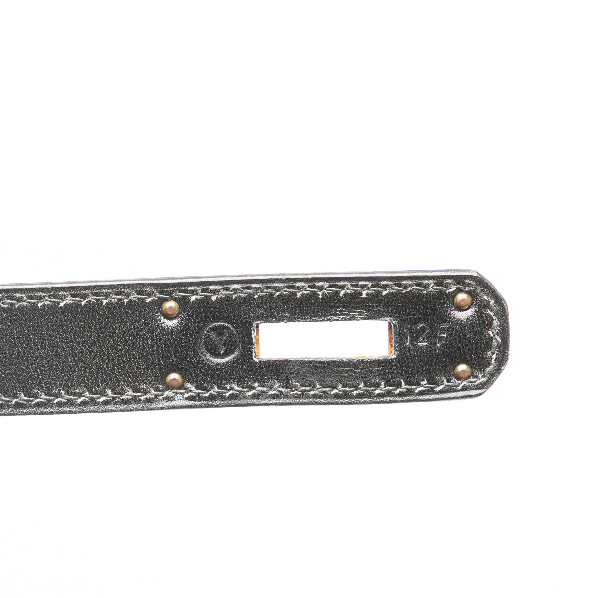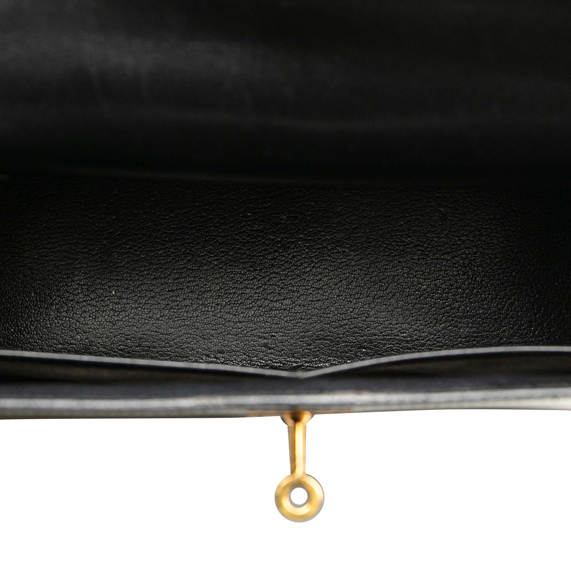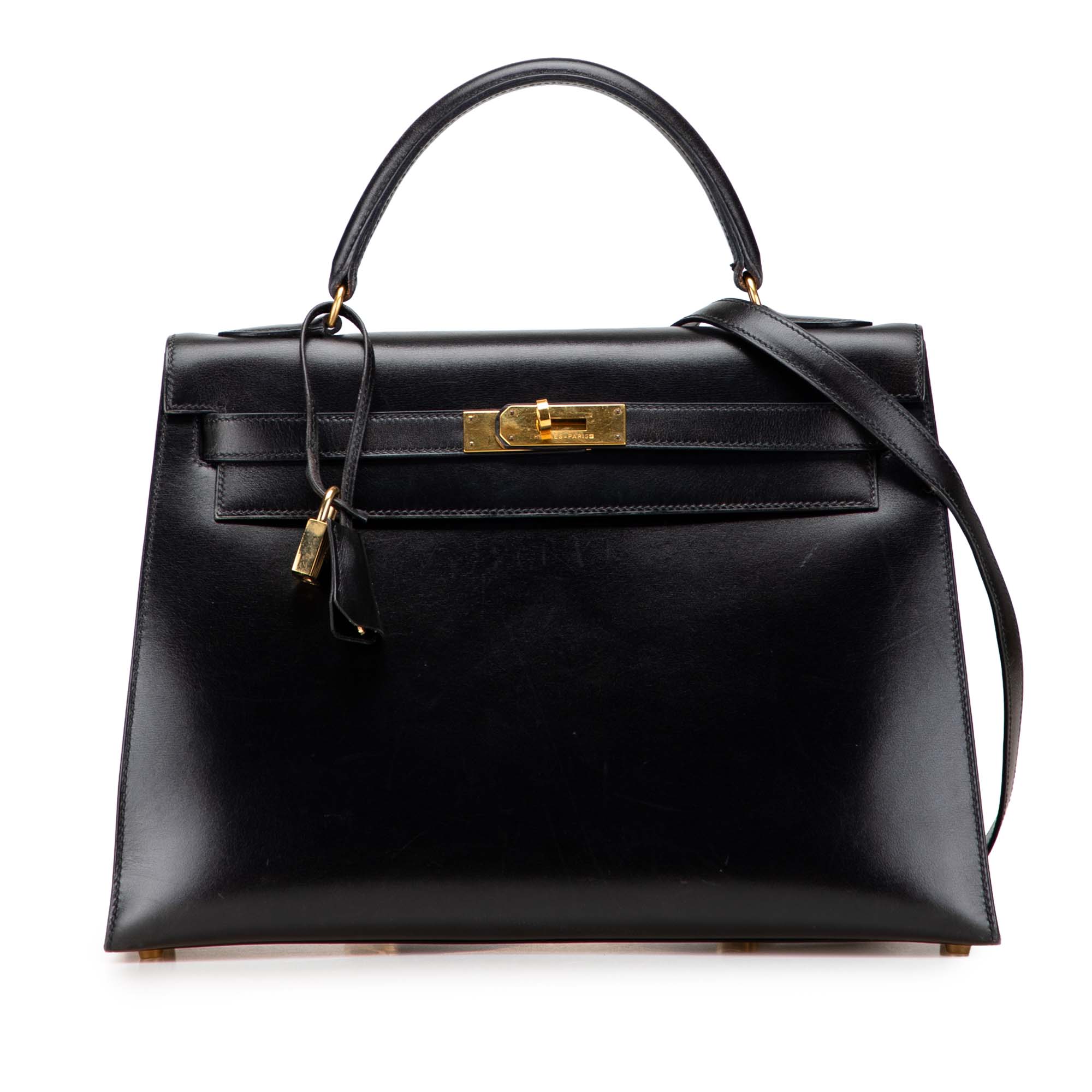 This Kelly 32 Box features a Box Calf leather body in Noir color, a flat top handle, a detachable strap, a top front flap with a twist lock closure, and interior zip and slip pockets. Retail Price: 18000.00