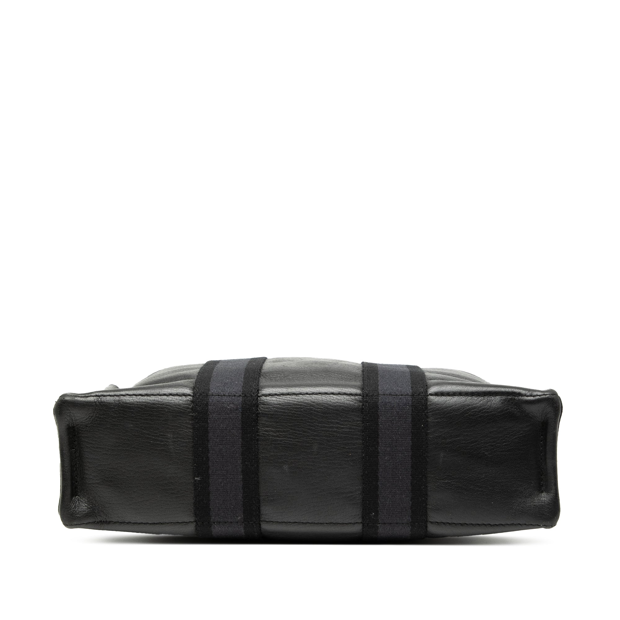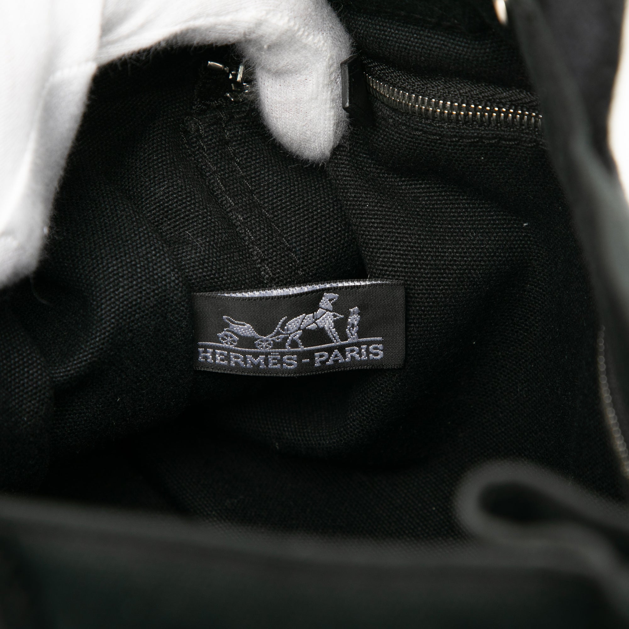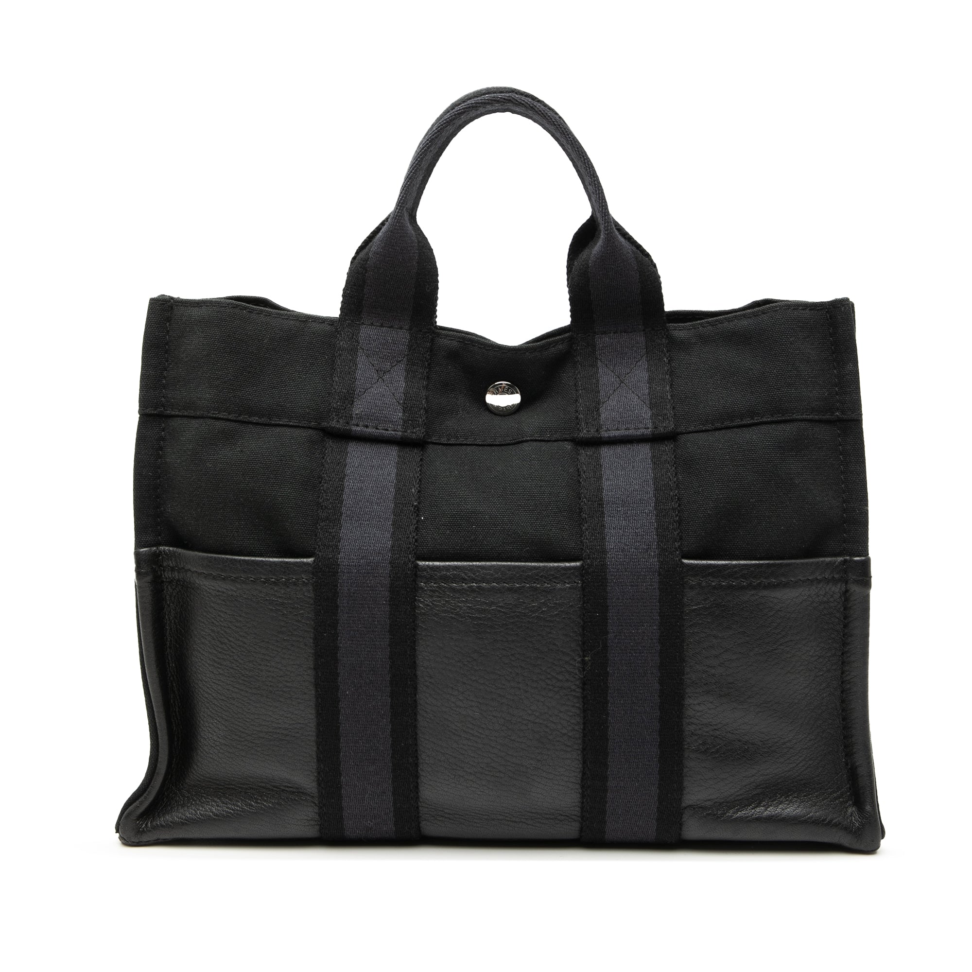 This Fourre Tout PM tote features a canvas and calf leather body, a top snap button closure, flat fabric straps, exterior slip pockets, and an interior zip pocket. Retail Price: 995.00