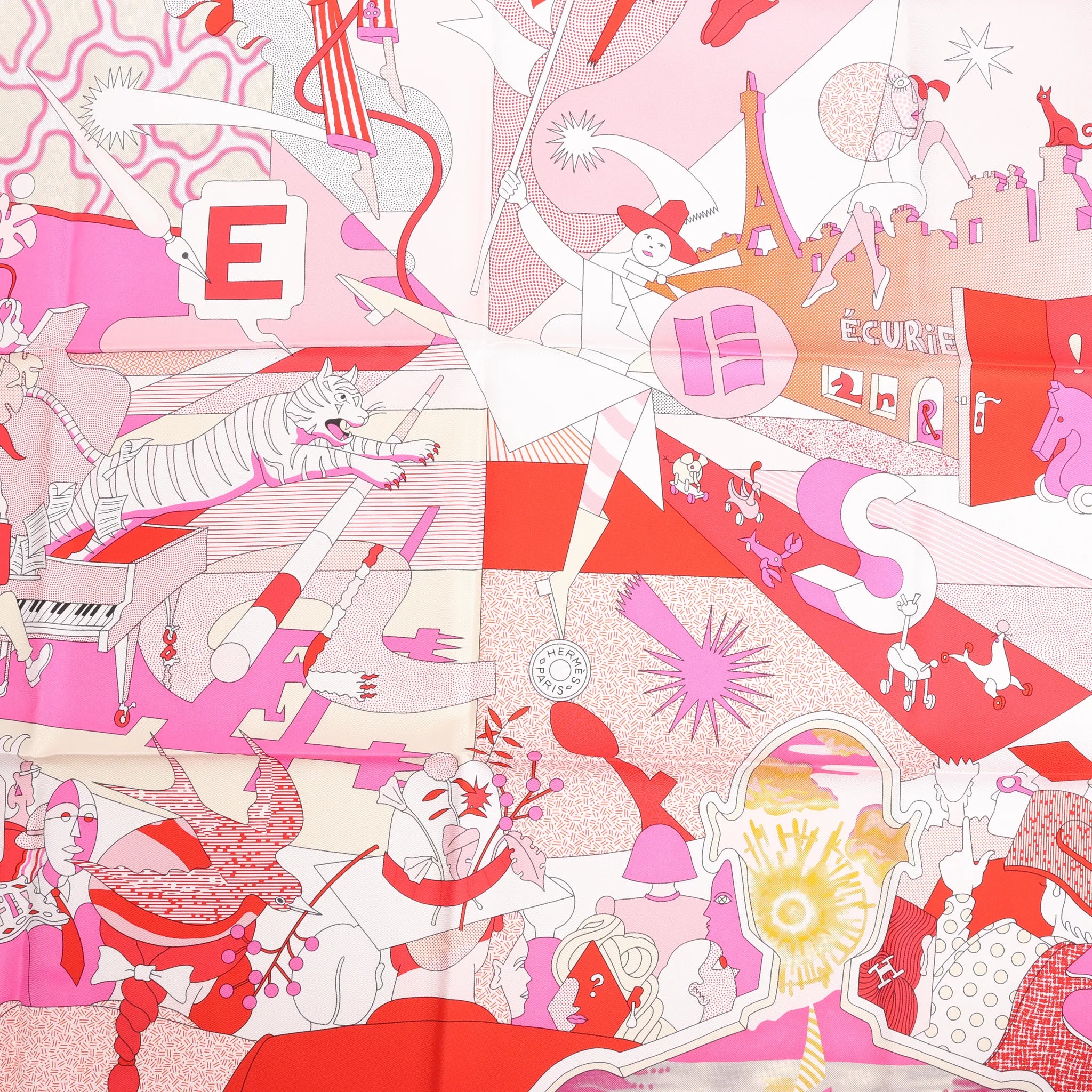 The Hermès Carré 90 "Ça Décoiffe" silk scarf in pink bursts with whimsical energy and surrealist flair. Designed with playful illustrations in vibrant shades of pink, red, and white, this luxurious silk twill scarf captures a lively Parisian fantasy filled with movement and imagination.