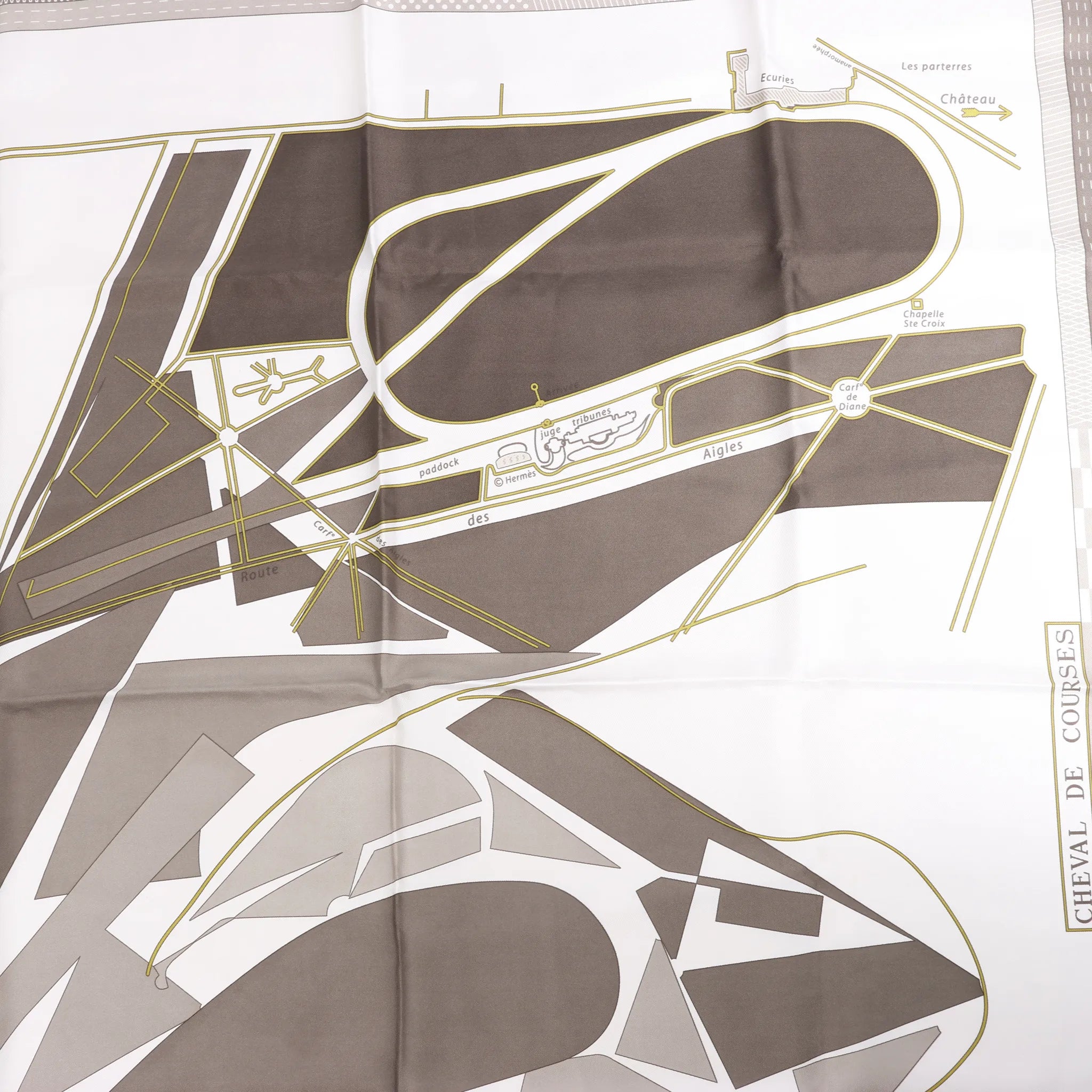 The Hermès Carré 90 "CHEVAL DE COURSES" silk handkerchief in gray showcases a modern equestrian design crafted in luxurious silk. Featuring abstract racehorse and track motifs, this piece is a refined tribute to the elegance of horse racing.