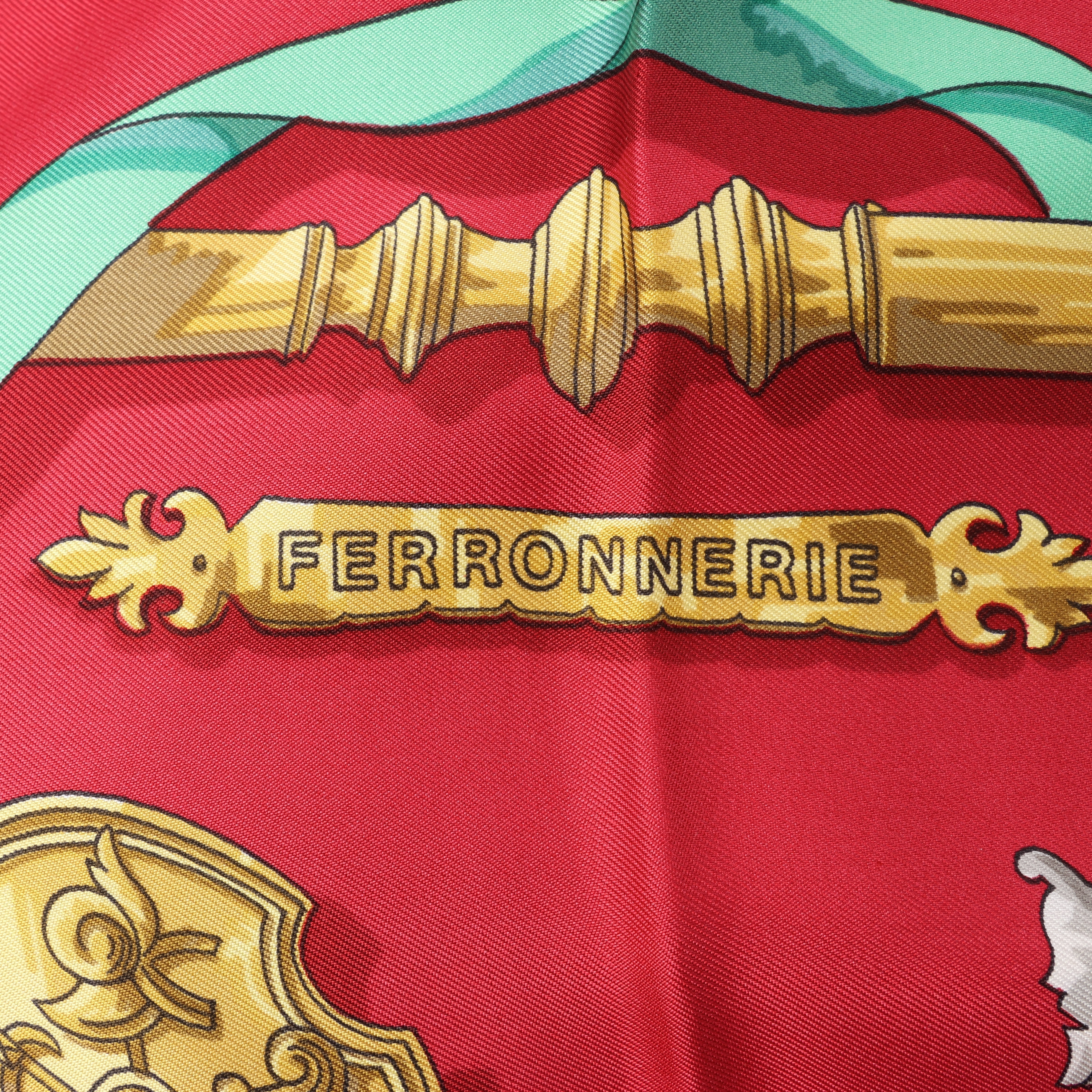 Hermès Carré 90 "Ferronnerie" scarf in vibrant red silk showcases ornate gold and silver ironwork motifs with green ribbon accents. Crafted from 100% silk, this timeless piece reflects the elegance of classic craftsmanship and luxurious design.
