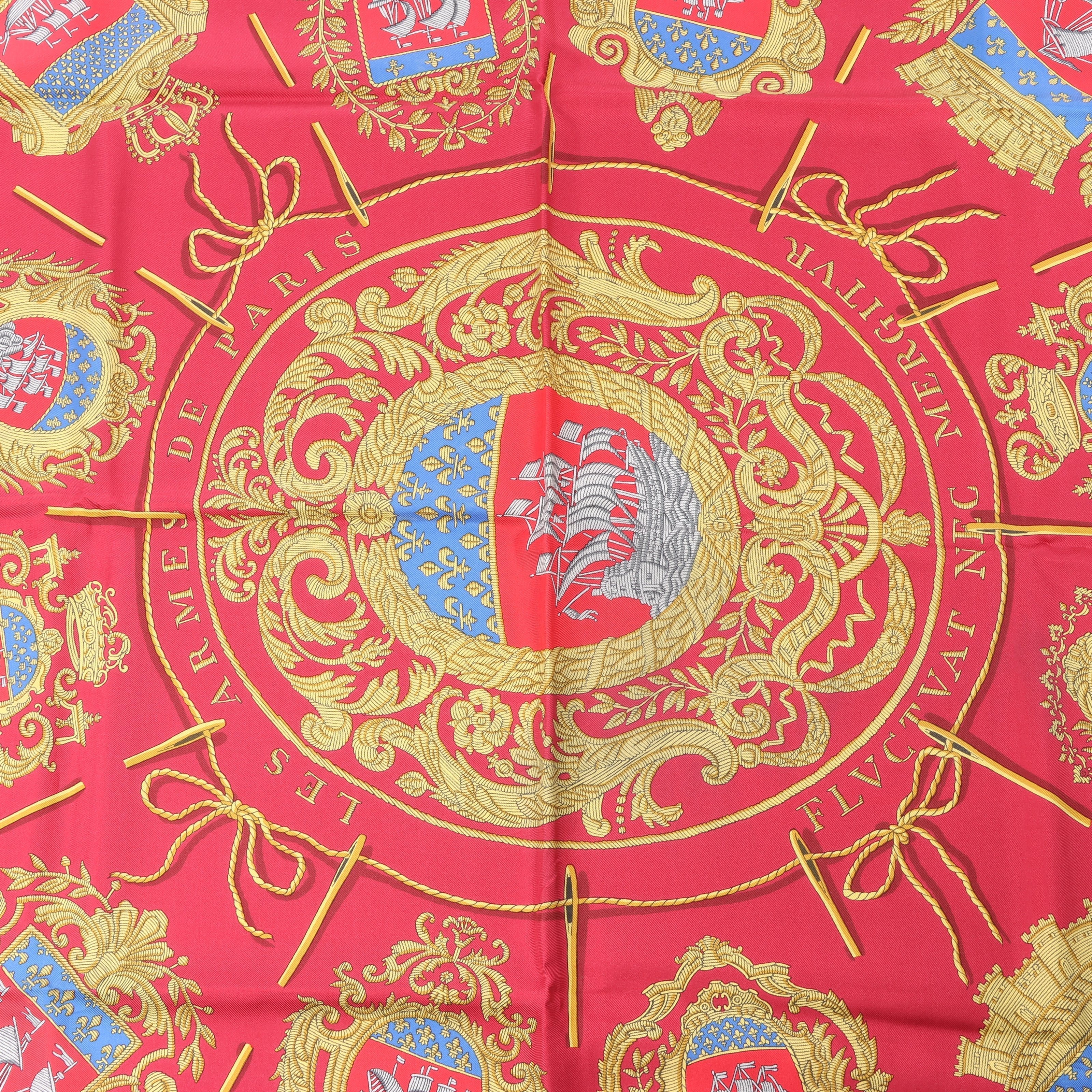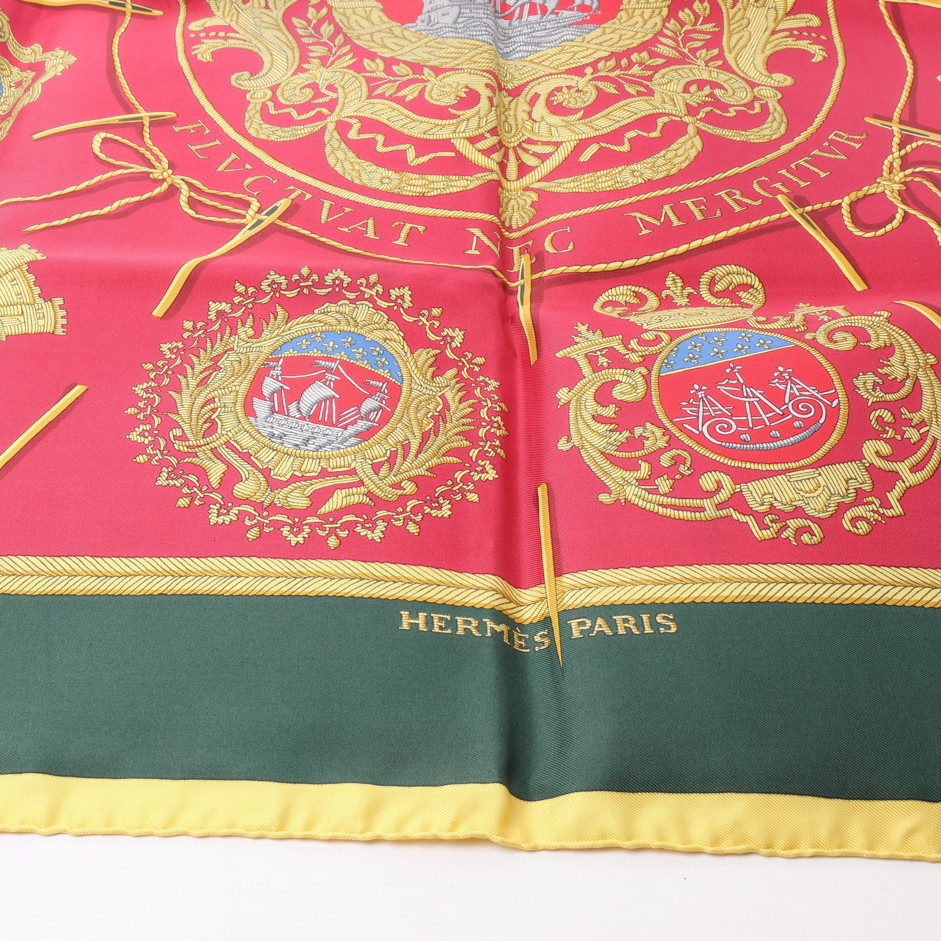 Hermès Carré 90 “FLVCTVAT NEC MERGITVR” scarf in 100% silk, featuring a regal green and red palette with gold heraldic emblems. A tribute to Parisian heritage, this timeless design exudes elegance and historical richness.