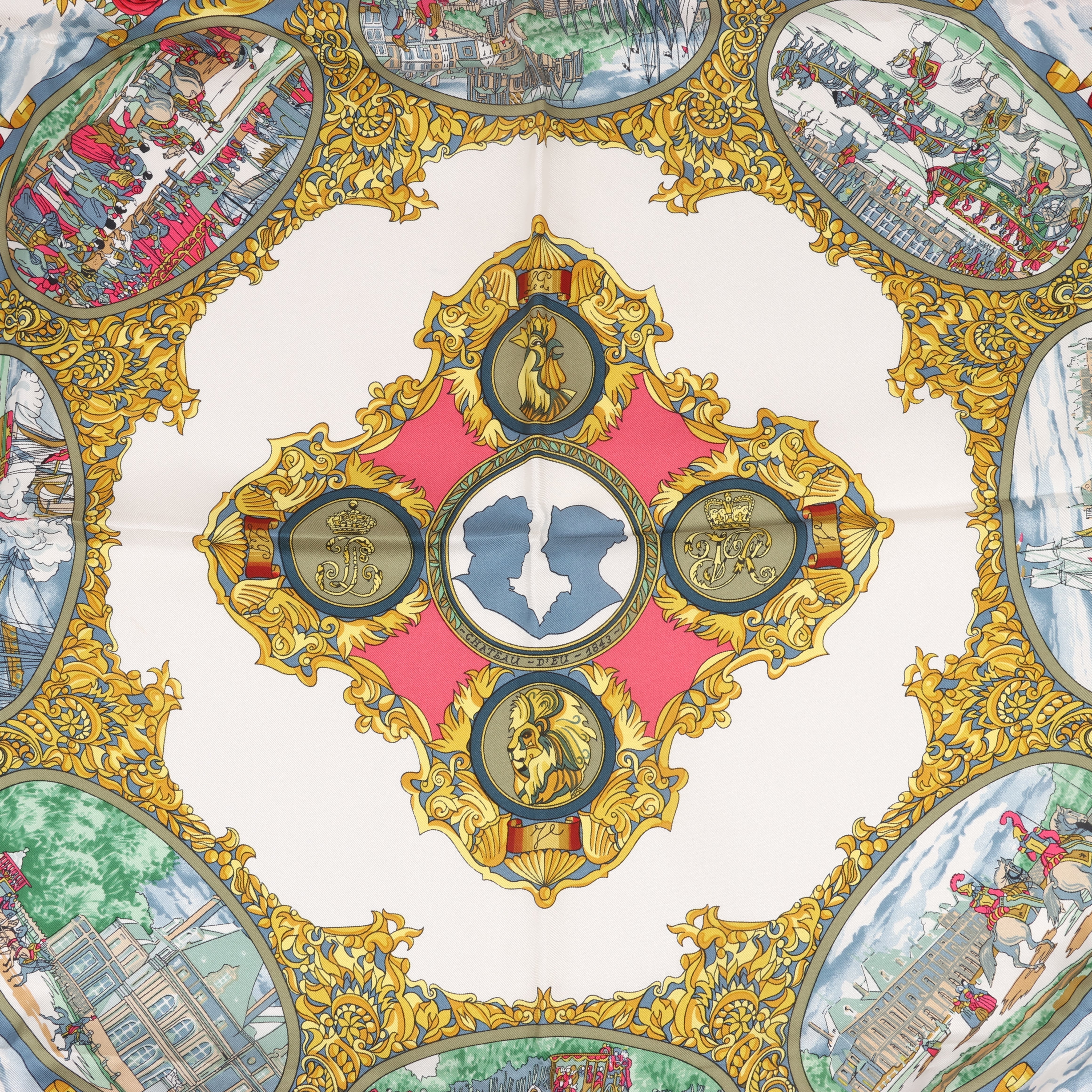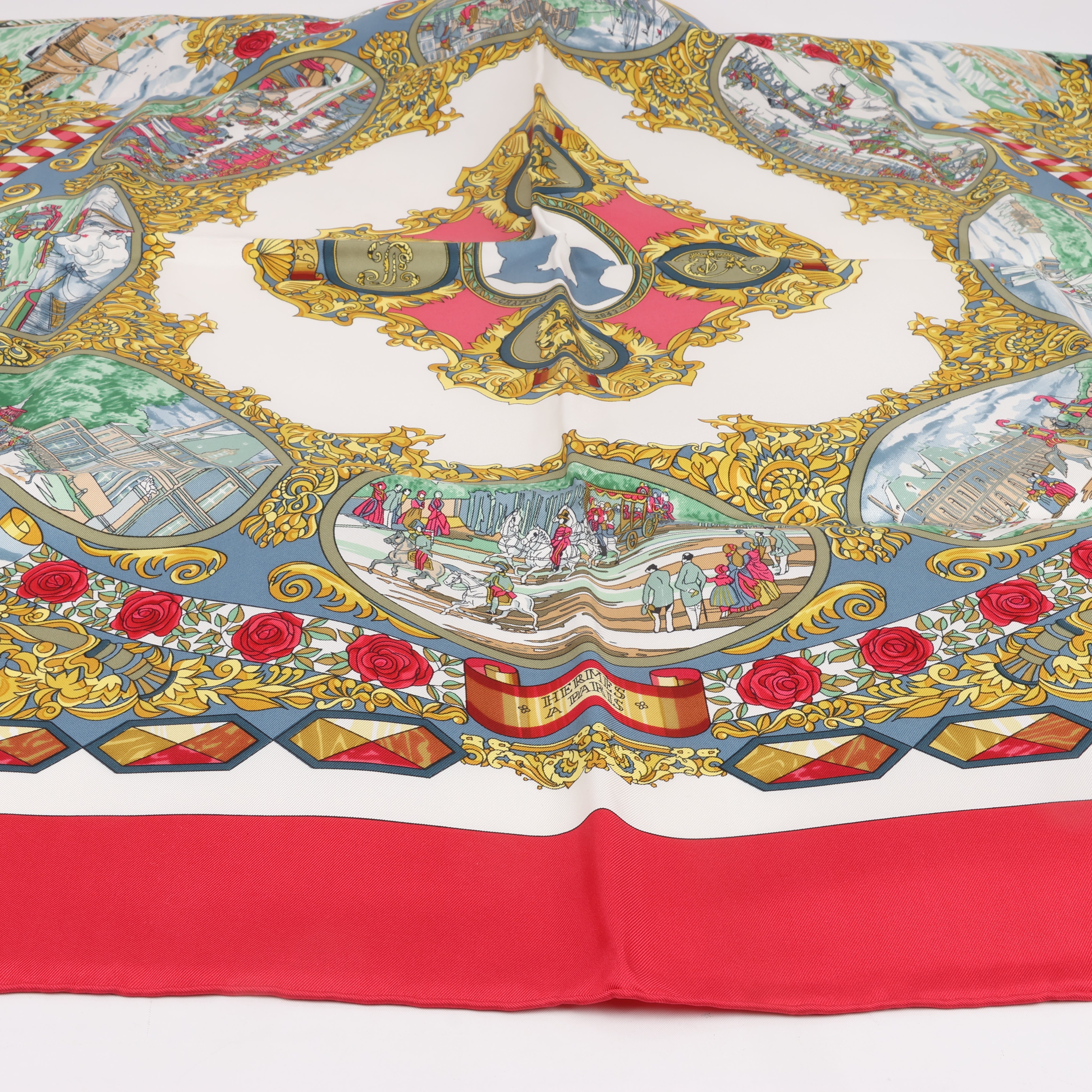 Hermès Carré 90 "L’Entente Cordiale" silk scarf. Crafted from 100% silk, this exquisite design features intricate historical motifs framed by rich red, gold, and blue detailing. A timeless collectible that embodies elegance and heritage.