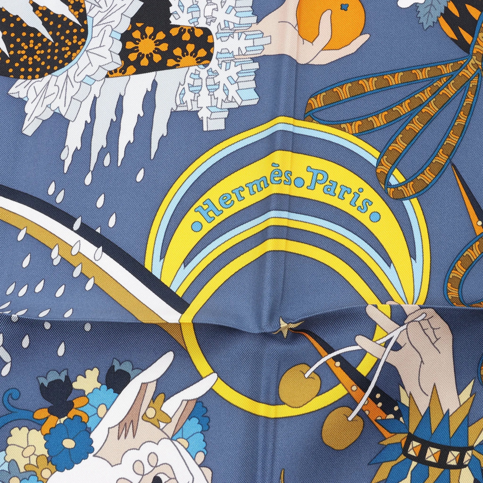Celebrate nature’s rhythm with the Hermès Carré 90 "Le Sacre des Saisons" scarf in gray. Crafted from 100% silk, this stunning piece showcases mythical creatures and seasonal motifs in rich blue, gold, and orange tones—perfect for year-round elegance.