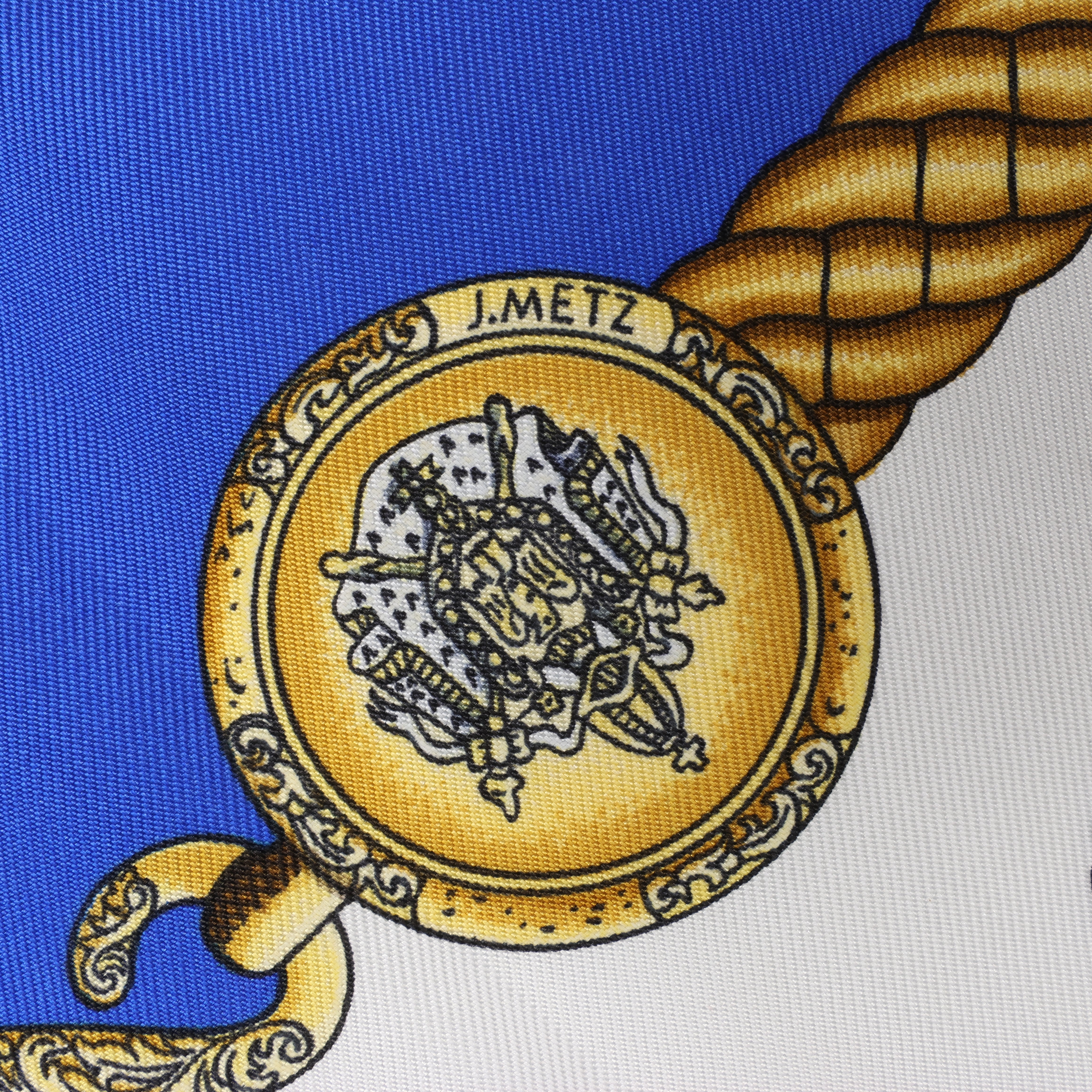 Hermès Carré 90 "Les Tambours" scarf in vibrant blue silk features regal drums, cords, and military motifs in rich red, gold, and navy tones. Crafted from 100% silk, this striking piece echoes ceremonial elegance and timeless luxury.