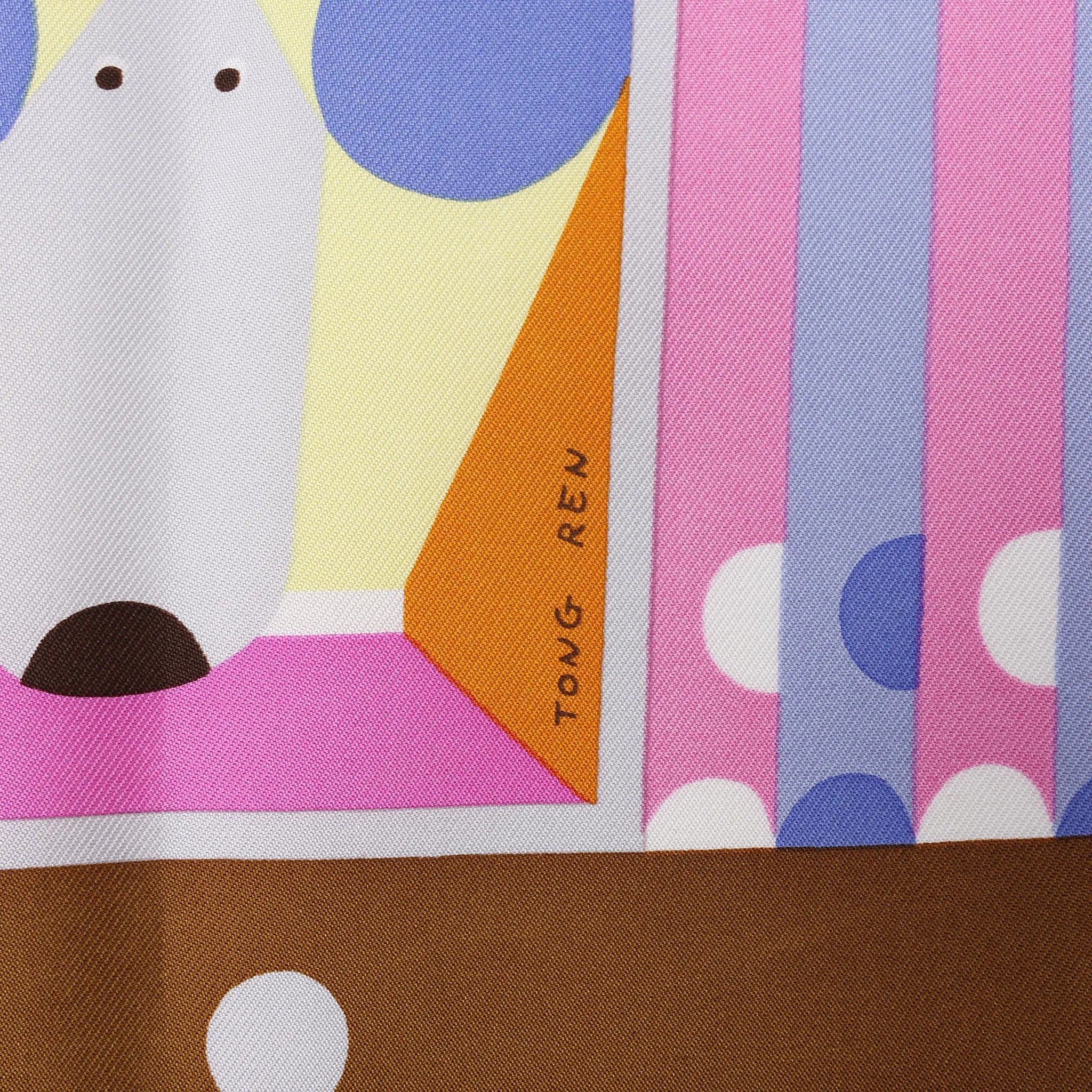 Add a bold pop of color with the Hermès Carré 90 "Parade en Fanfare" in purple. Made from pure silk, this vibrant scarf features a geometric animal parade in playful pink, yellow, and orange tones—perfect for artistic expression and standout style.