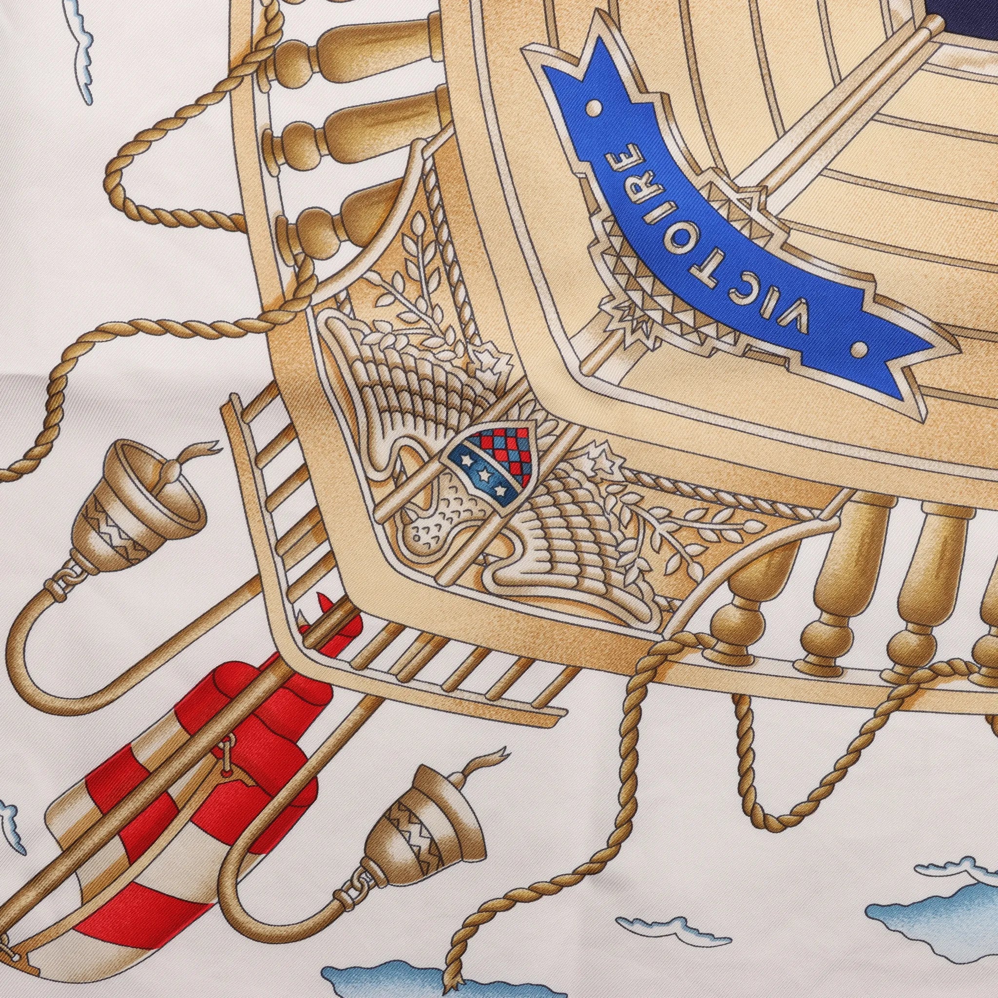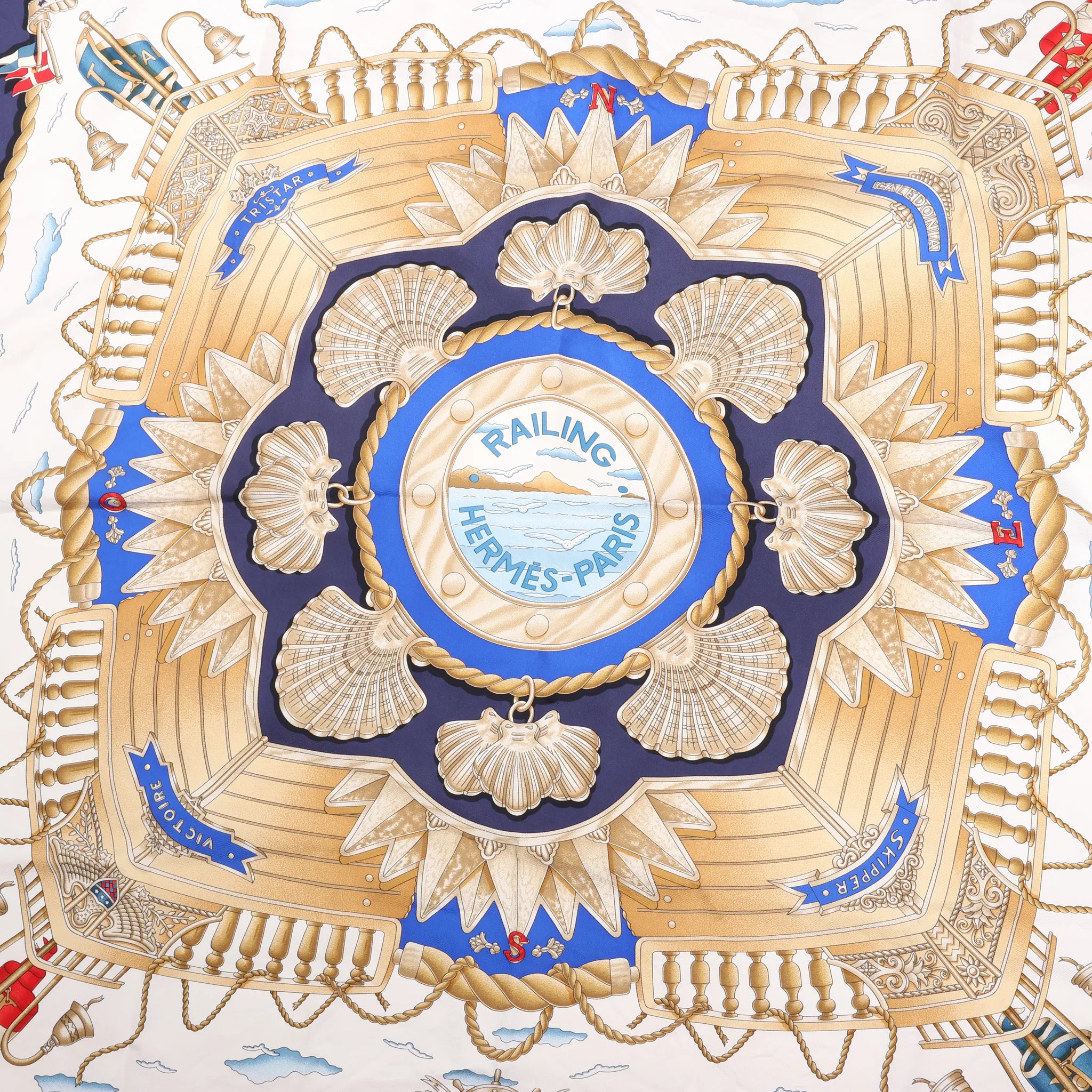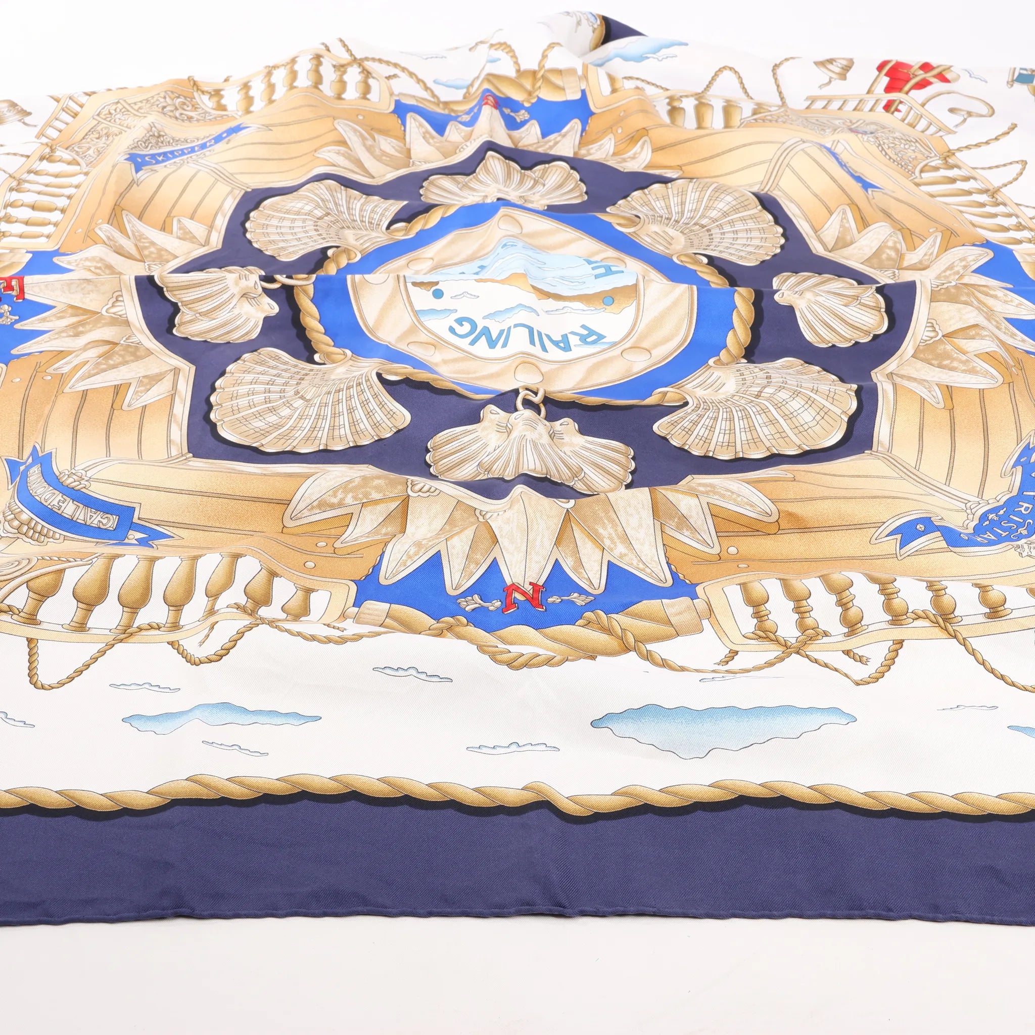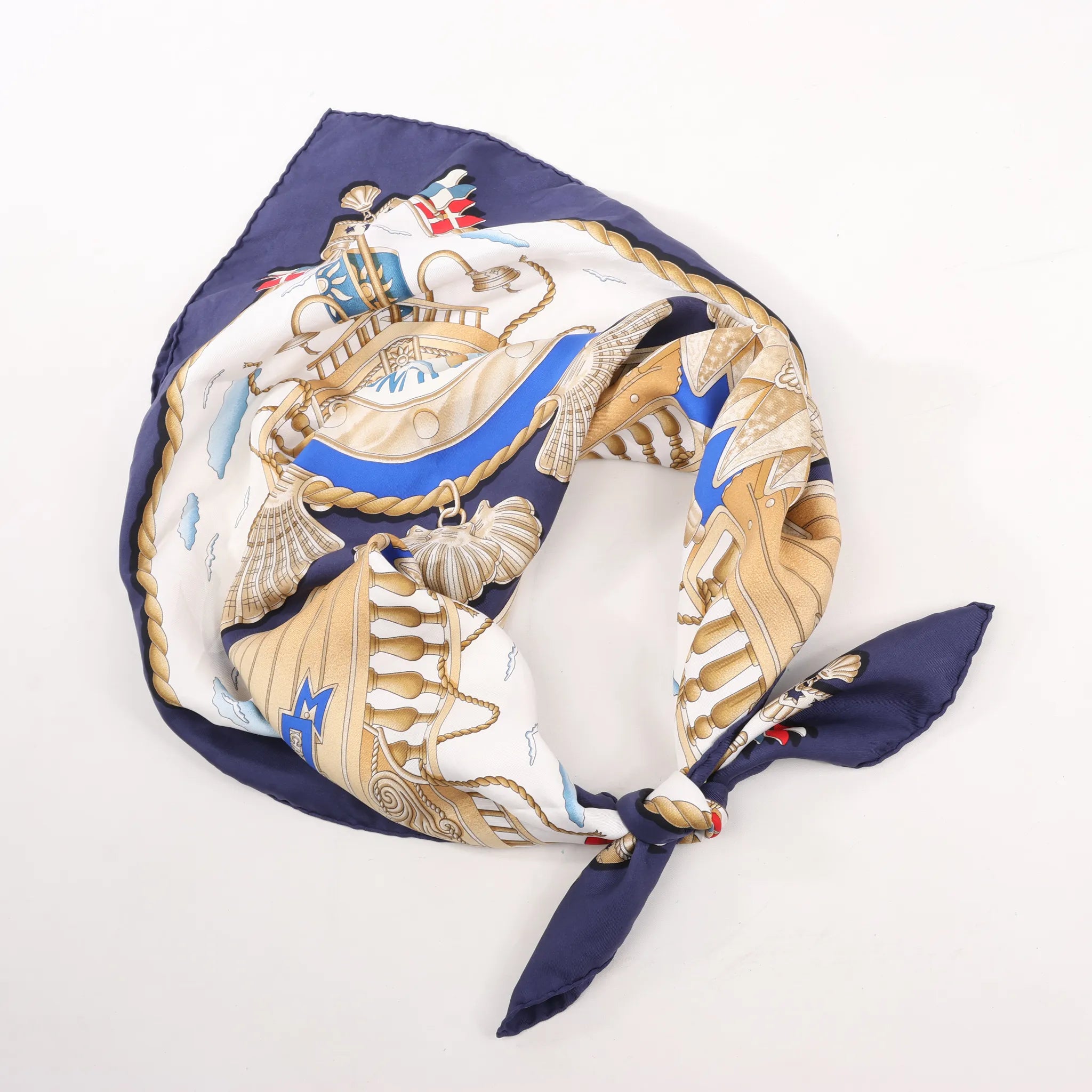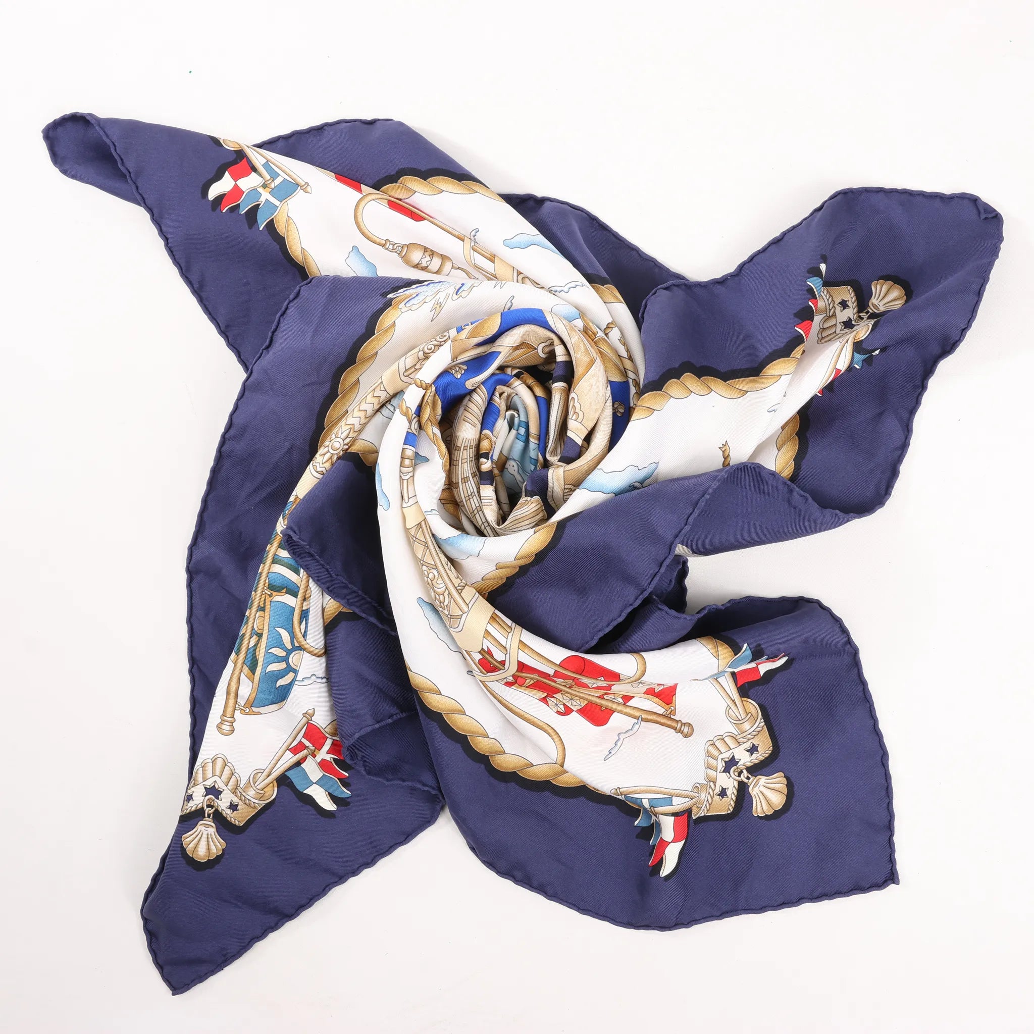 Add a touch of nautical luxury with the Hermès Carré 90 "RAILING" Silk Handkerchief in Navy Blue. Made from 100% silk, this intricately illustrated square scarf showcases maritime motifs and timeless craftsmanship—ideal for refined accessorizing.