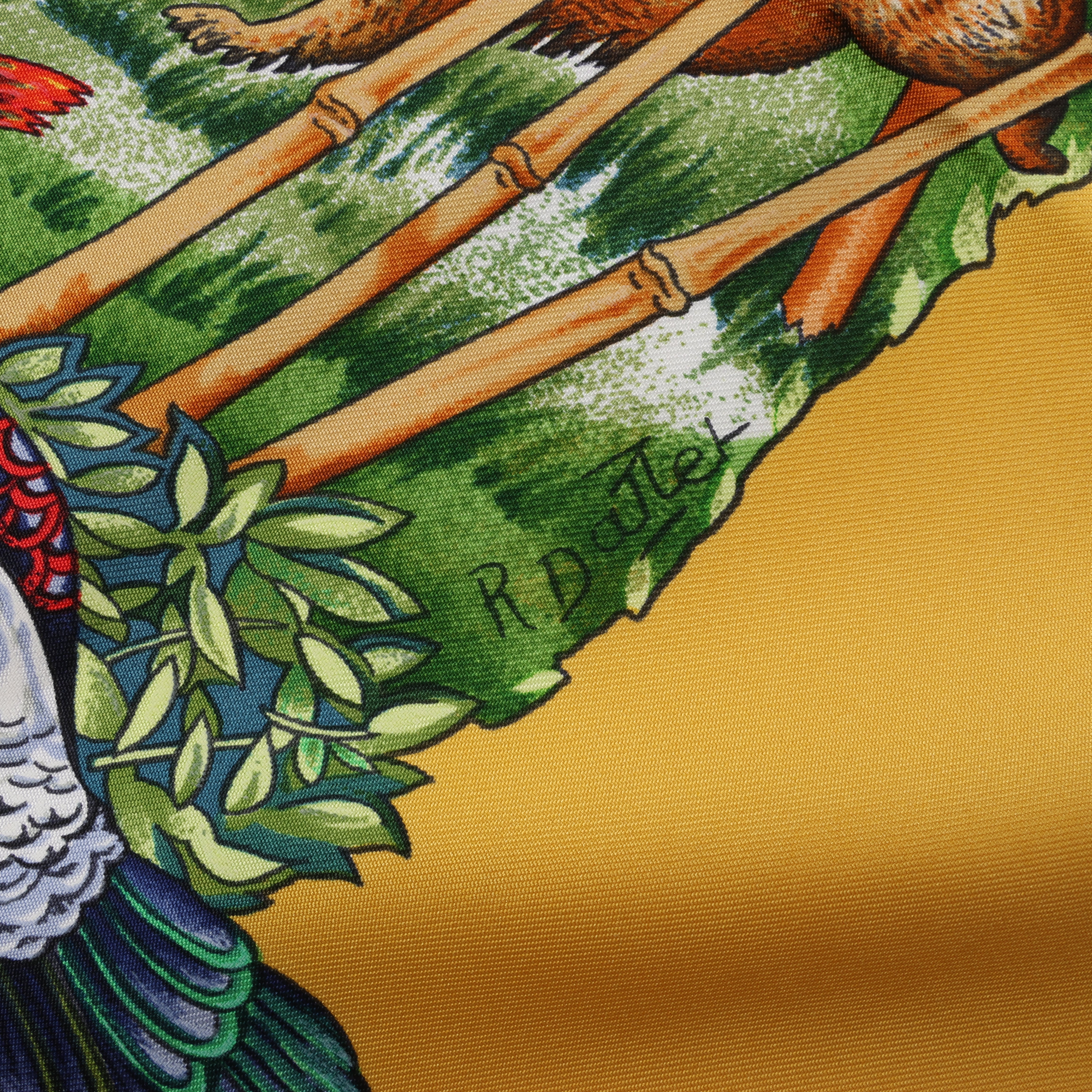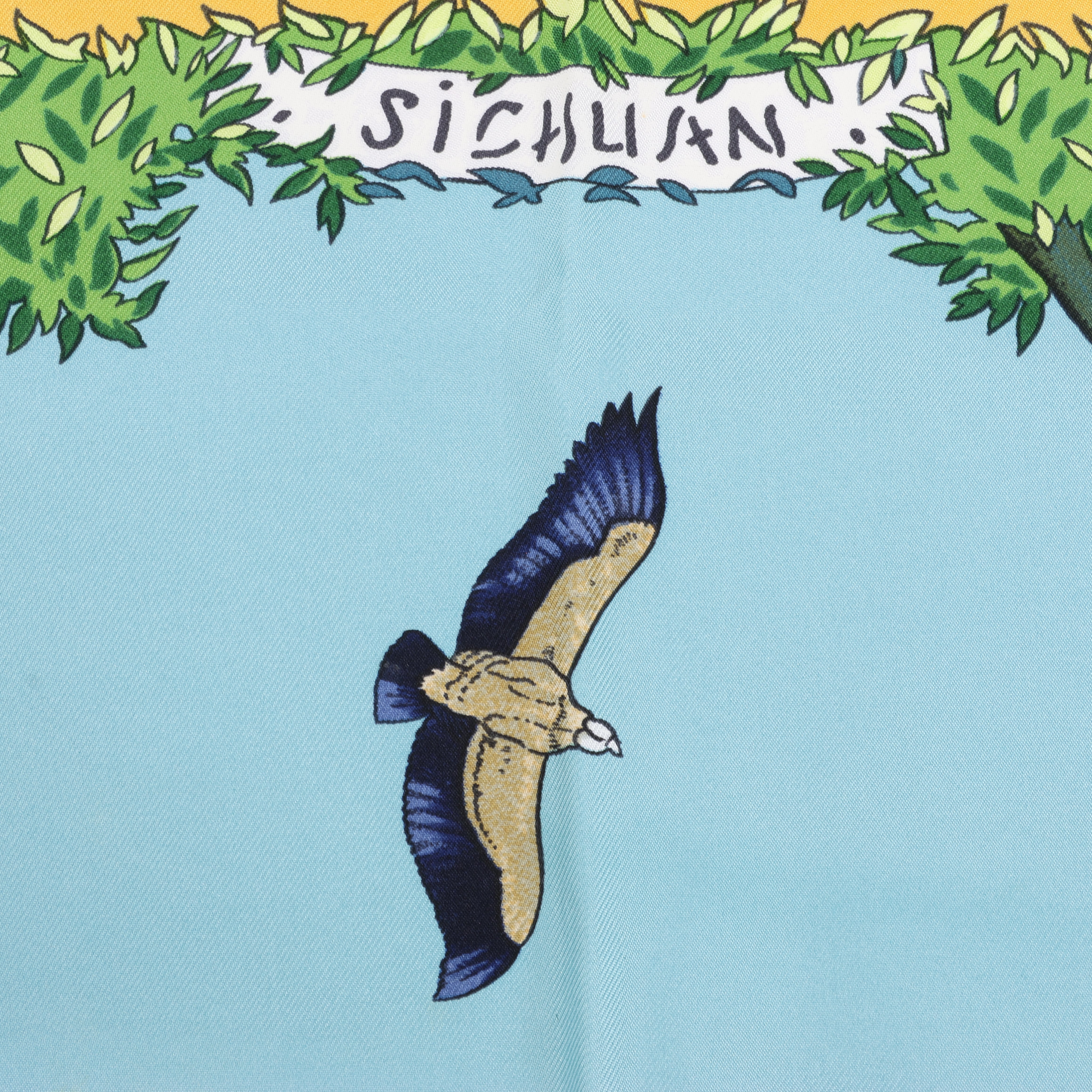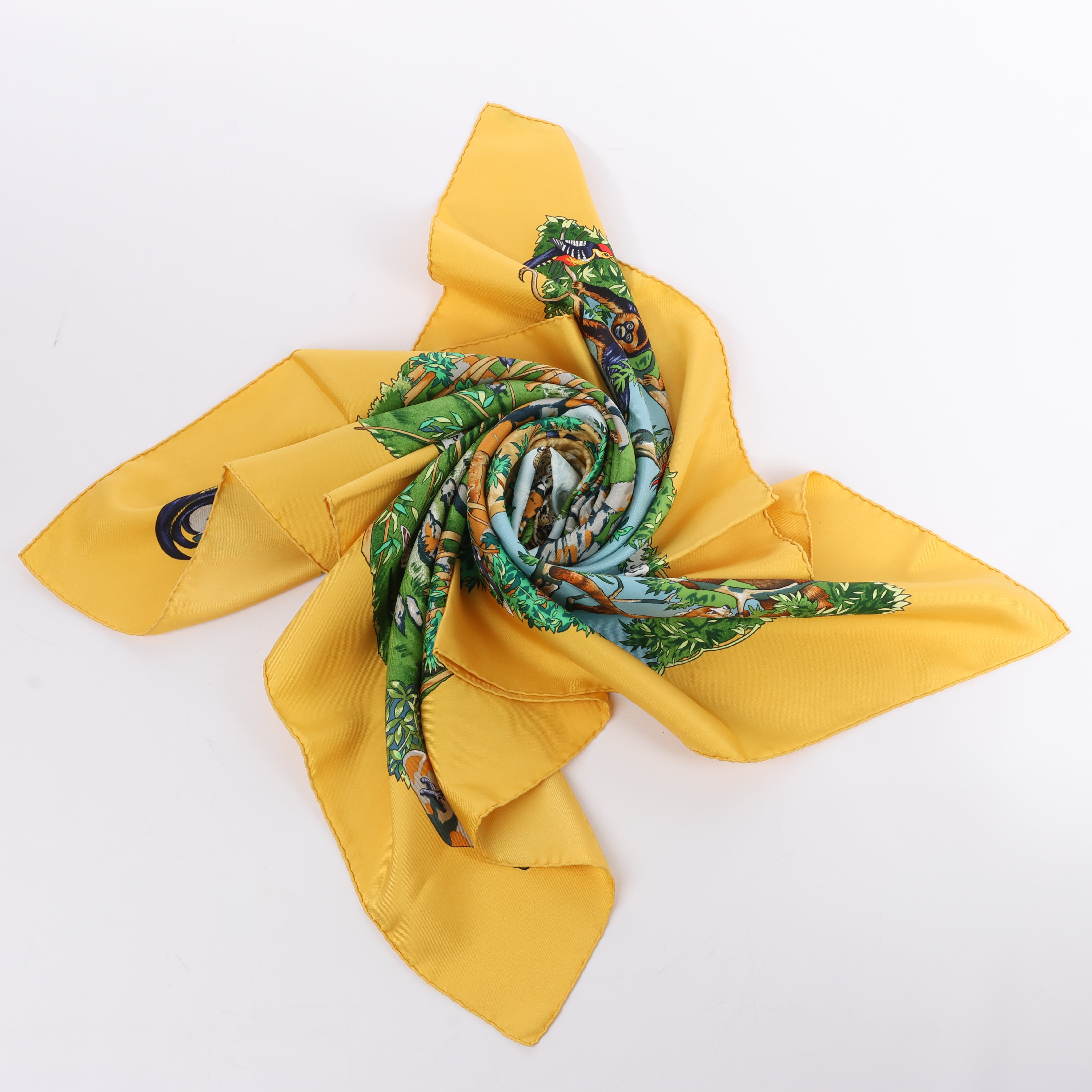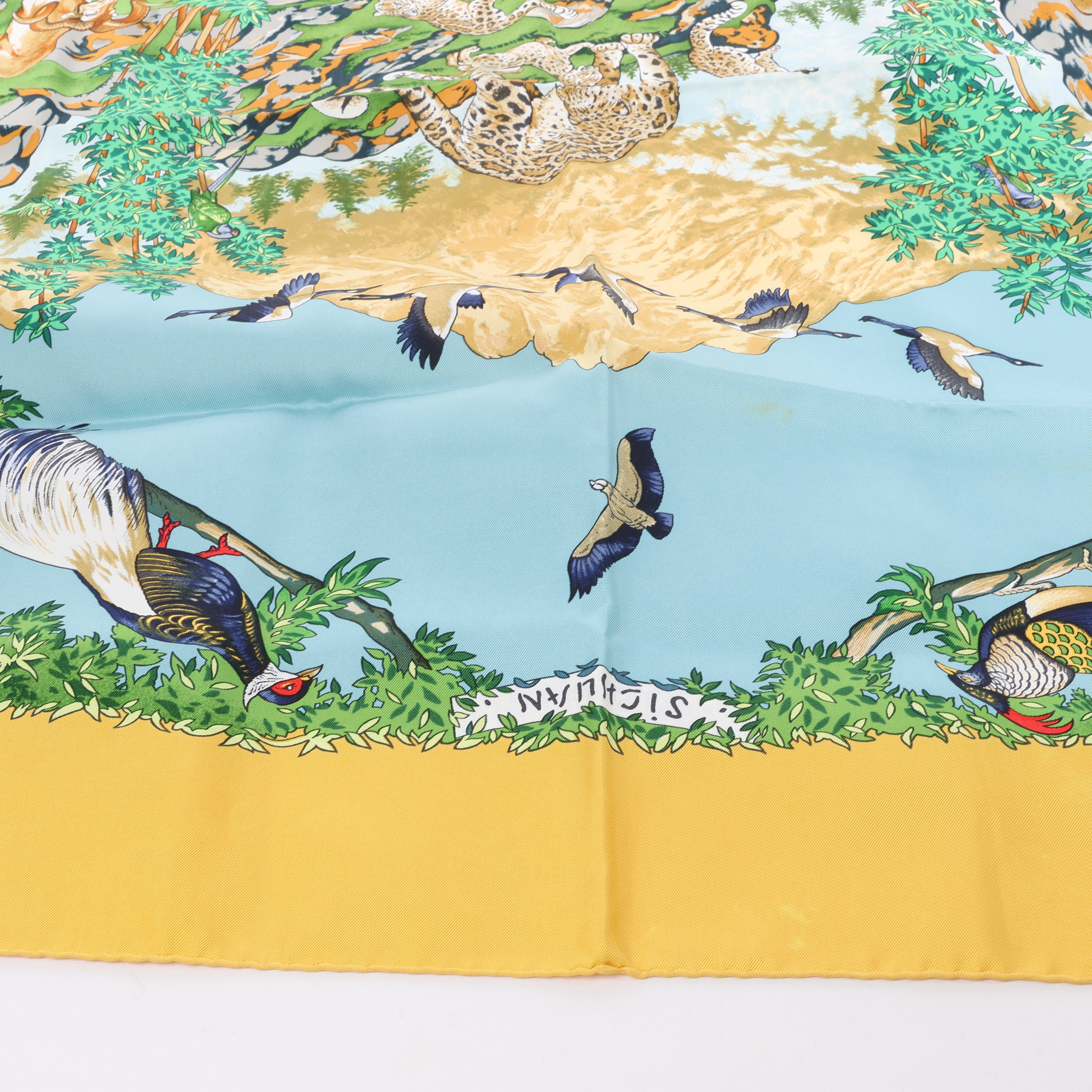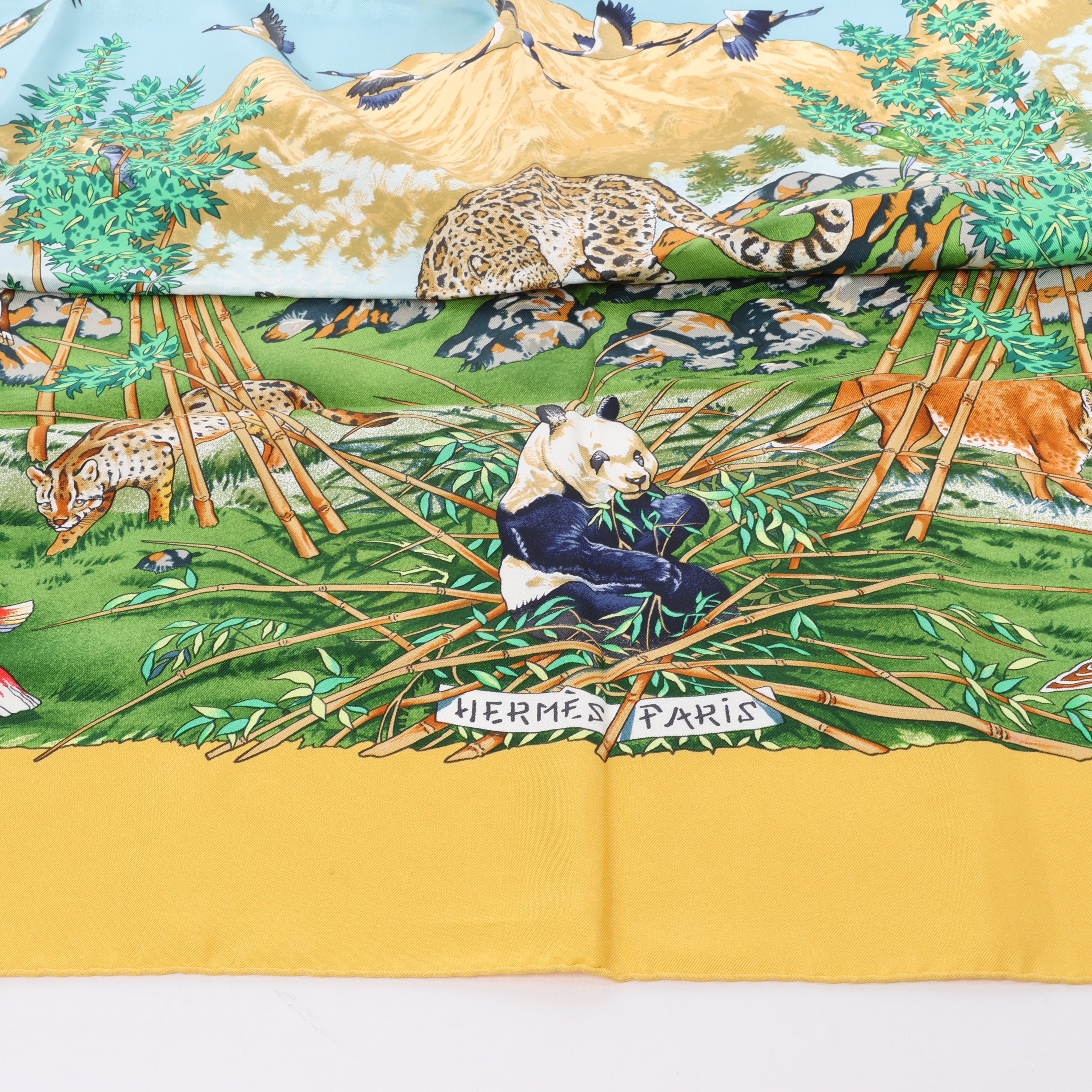 Hermès Carré 90 "Sichuan" silk scarf in yellow captures the lush beauty of China's Sichuan province with vivid wildlife, majestic leopards, and soaring birds. A celebration of nature framed in golden warmth and intricate detail.