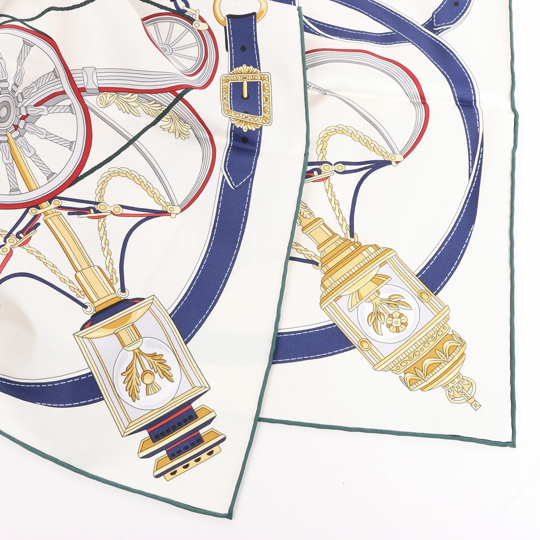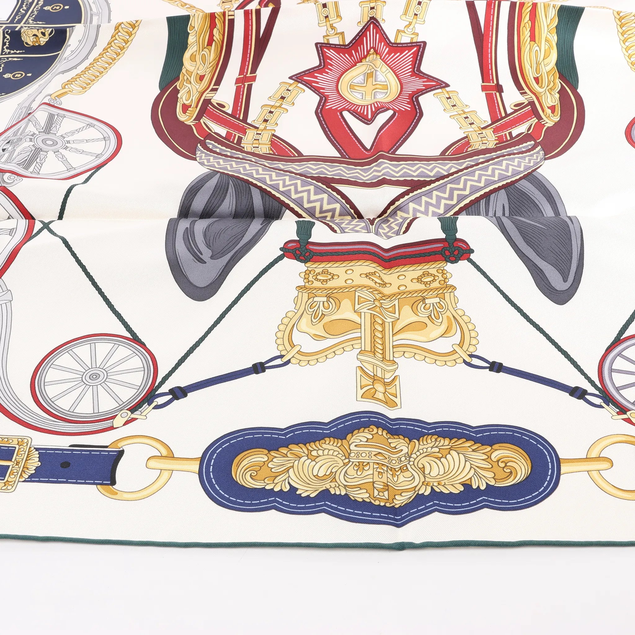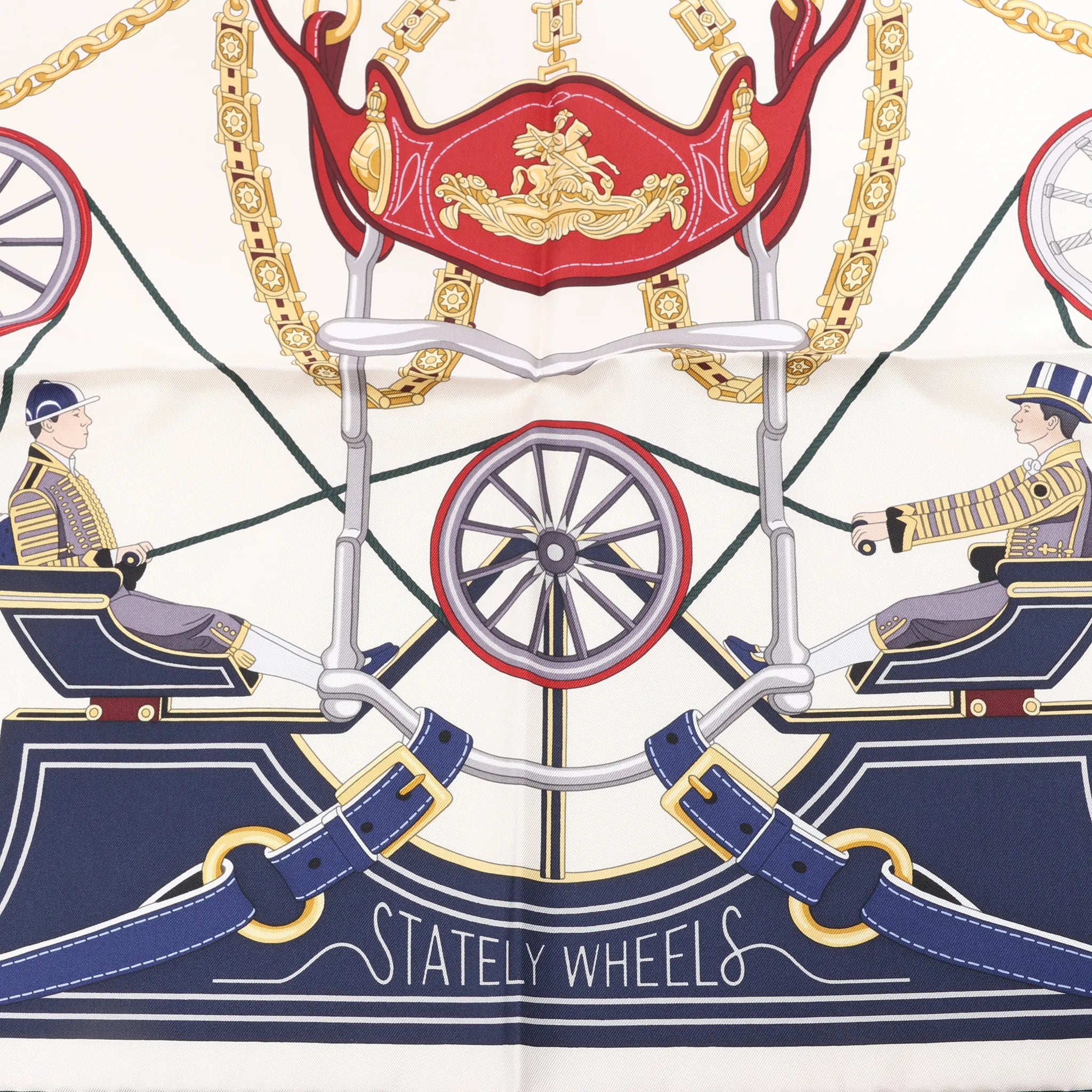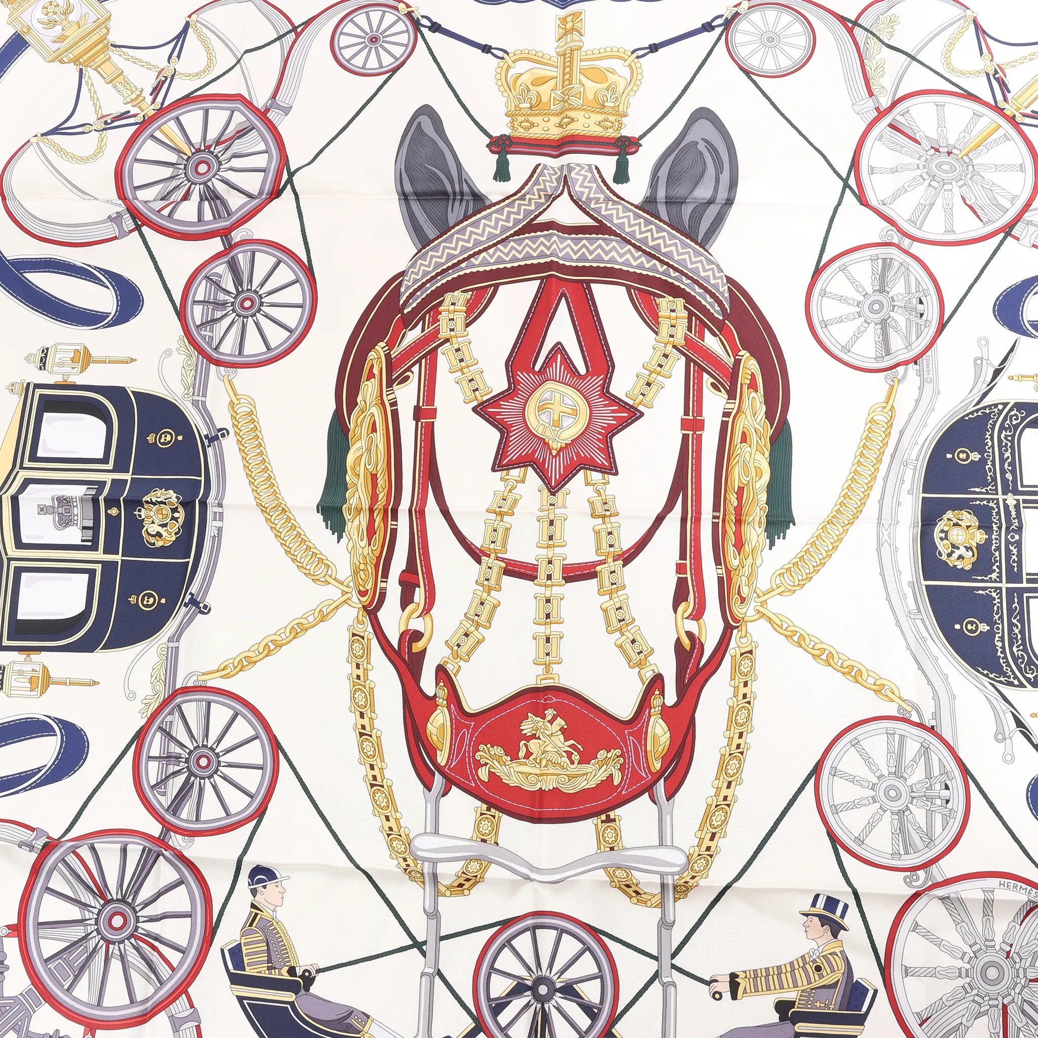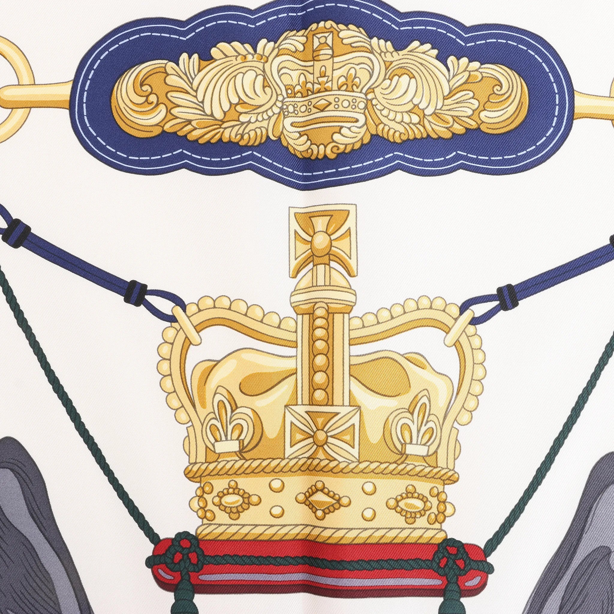 Celebrate regal elegance with the Hermès Carré 90 "Stately Wheels" silk handkerchief in ecru and blue. Crafted from luxurious silk, this scarf showcases intricate carriage and harness motifs, evoking the grandeur of ceremonial tradition with timeless sophistication.