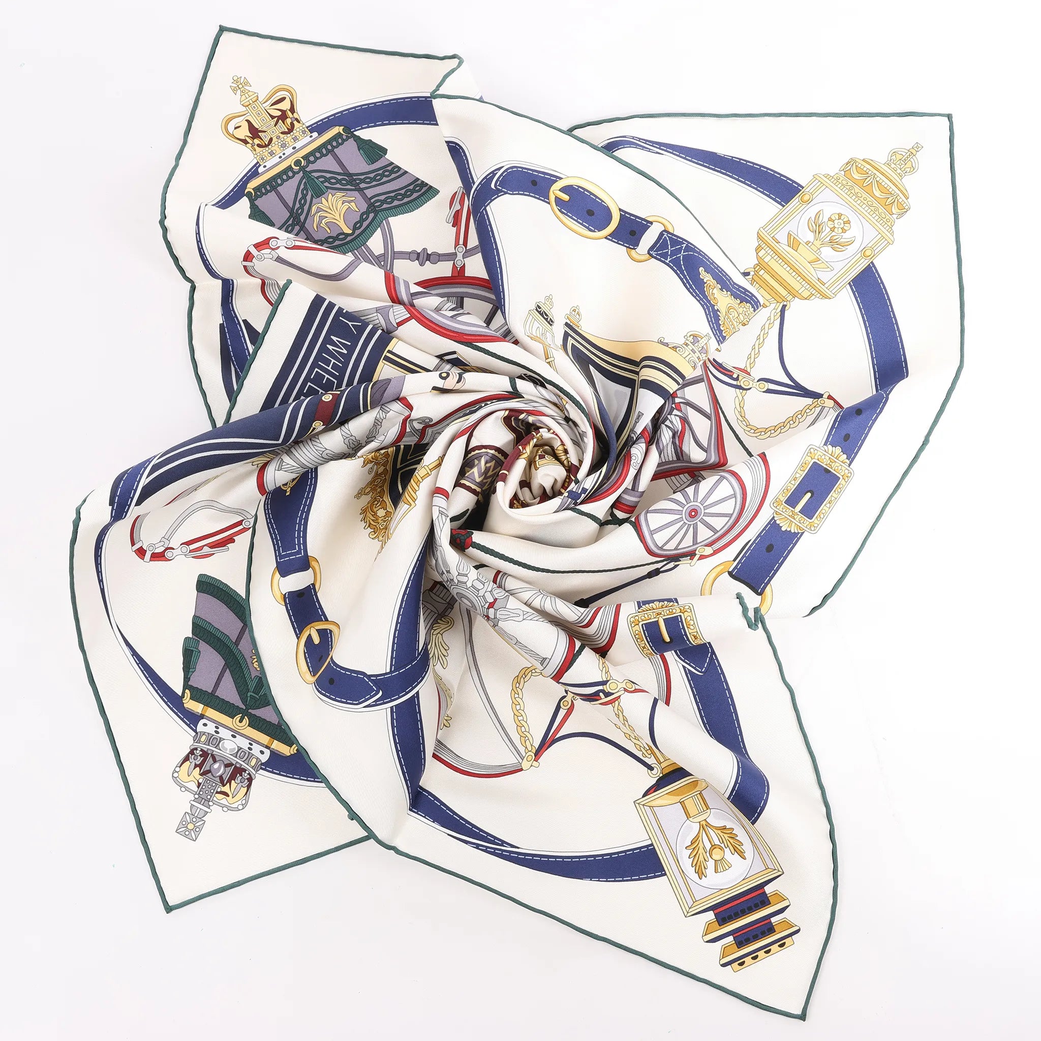 Hermès Carré 90 "STATELY WHEELS" Silk handkerchief in Ecru x Blue